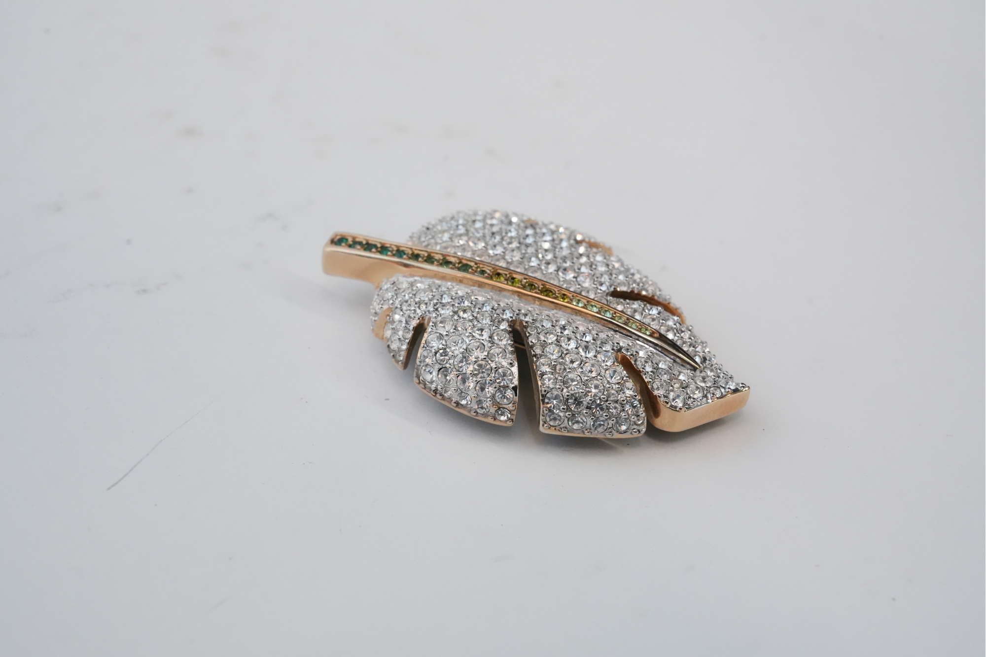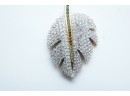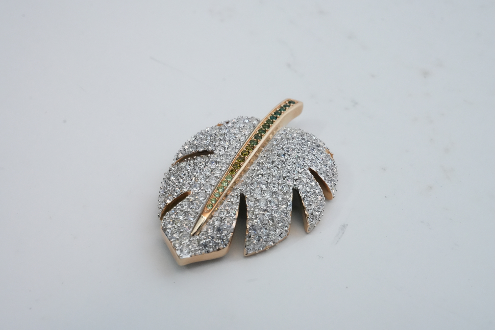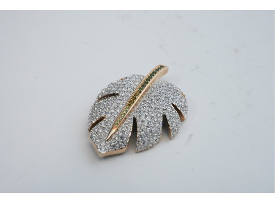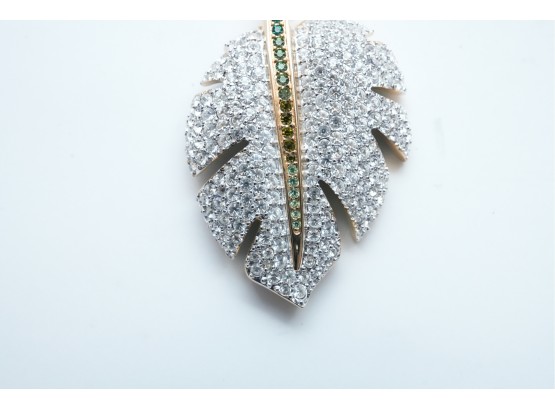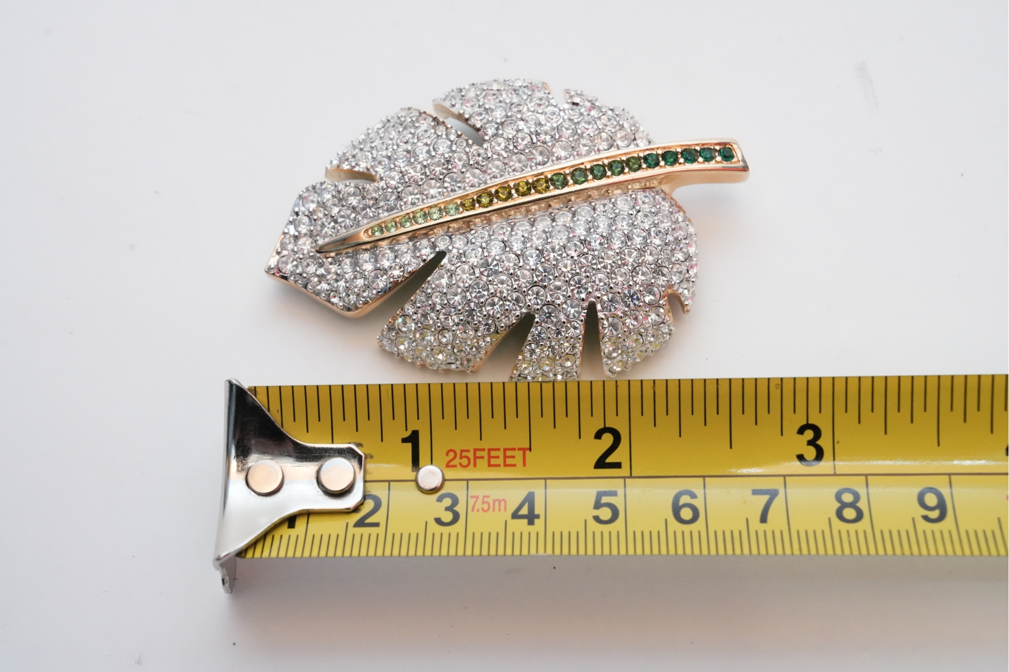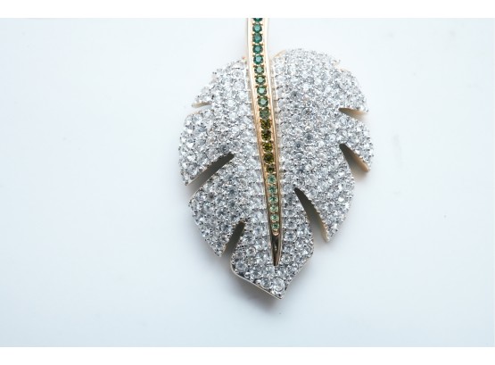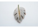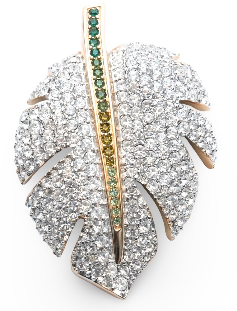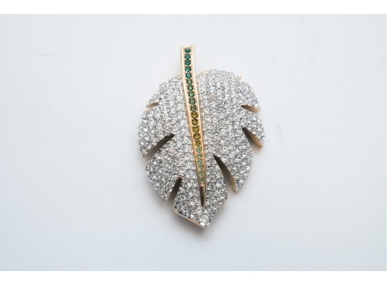 Leaf-shaped brooch in silver-tone metal, fully pavé set with clear Swarovski crystals. The center vein is accented with a vertical row of green to yellow gradient crystals set in a gold-tone channel. Dimensional design with open cut details along the leaf edges.
