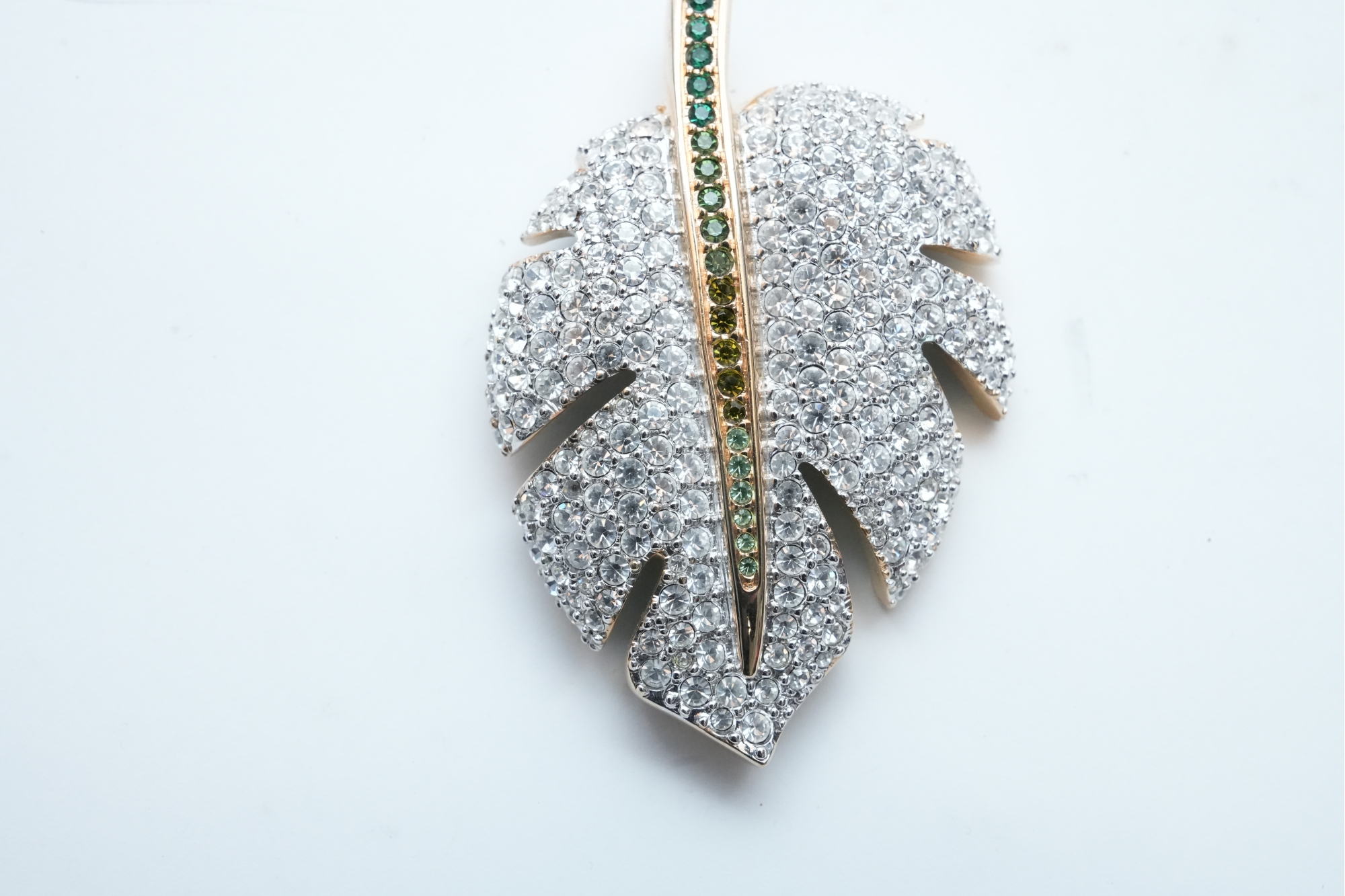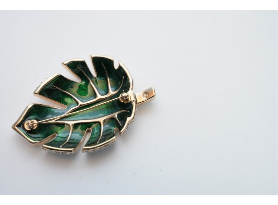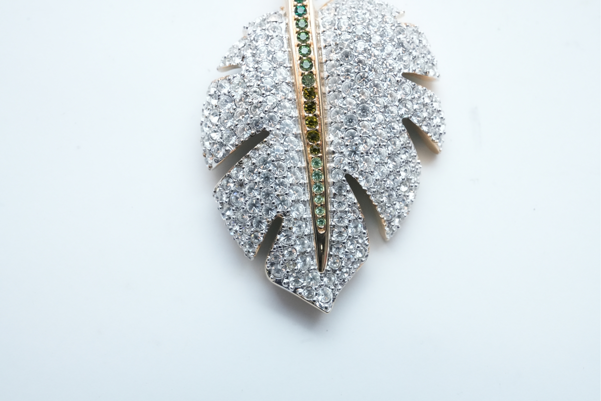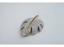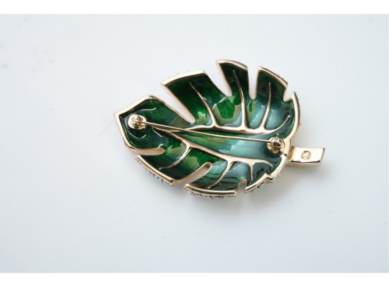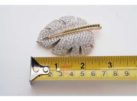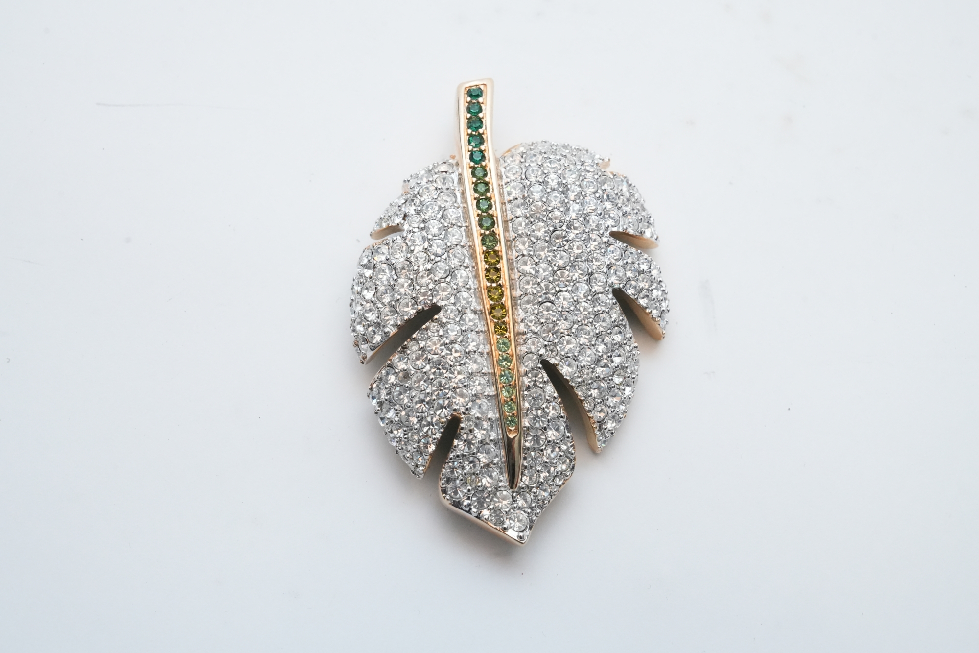 Leaf-shaped brooch in silver-tone metal, fully pavé set with clear Swarovski crystals. The center vein is accented with a vertical row of green to yellow gradient crystals set in a gold-tone channel. Dimensional design with open cut details along the leaf edges.
