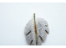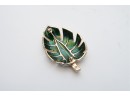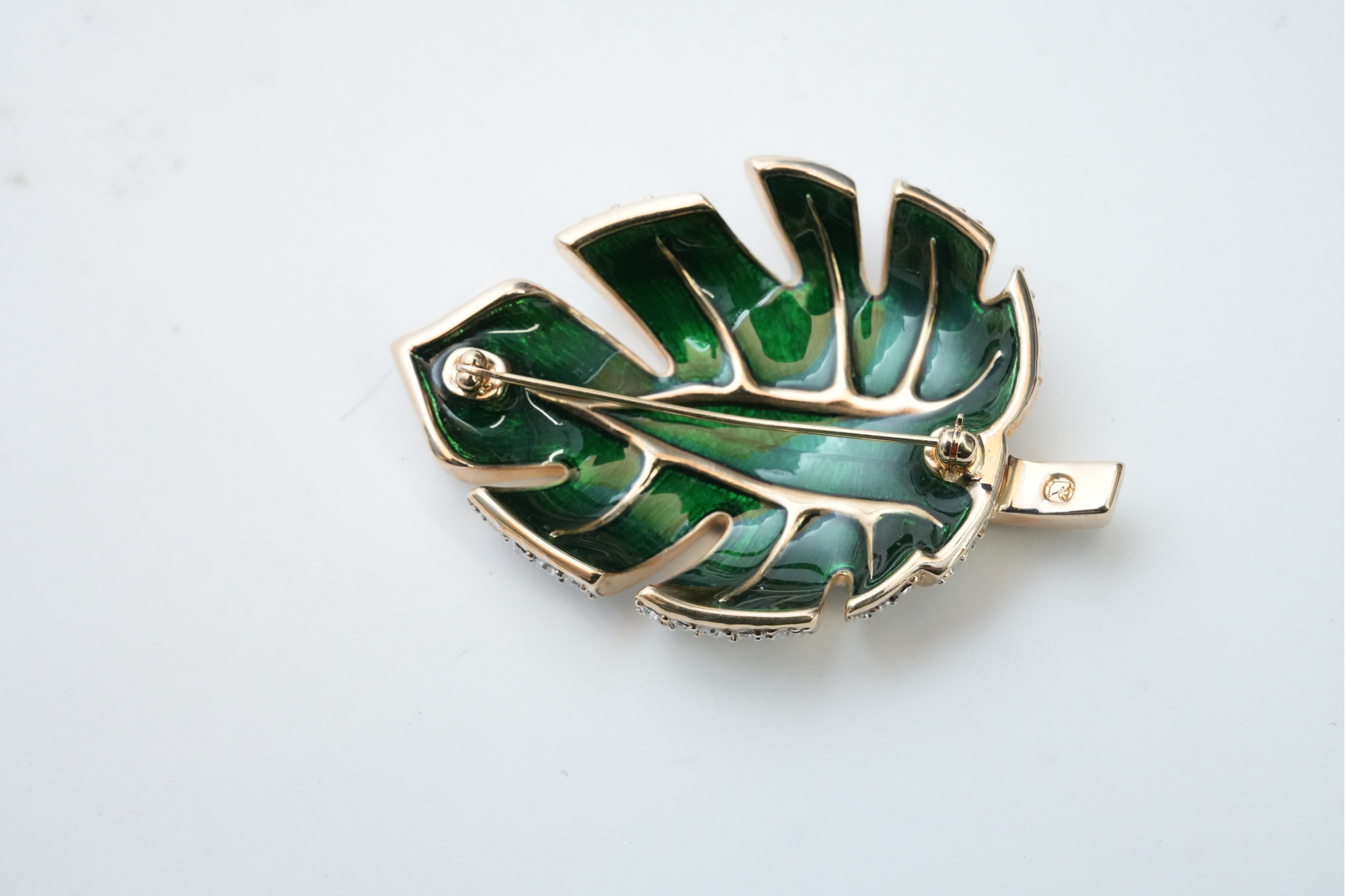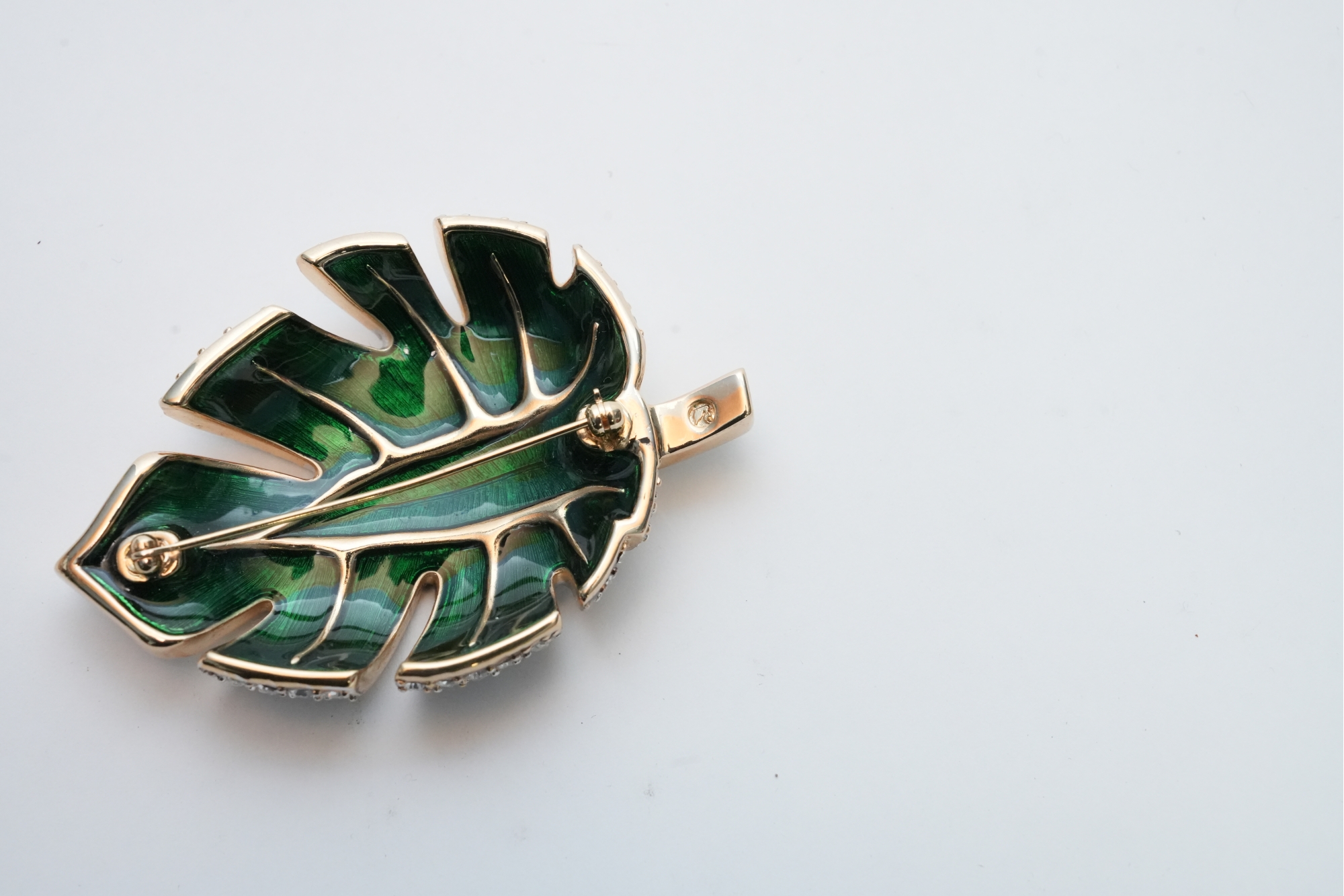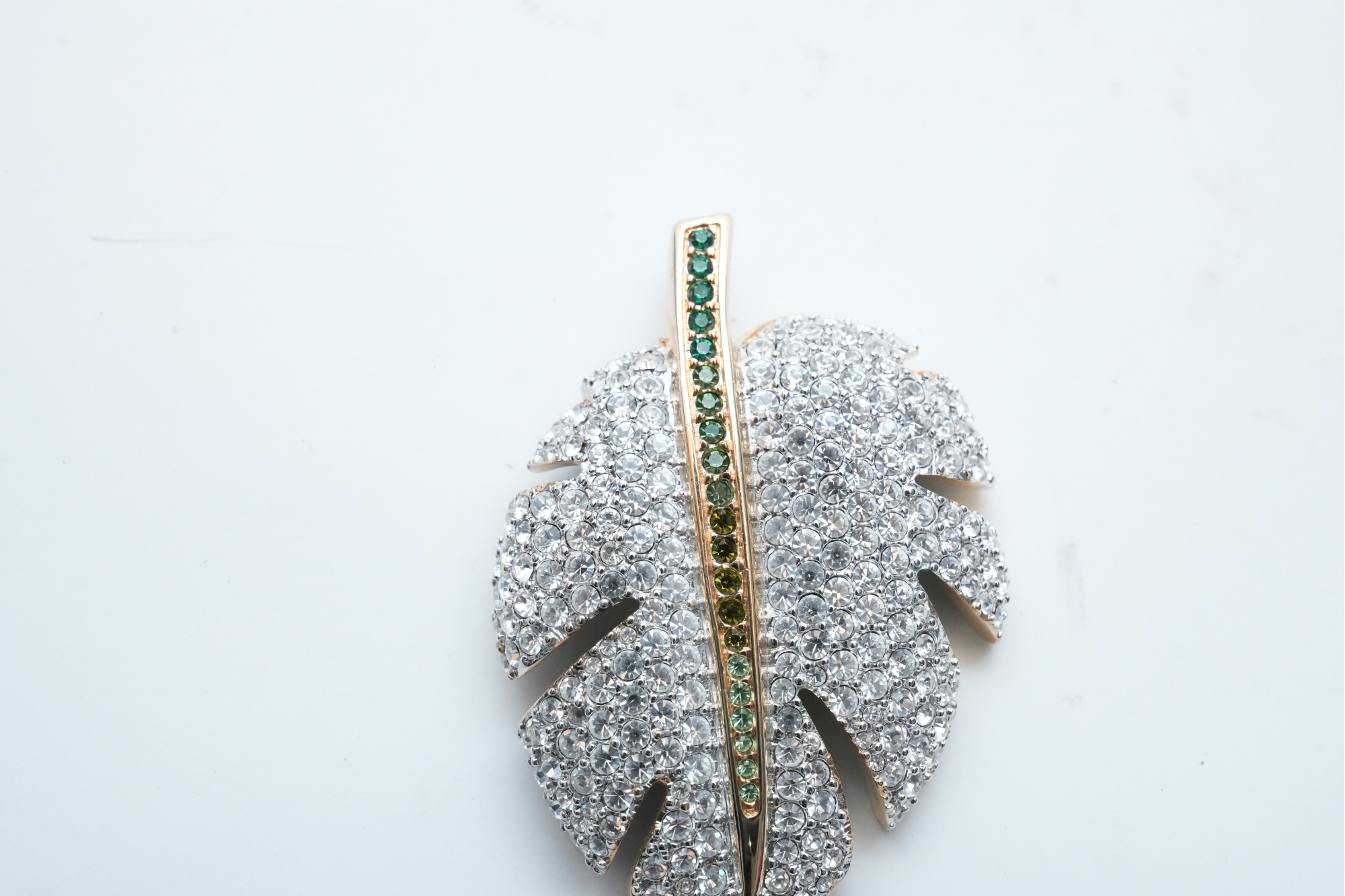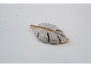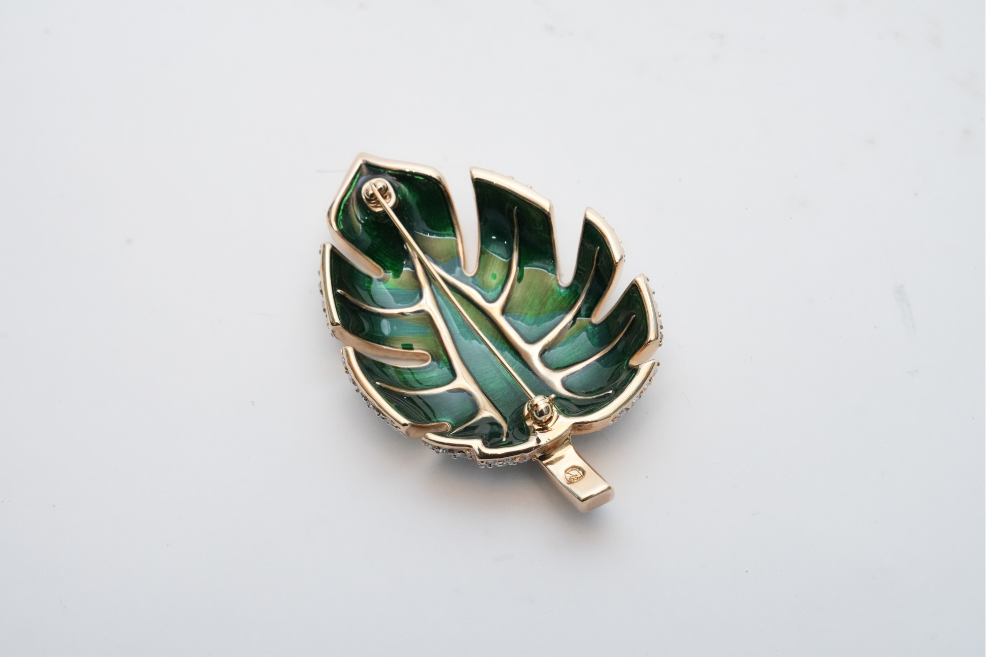 Leaf-shaped brooch in silver-tone metal, fully pavé set with clear Swarovski crystals. The center vein is accented with a vertical row of green to yellow gradient crystals set in a gold-tone channel. Dimensional design with open cut details along the leaf edges.