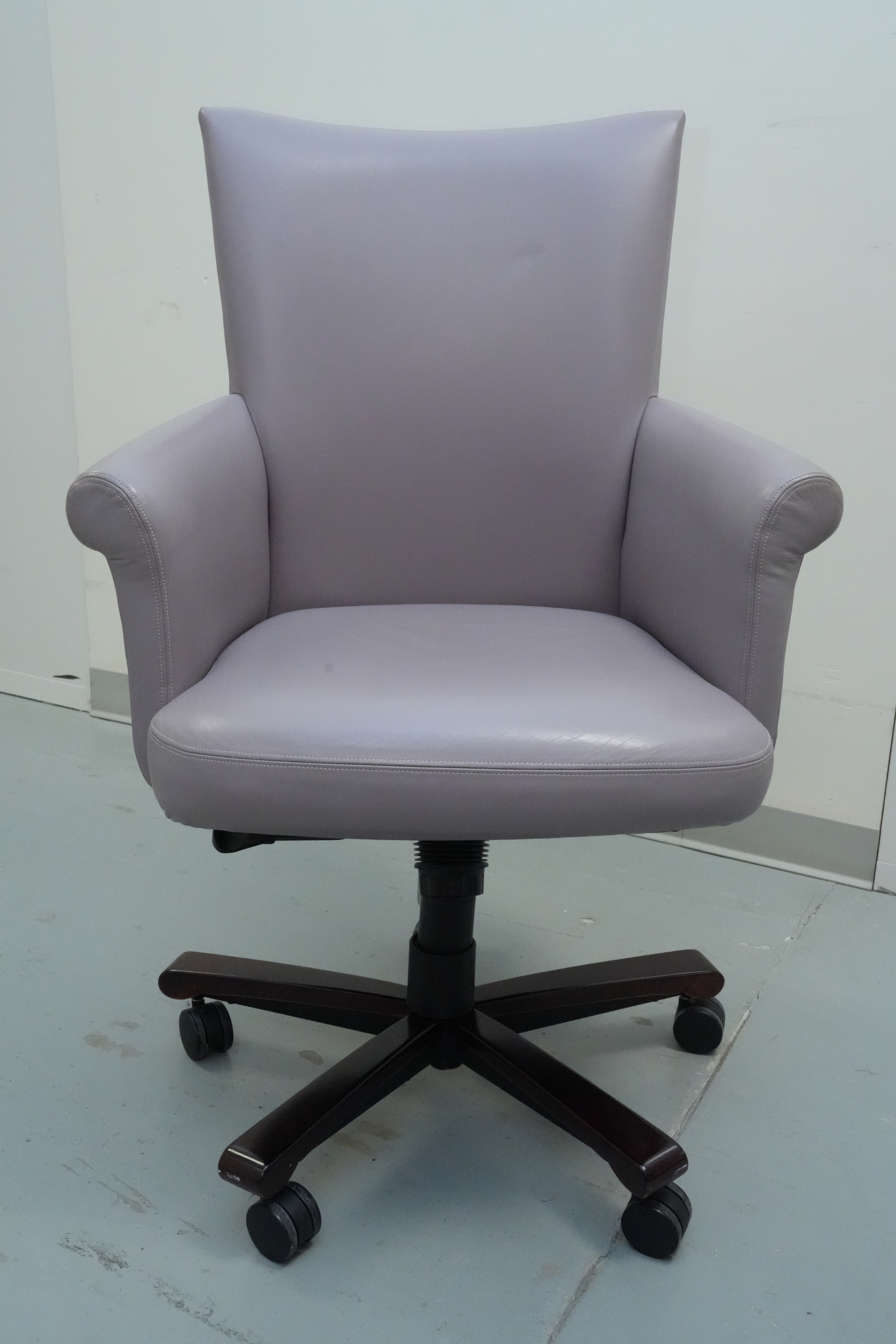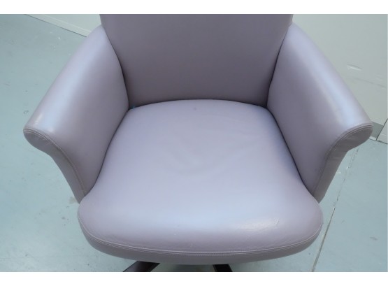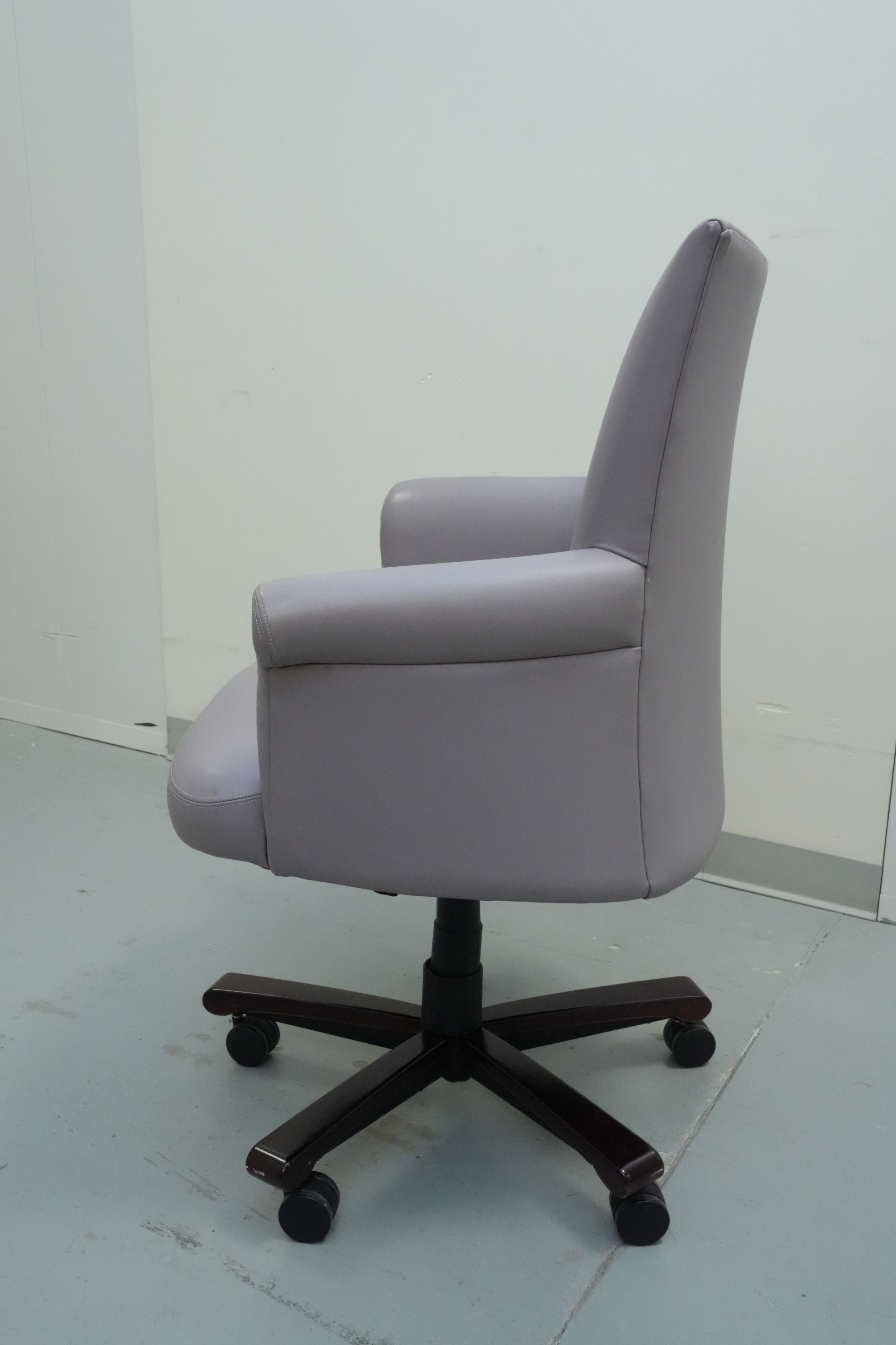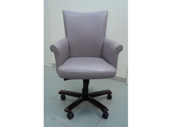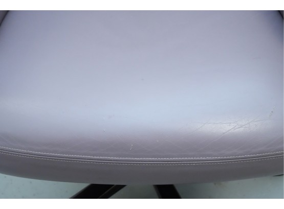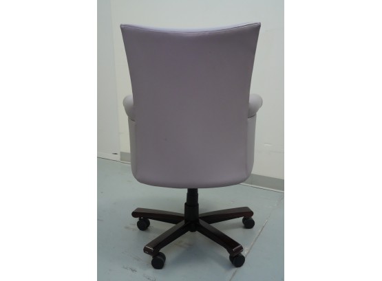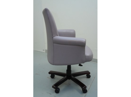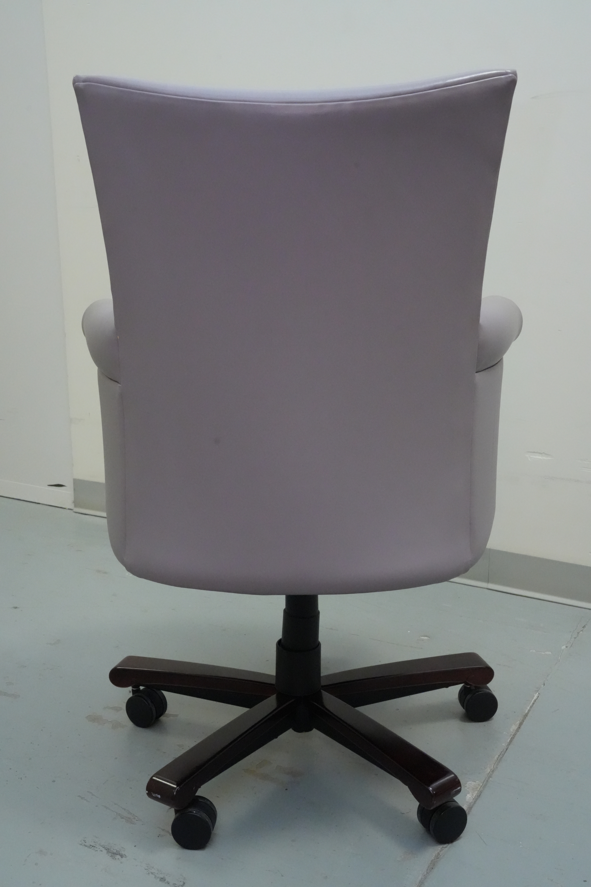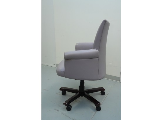 Sleek swivel chair upholstered in pale gray faux leather, featuring padded armrests, a high backrest, and a five-wheeled wooden base. Signs of wear to the leather due to age and use.
