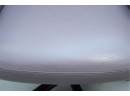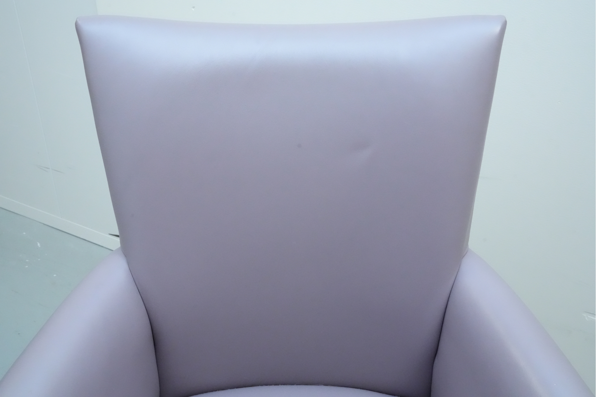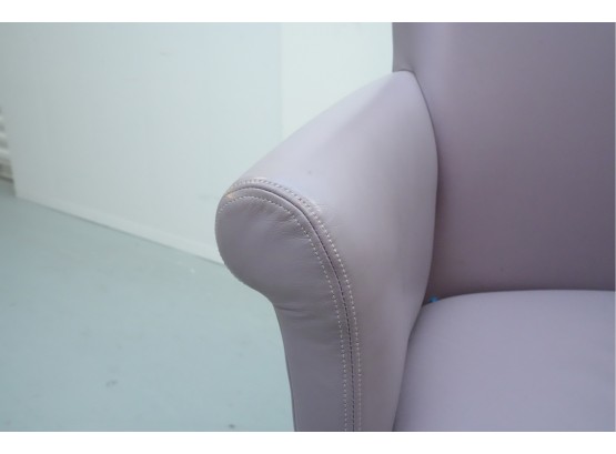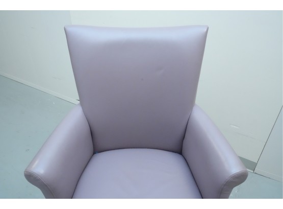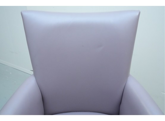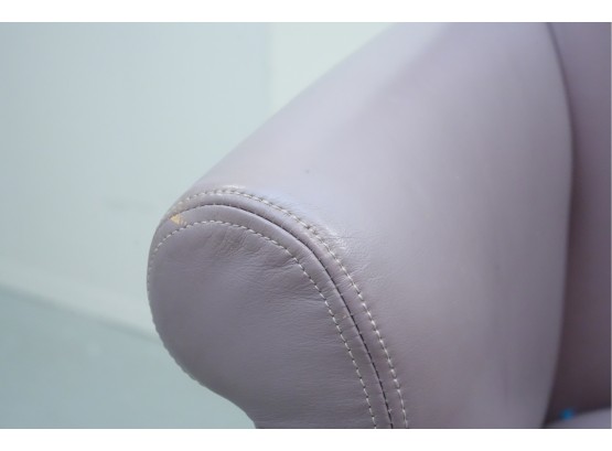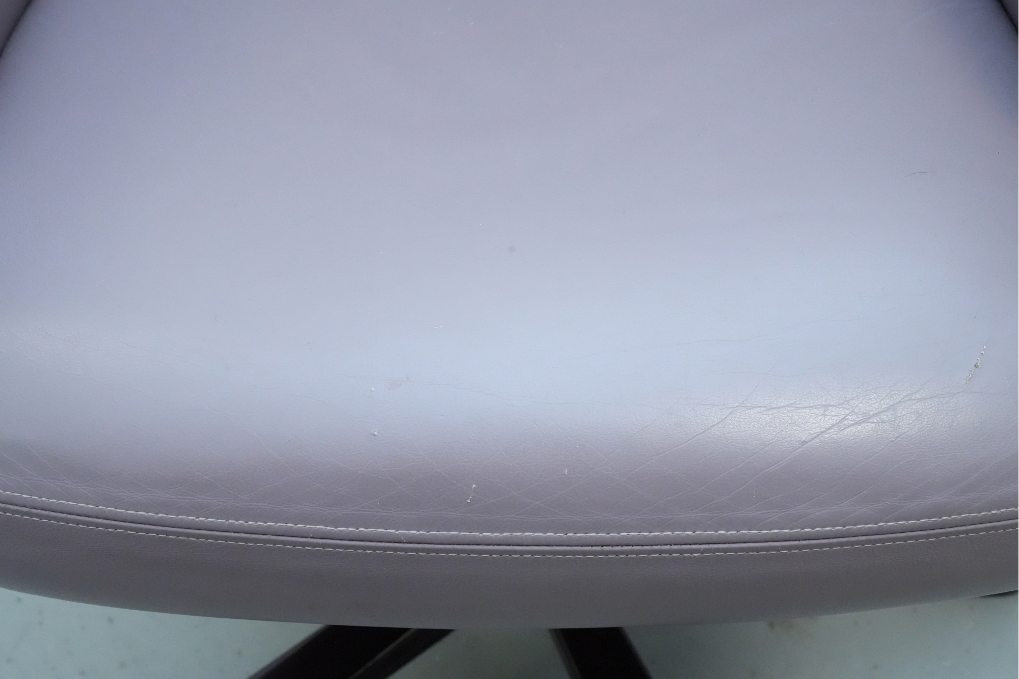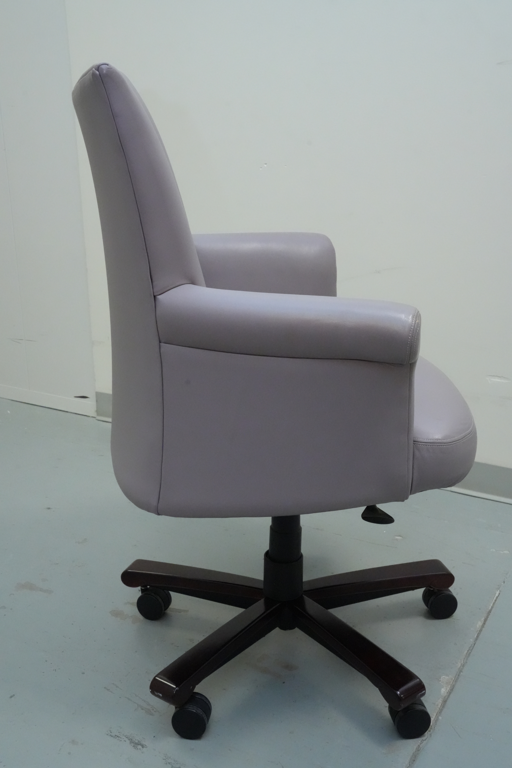 Sleek swivel chair upholstered in pale gray faux leather, featuring padded armrests, a high backrest, and a five-wheeled wooden base. Signs of wear to the leather due to age and use.