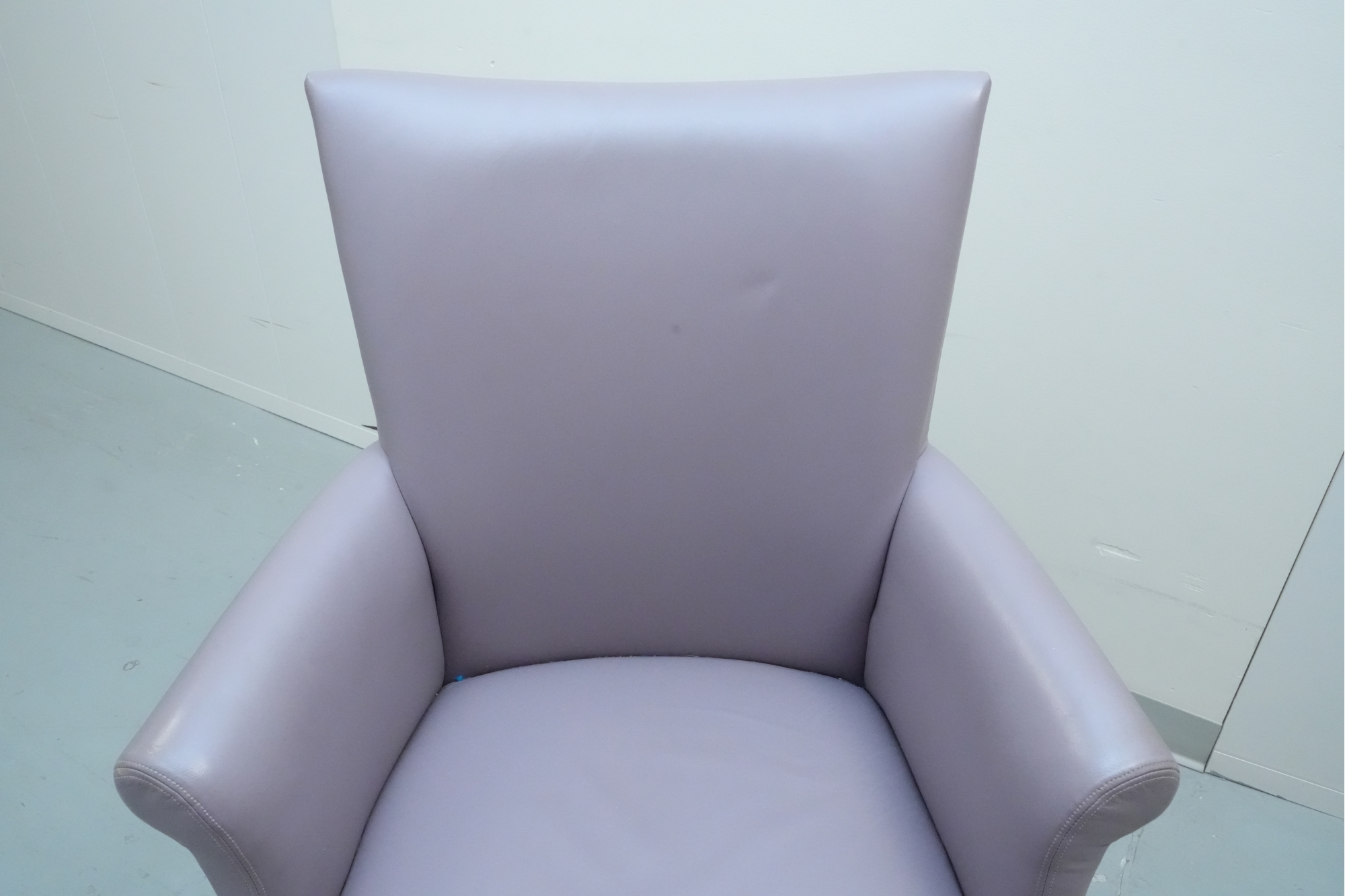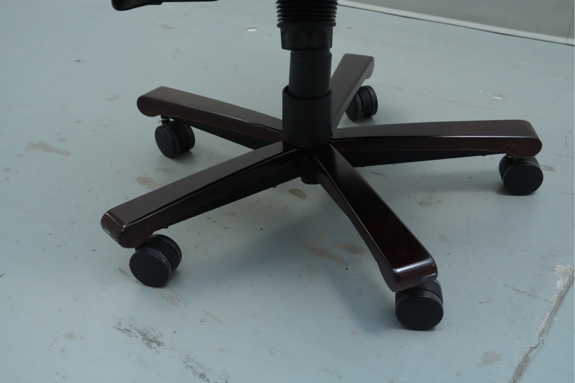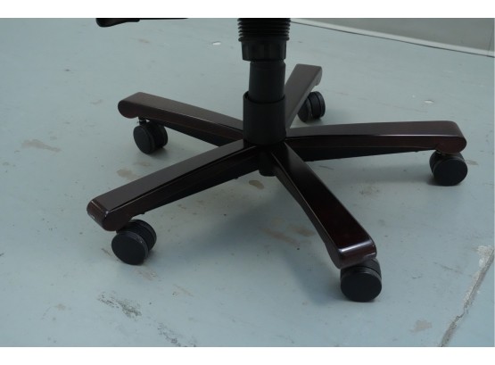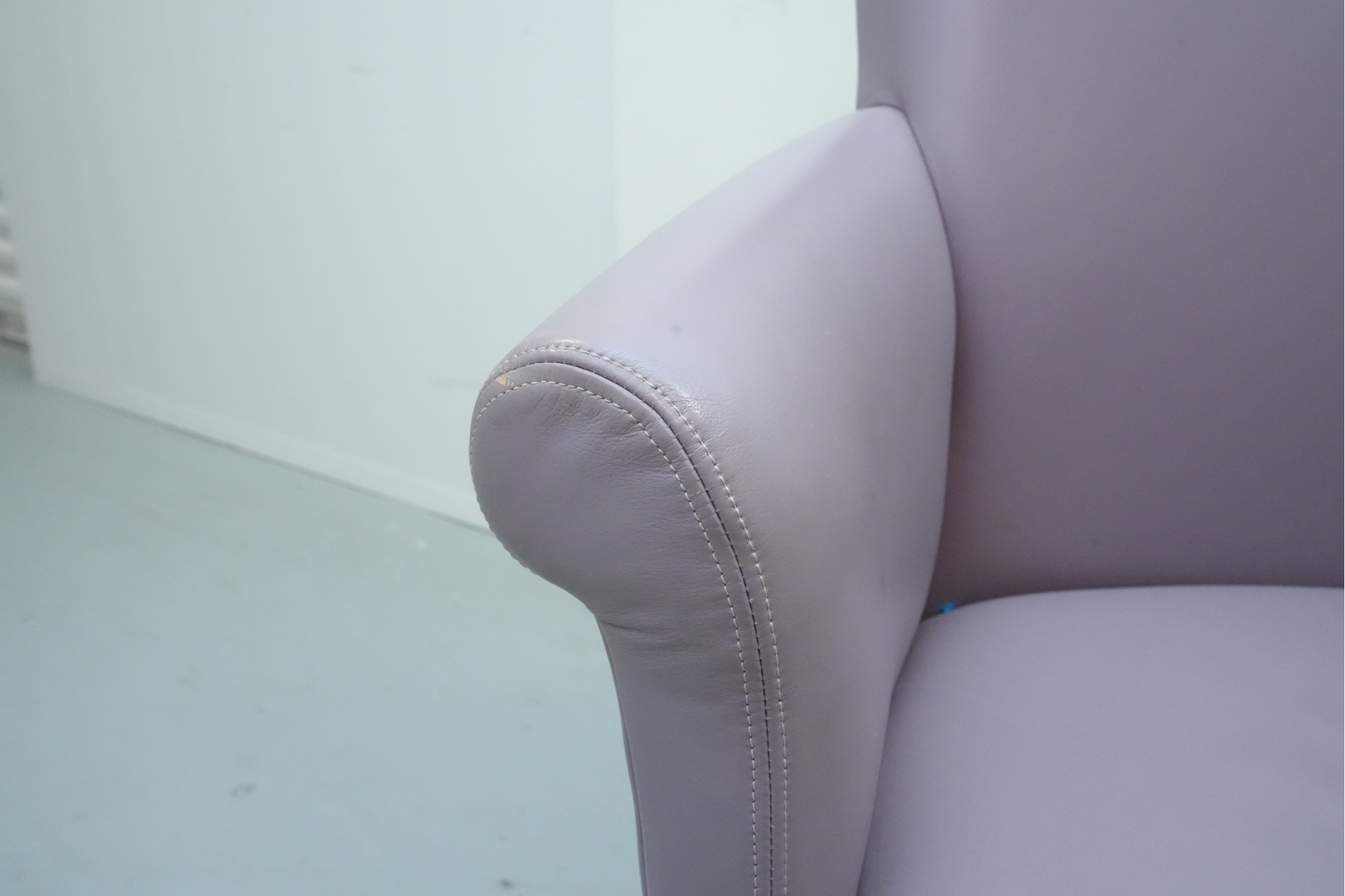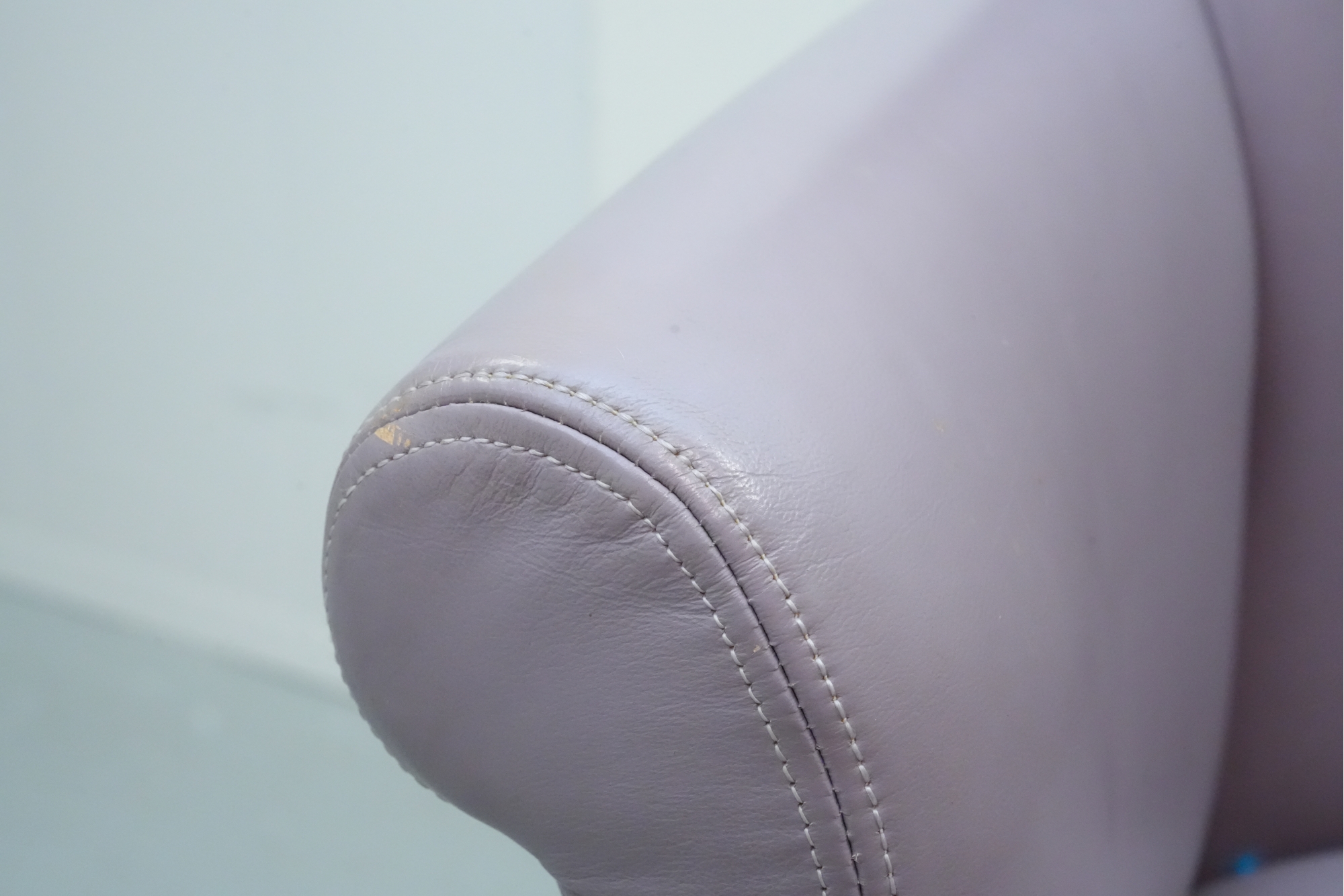 Sleek swivel chair upholstered in pale gray faux leather, featuring padded armrests, a high backrest, and a five-wheeled wooden base. Signs of wear to the leather due to age and use.