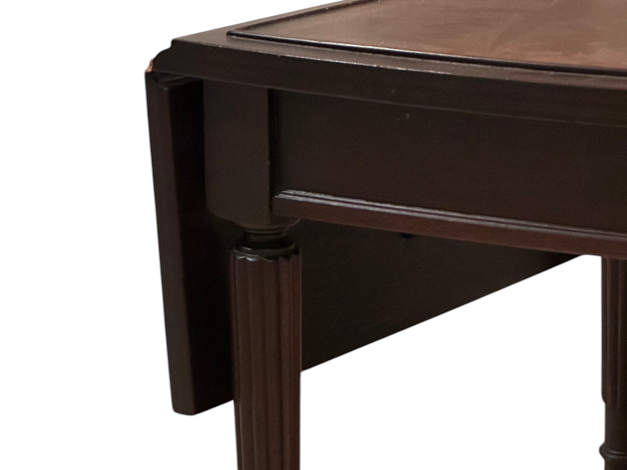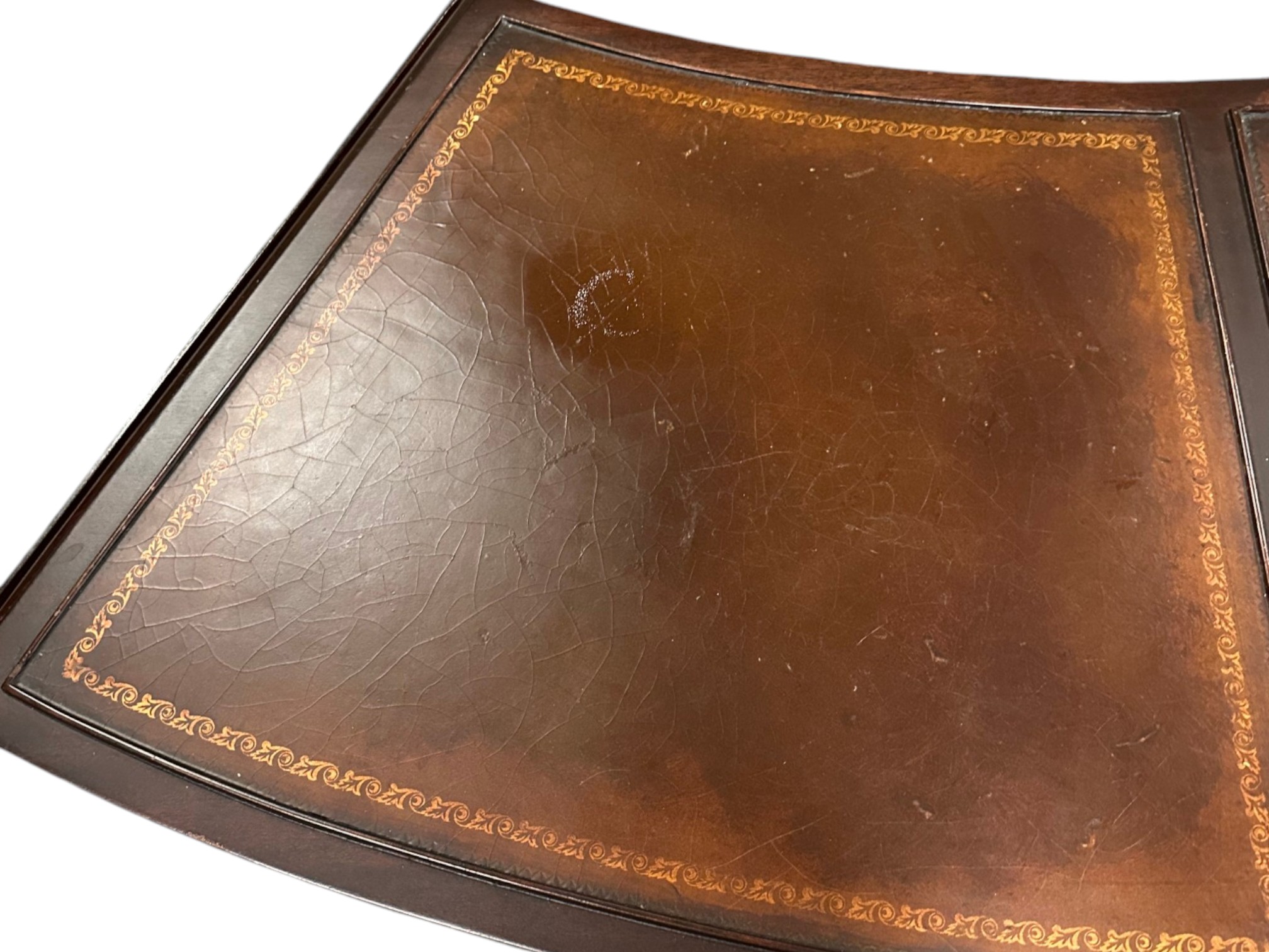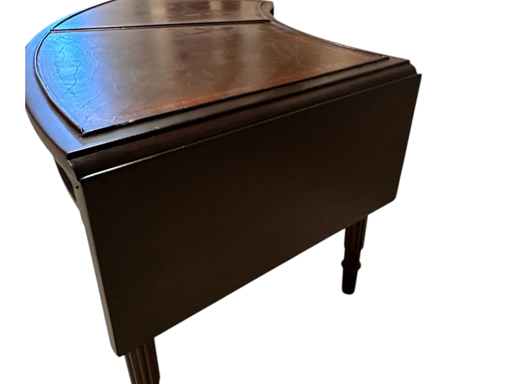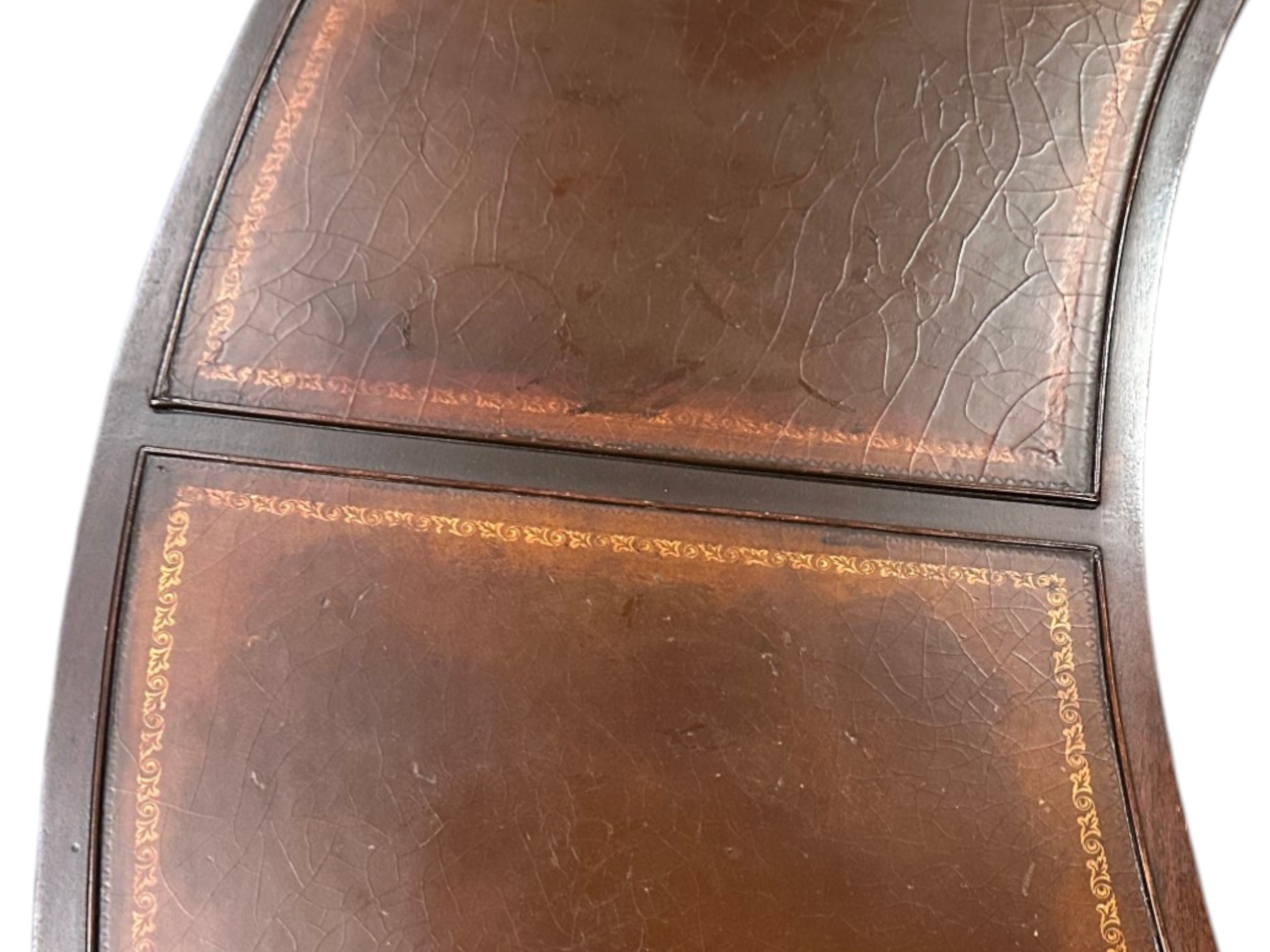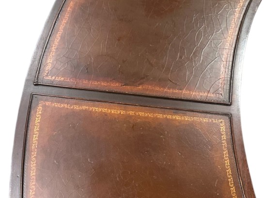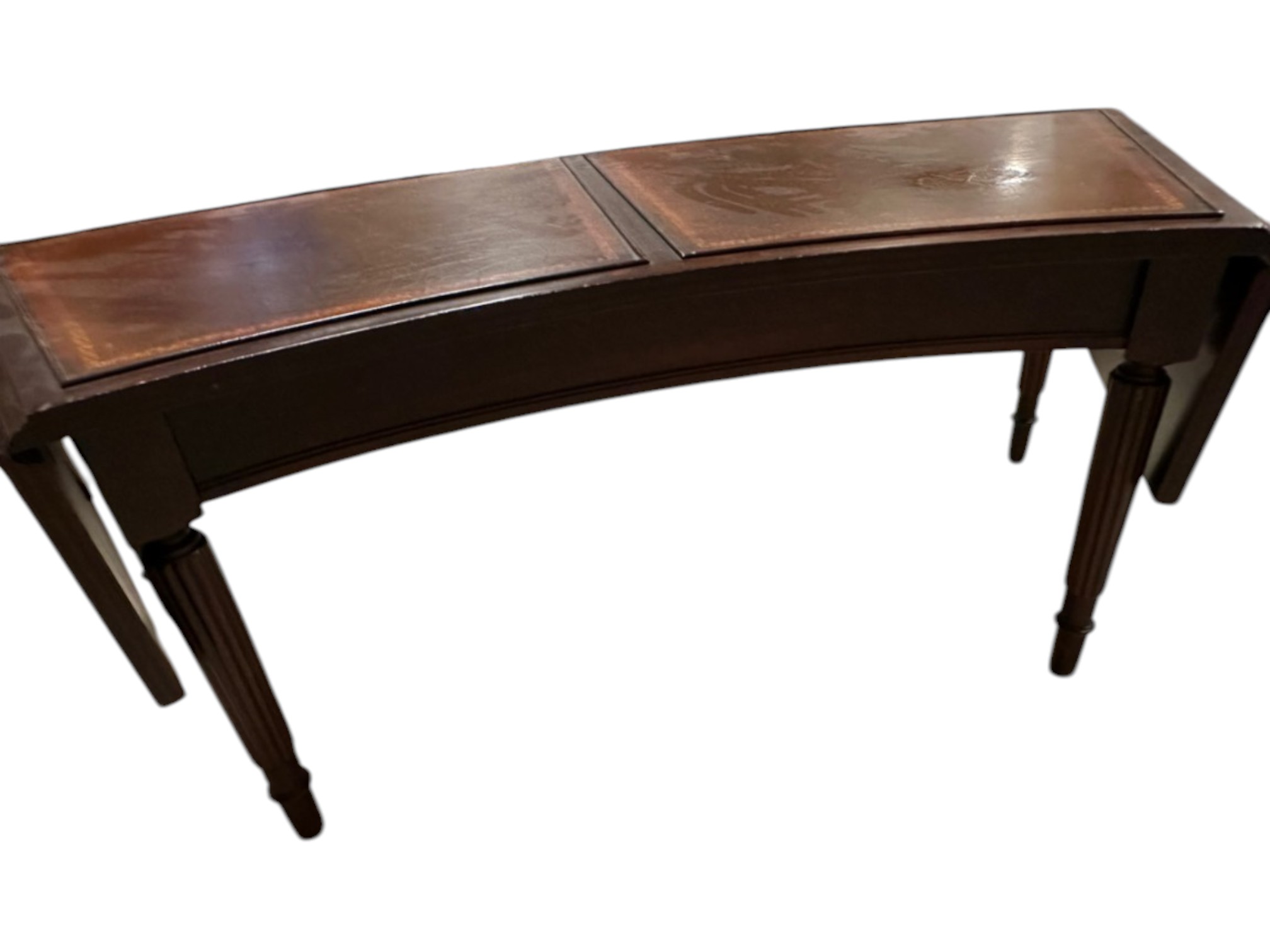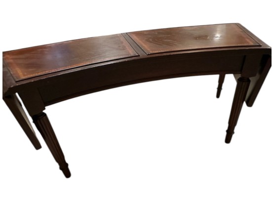 Vintage (mid 20th c.) Federal style mahogany demilune console table, featuring a leather or faux leather inlay top and two drop leaf extension sides.