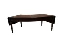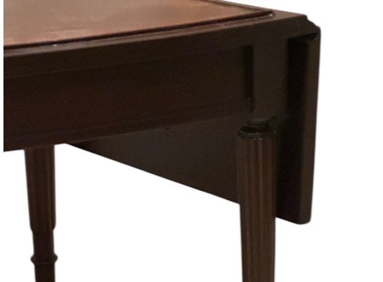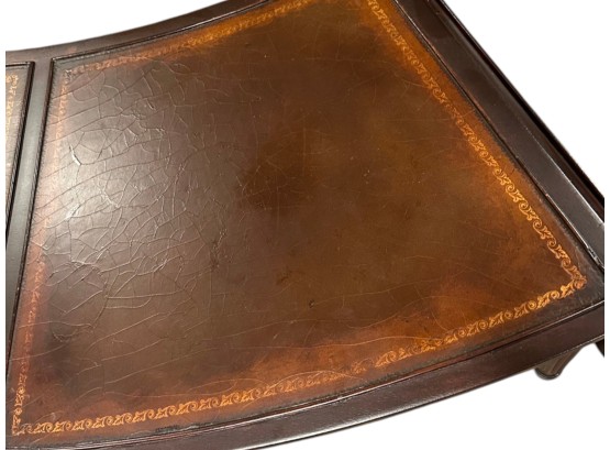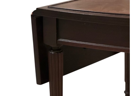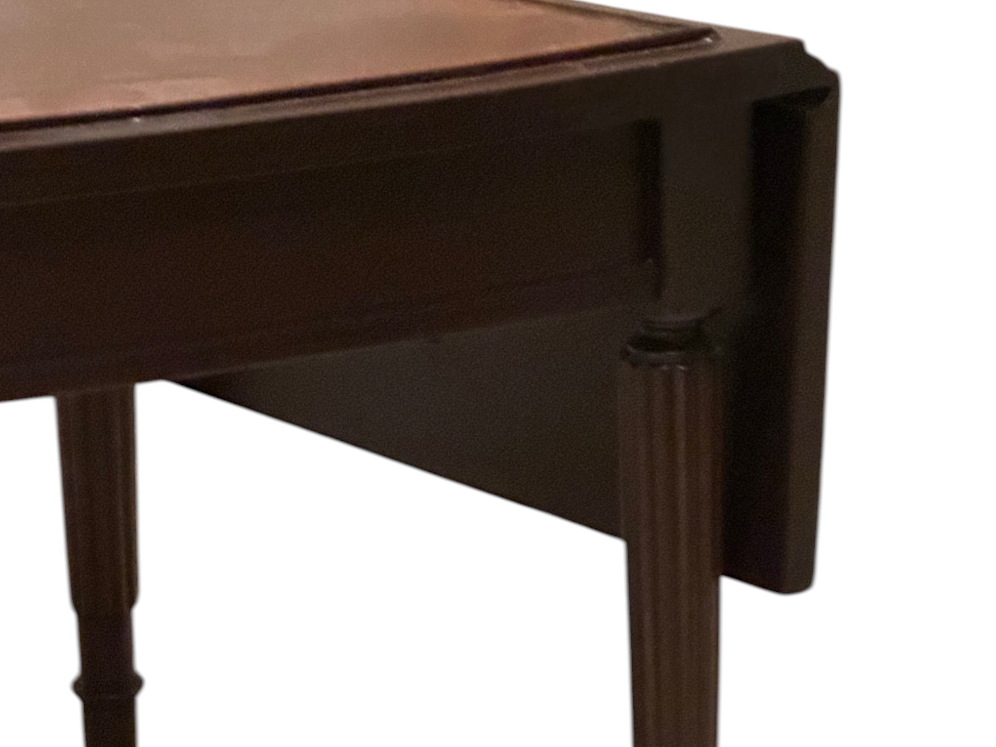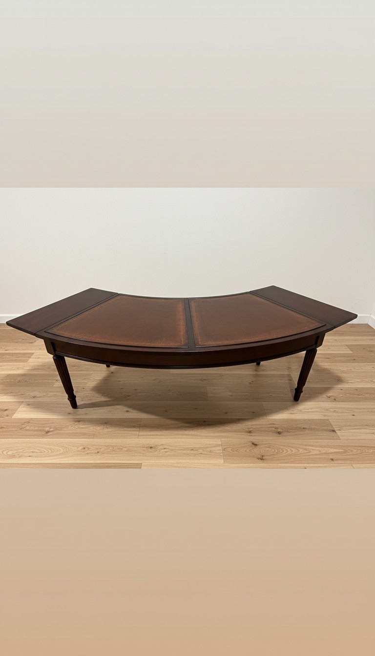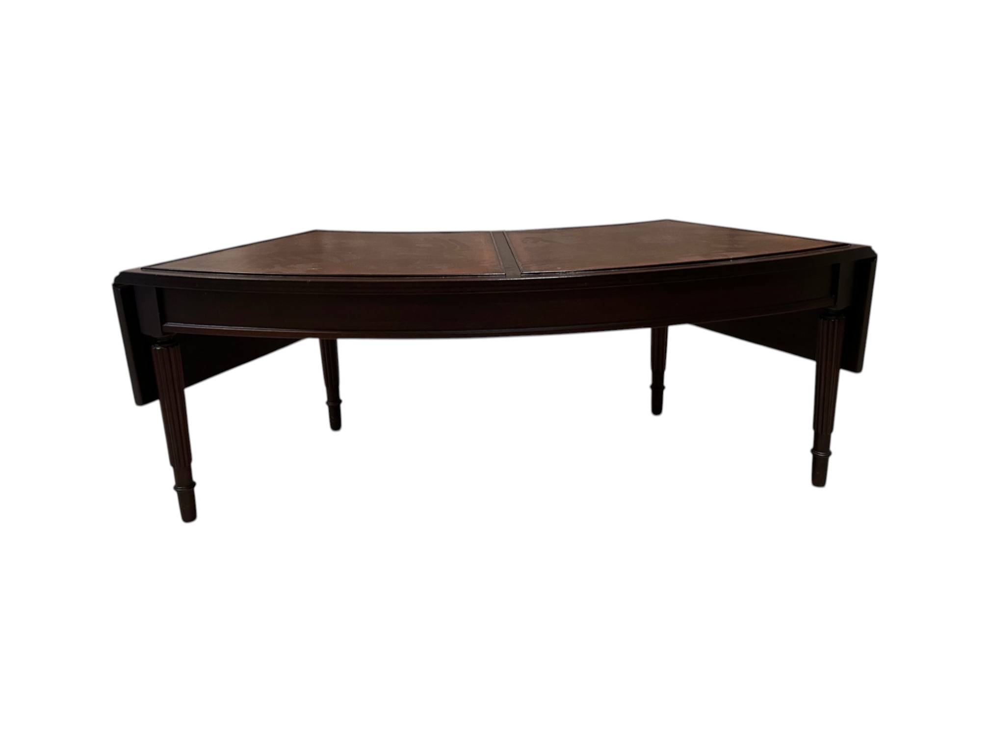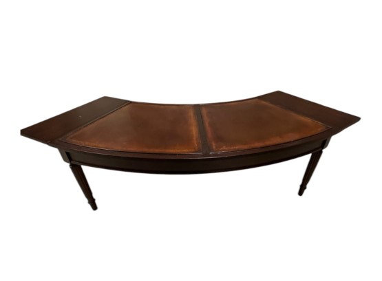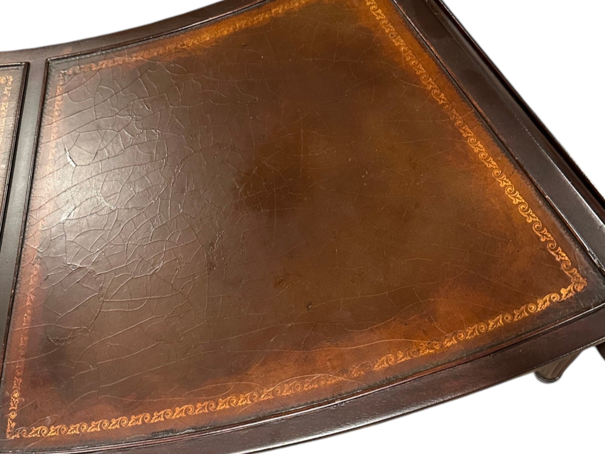 Vintage (mid 20th c.) Federal style mahogany demilune console table, featuring a leather or faux leather inlay top and two drop leaf extension sides.