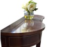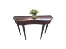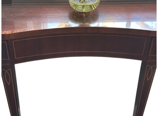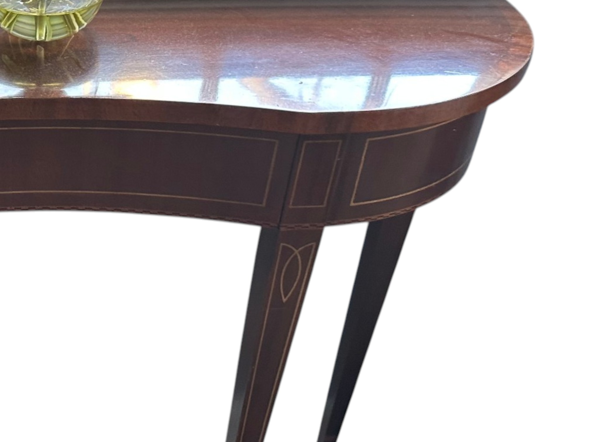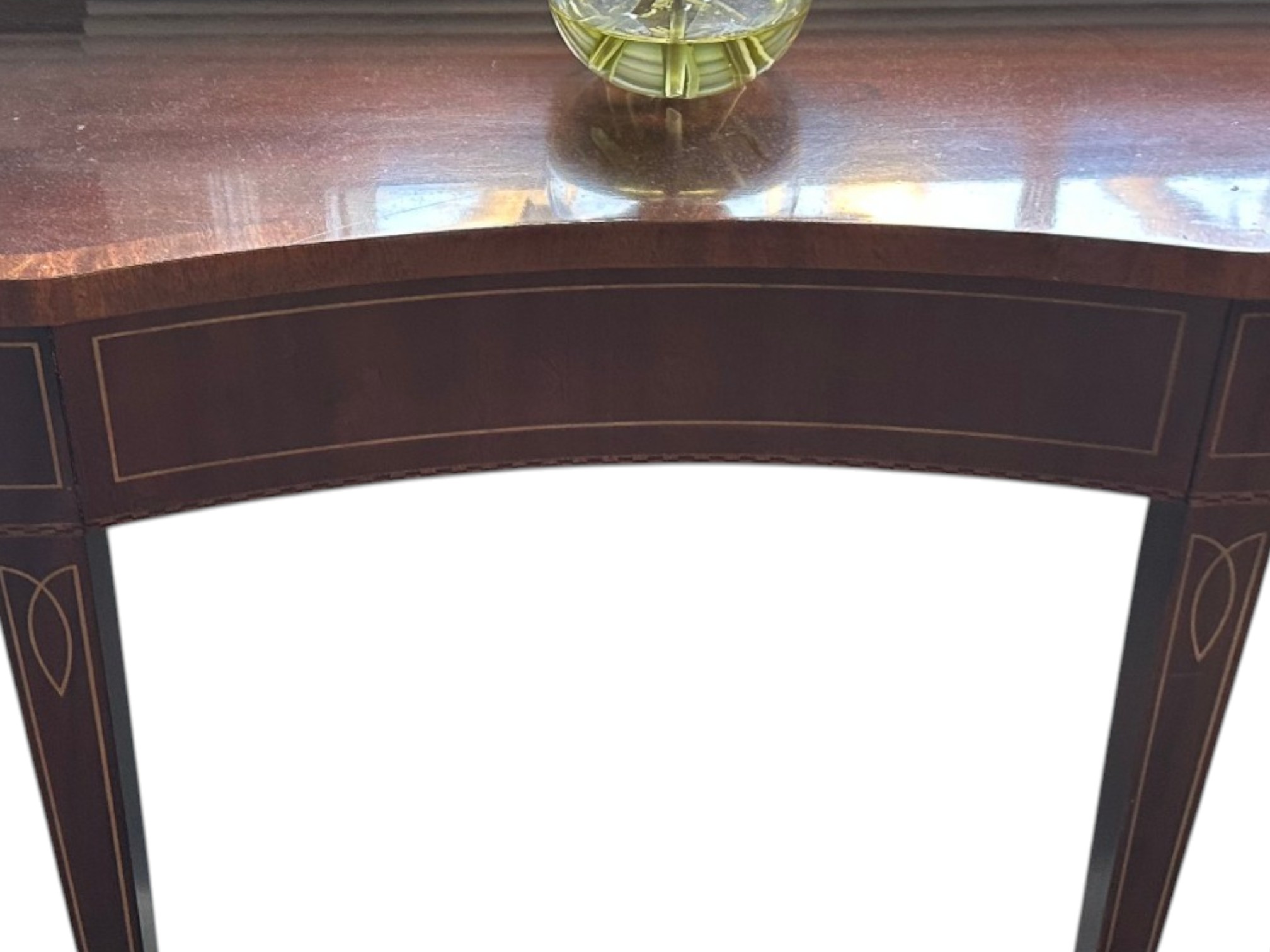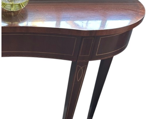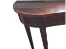 Federal or Hepplewhite‑style mahogany demilune console table with a serpentine front, accented by satinwood inlays and set on elegant tapered legs.