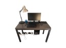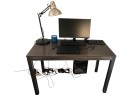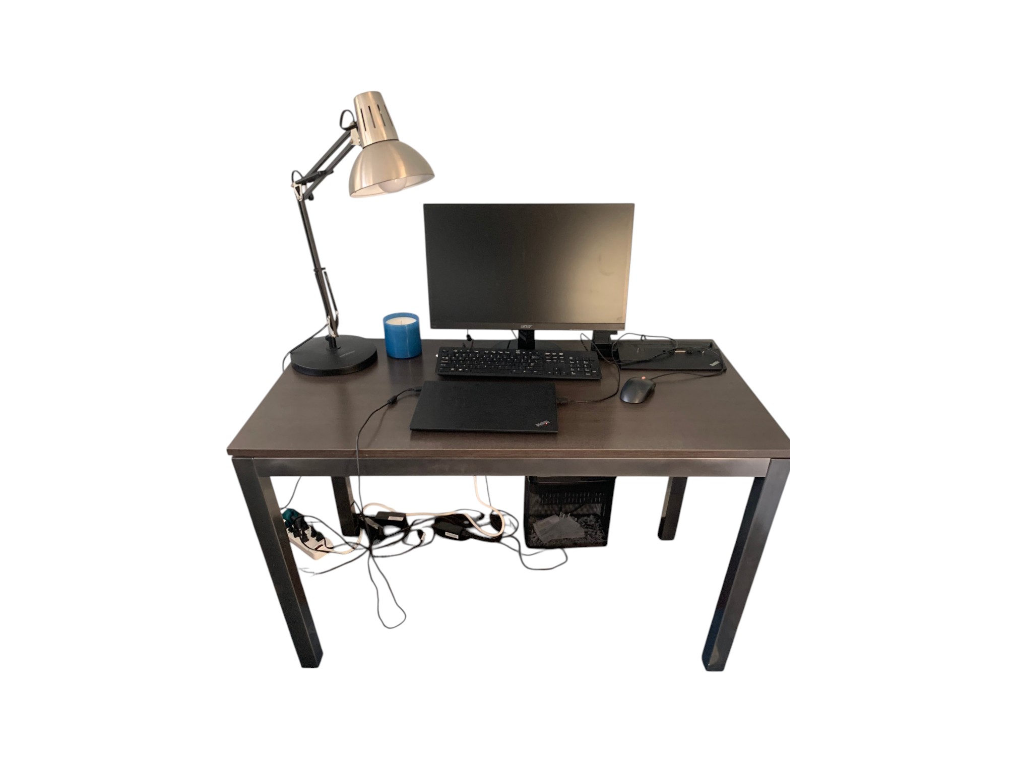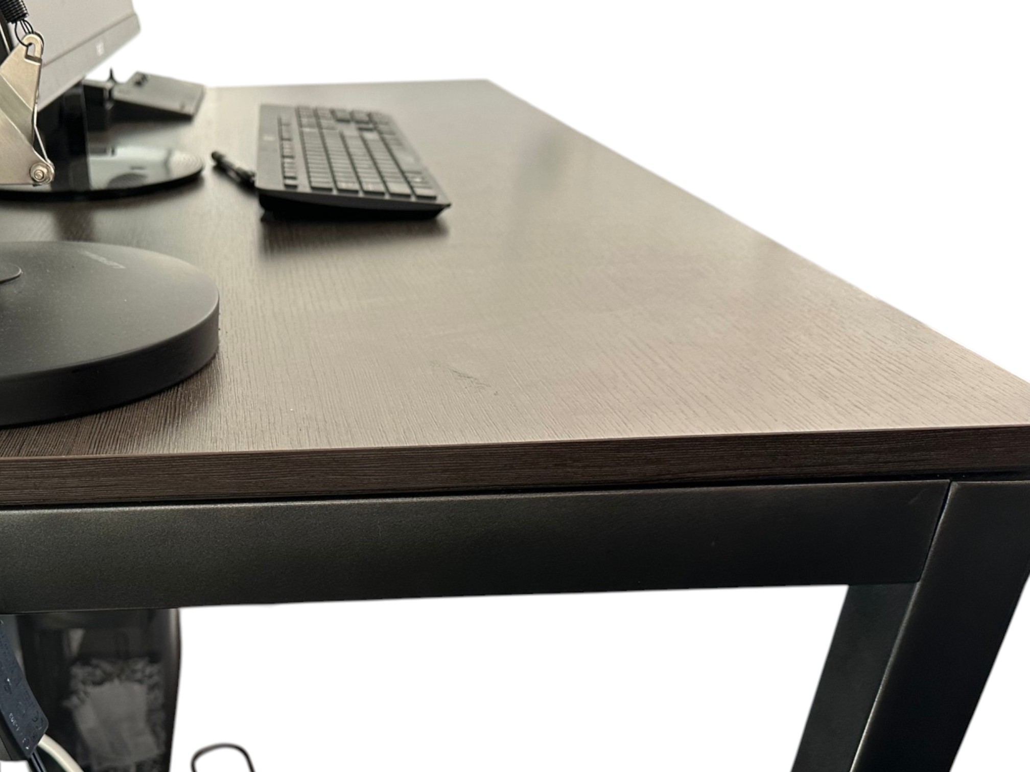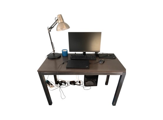 Desk table with sturdy metal legs and thick wood (or faux wood) top, in a dark brown color.