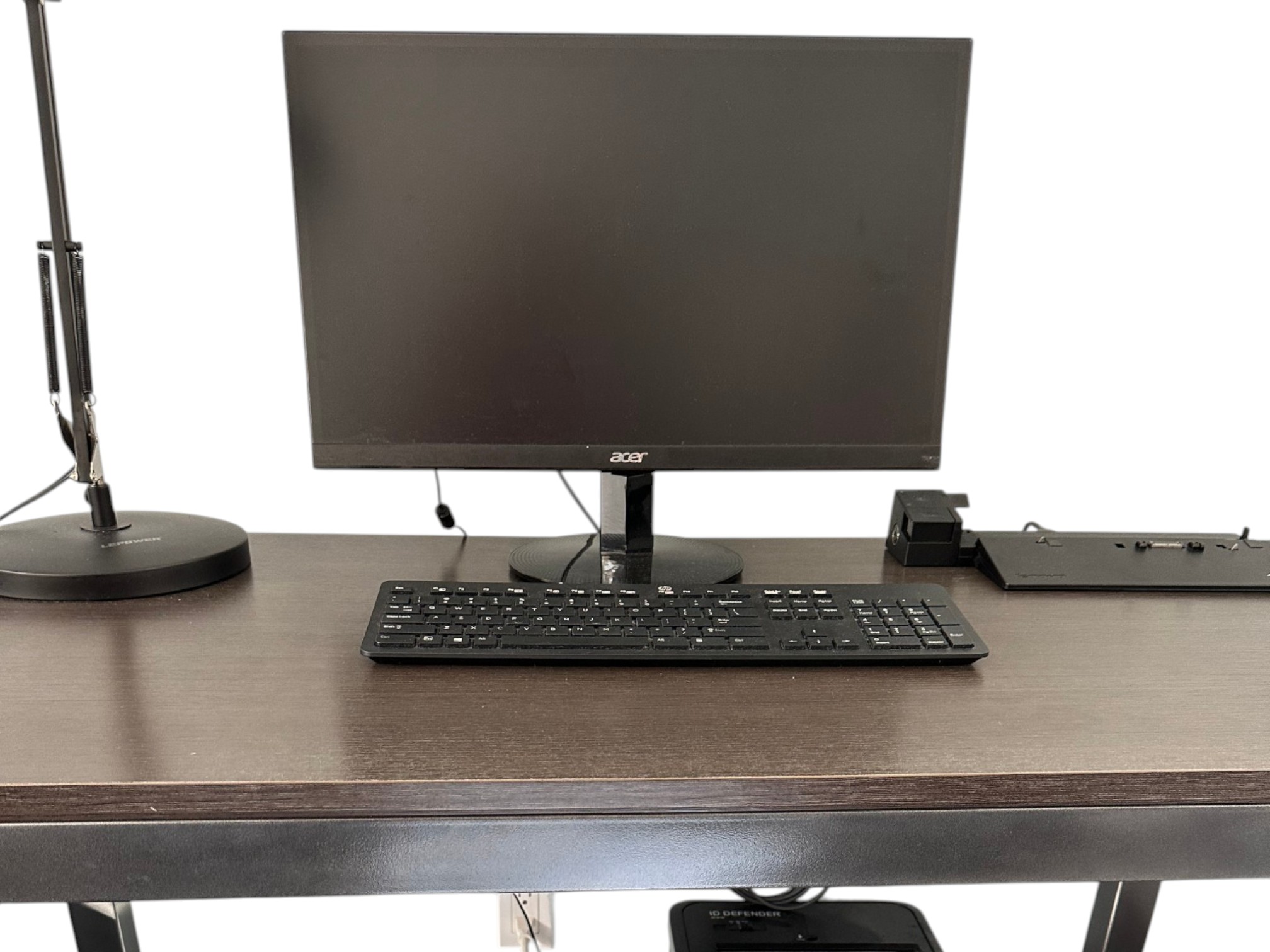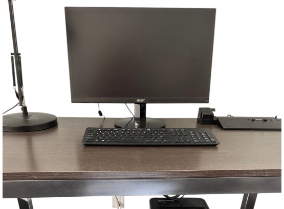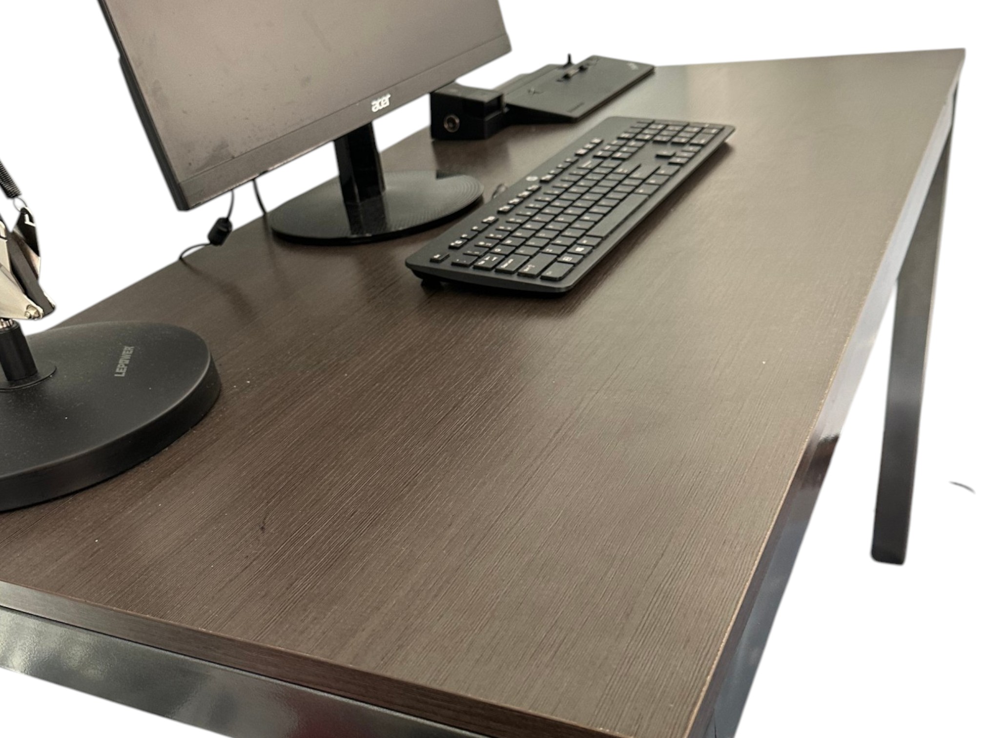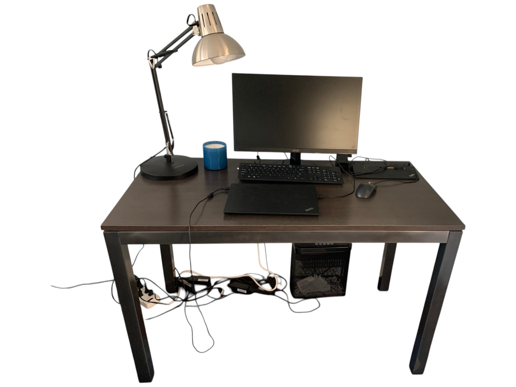 Desk table with sturdy metal legs and thick wood (or faux wood) top, in a dark brown color.