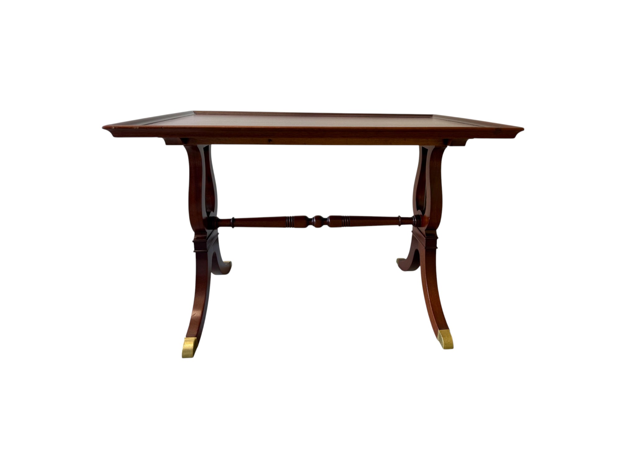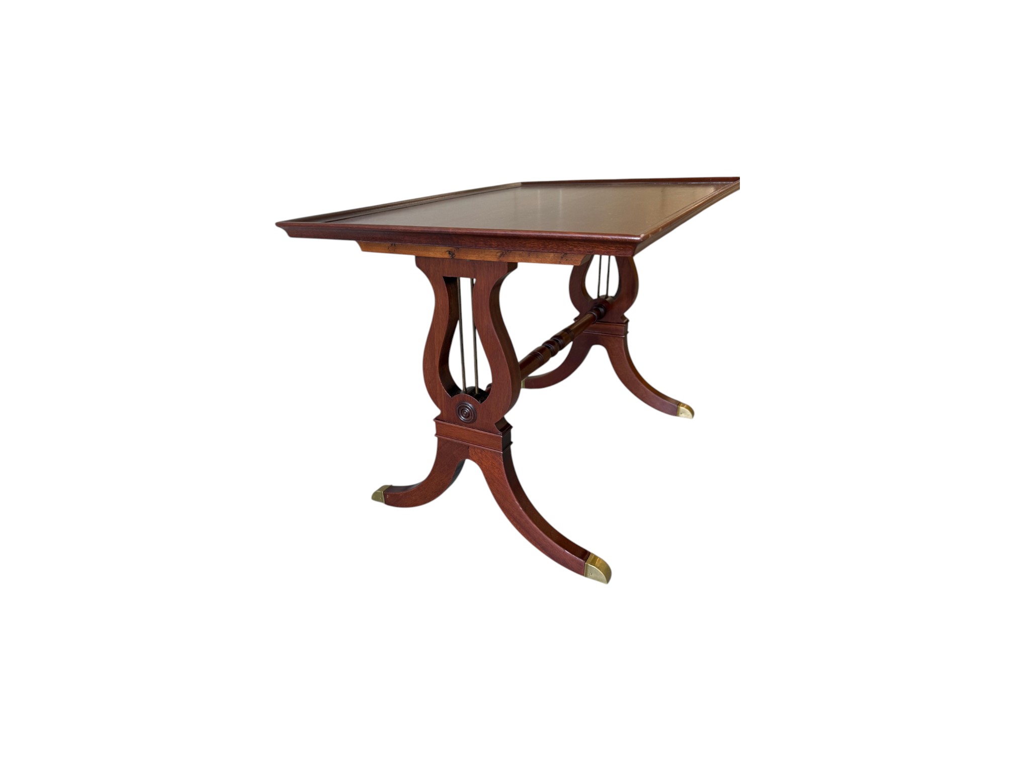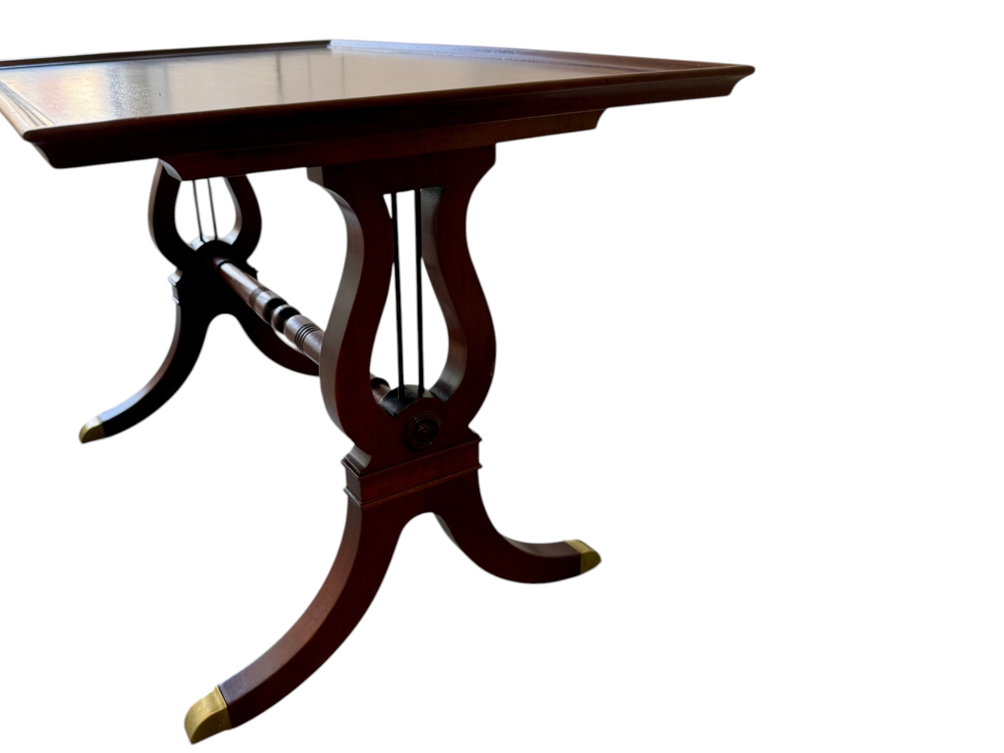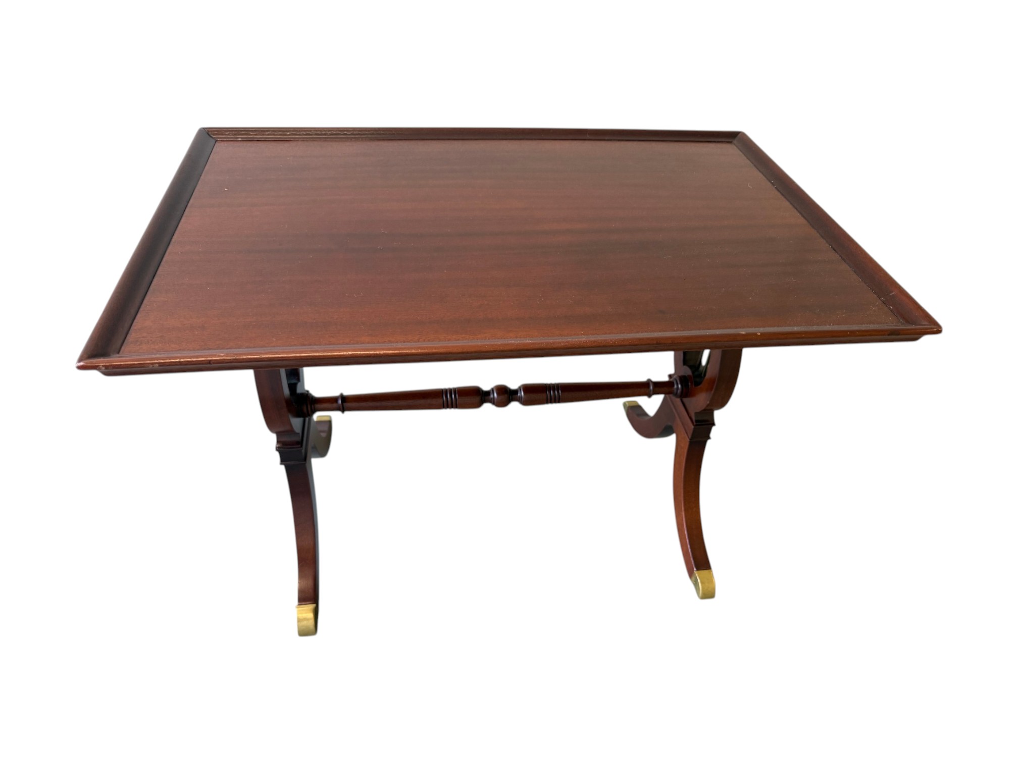Vintage (1950s) Regency style mahogany tea table, featuring a rectangular top, delicate pedestal legs with a turned stretcher, "lyre" shaped base, and brass toe cap caster feet.