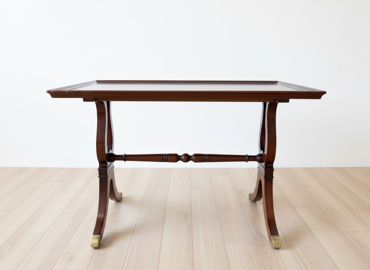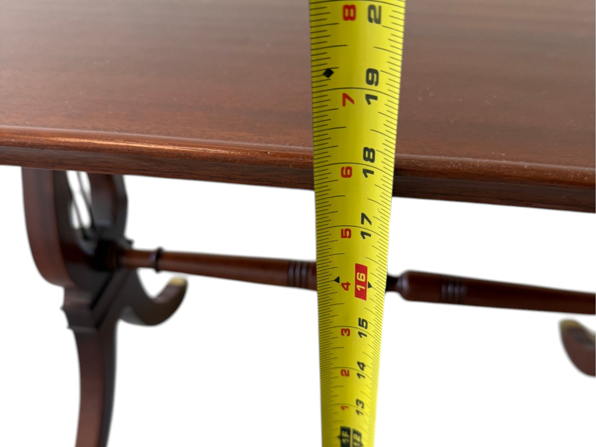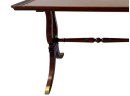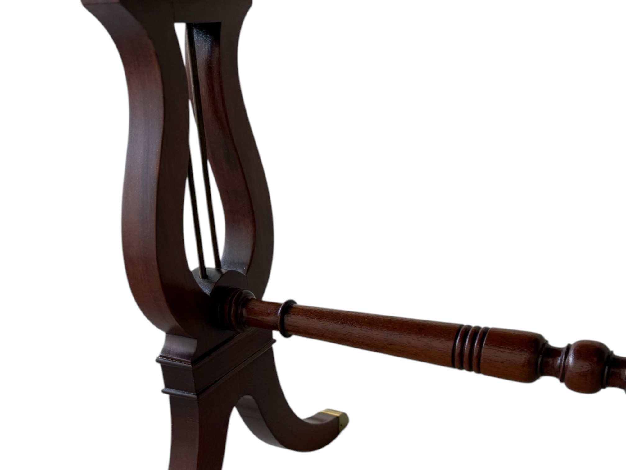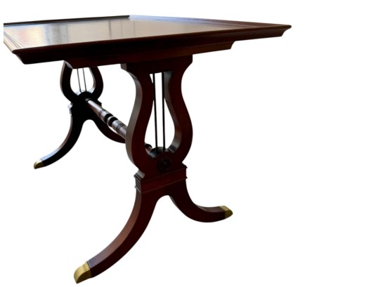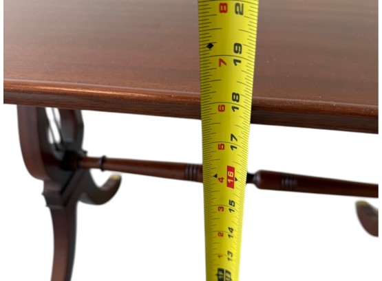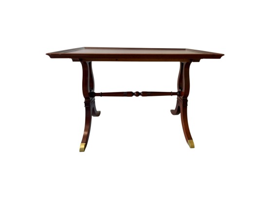 Vintage (1950s) Regency style mahogany tea table, featuring a rectangular top, delicate pedestal legs with a turned stretcher, "lyre" shaped base, and brass toe cap caster feet.