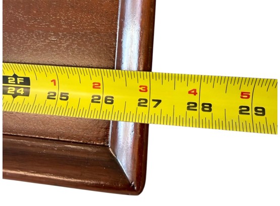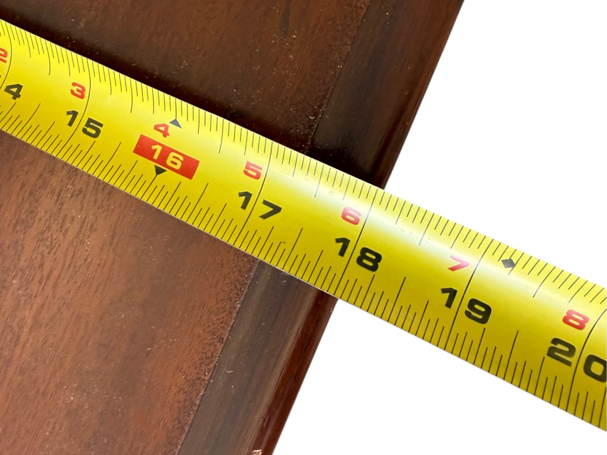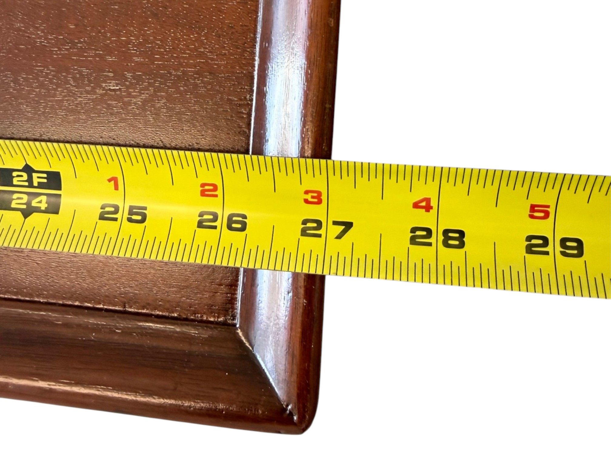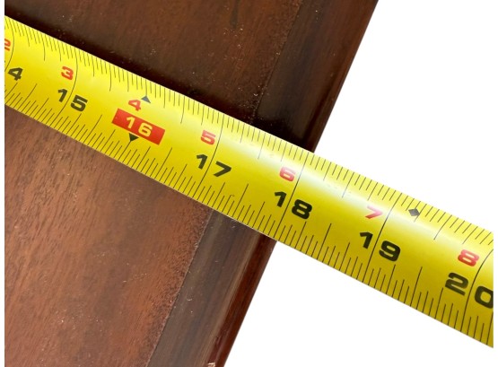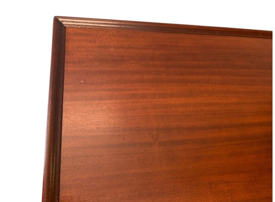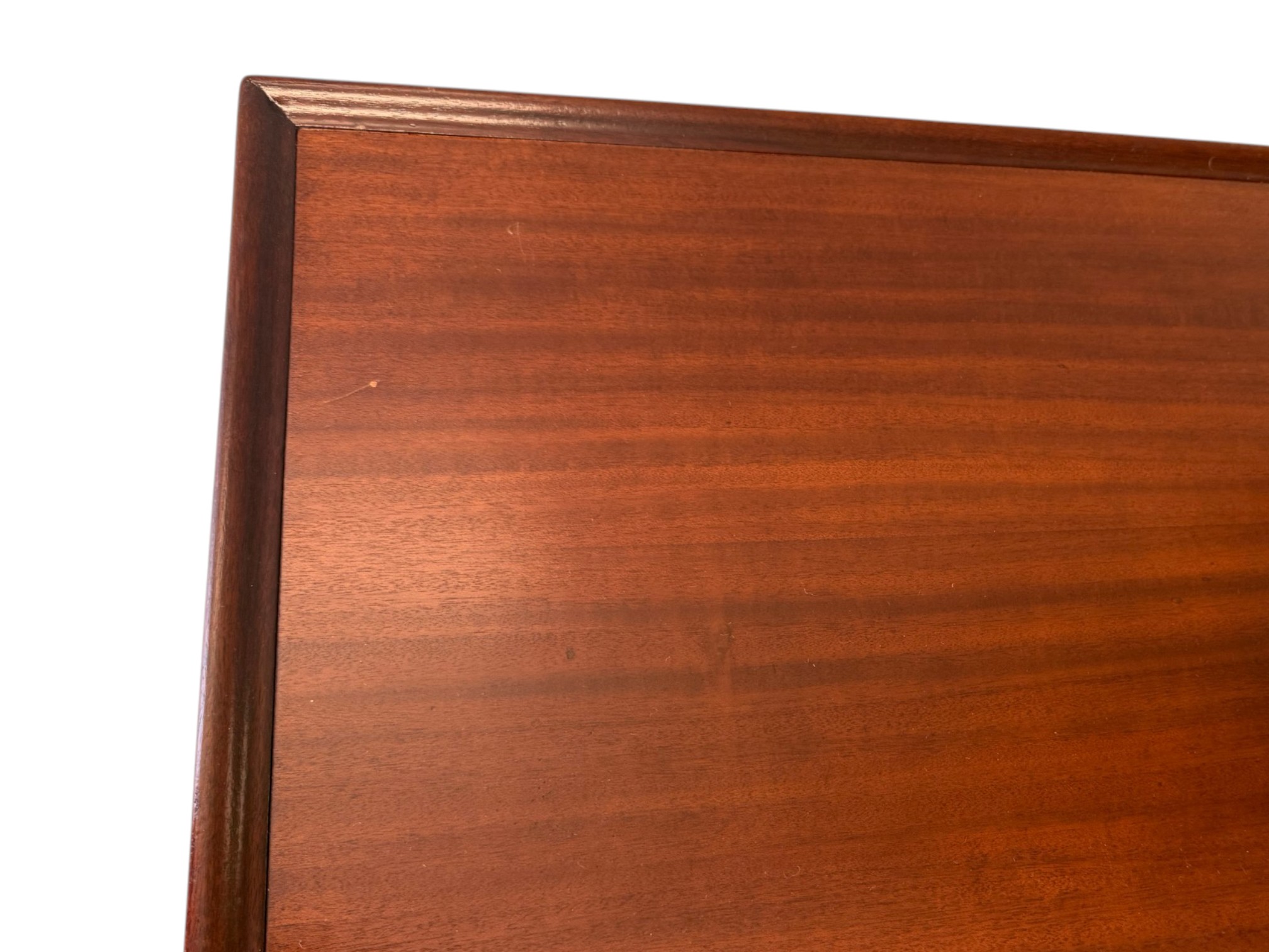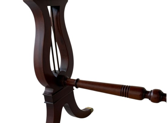 Vintage (1950s) Regency style mahogany tea table, featuring a rectangular top, delicate pedestal legs with a turned stretcher, "lyre" shaped base, and brass toe cap caster feet.