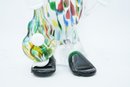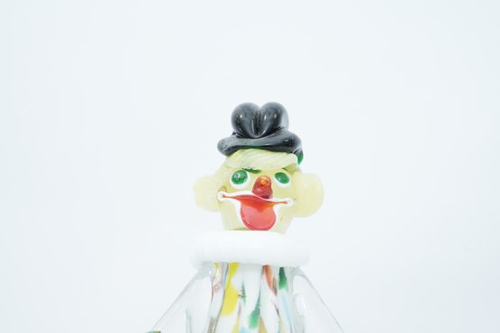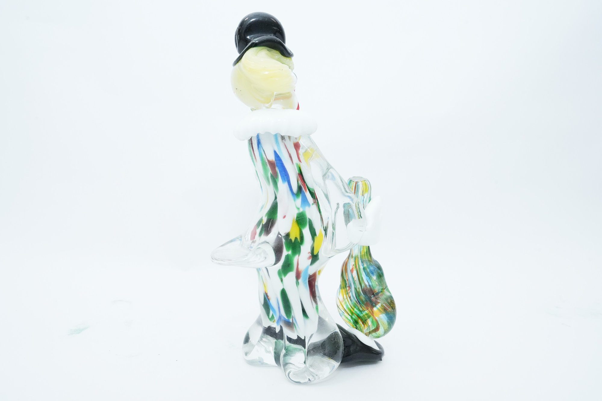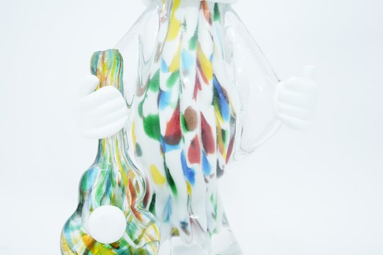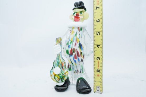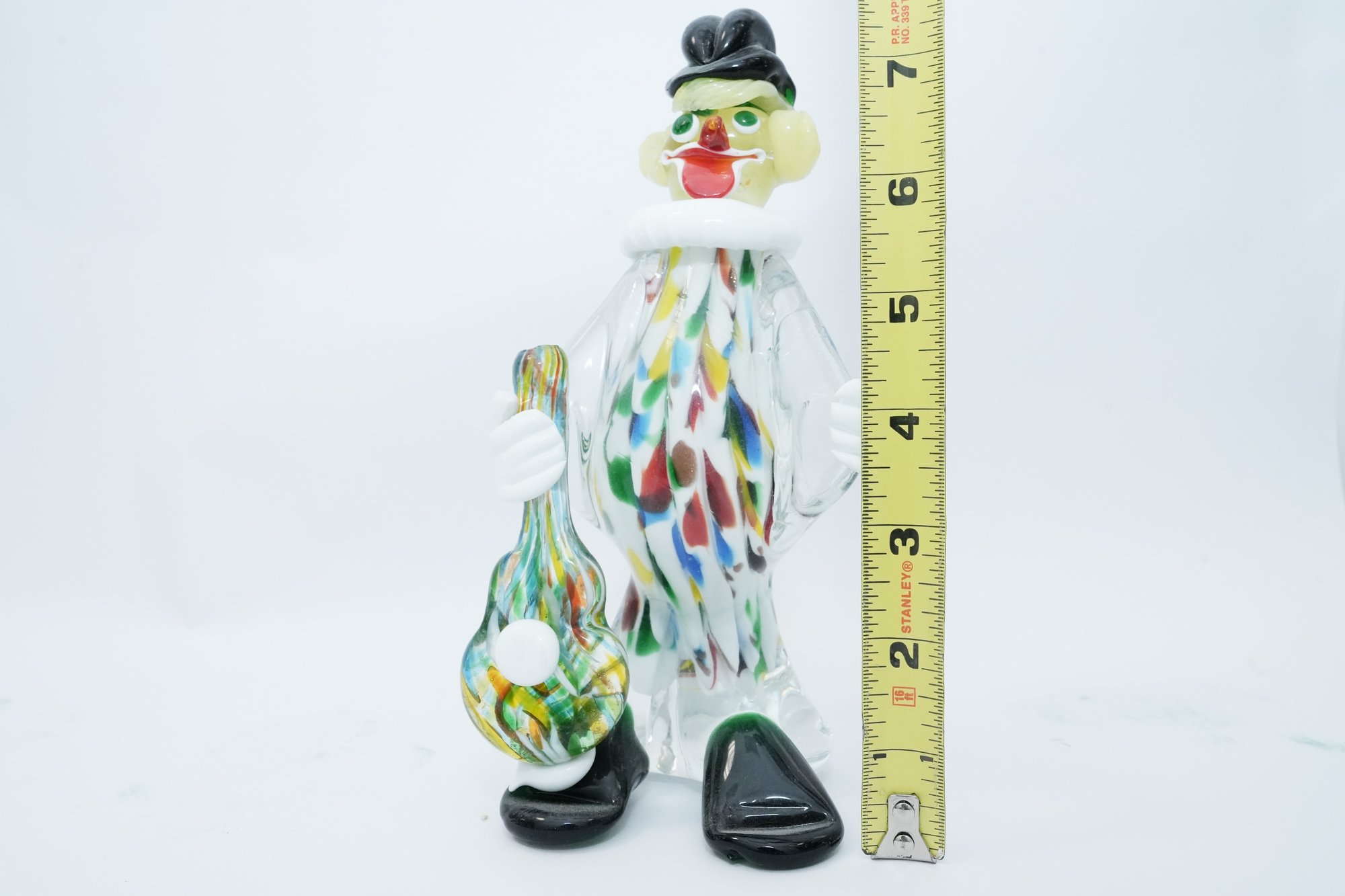 Handcrafted Venetian glass clown holding a guitar, in the classic mid‑century Murano tradition, featuring rich hand‑blown colors and playful detailing.