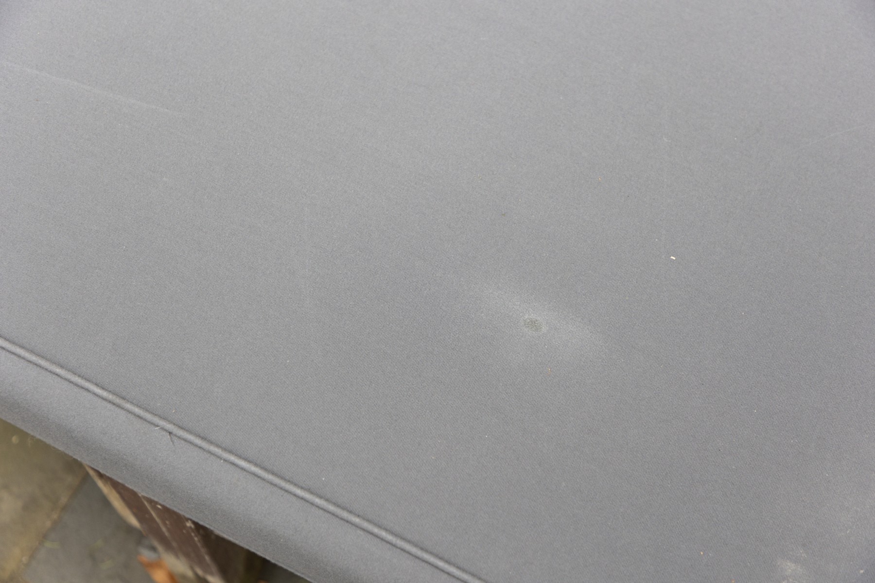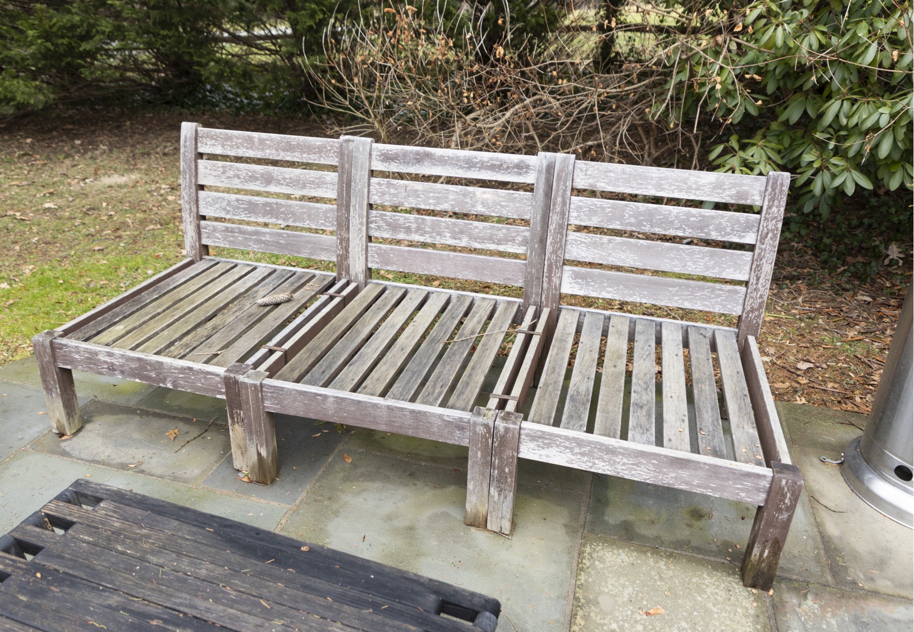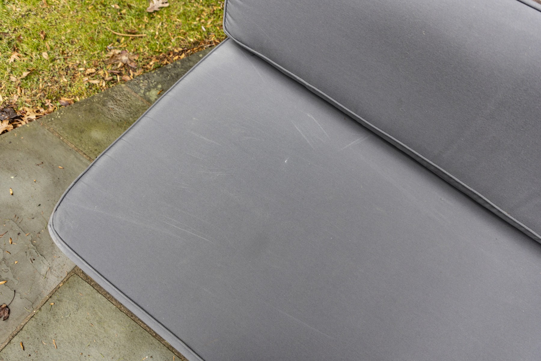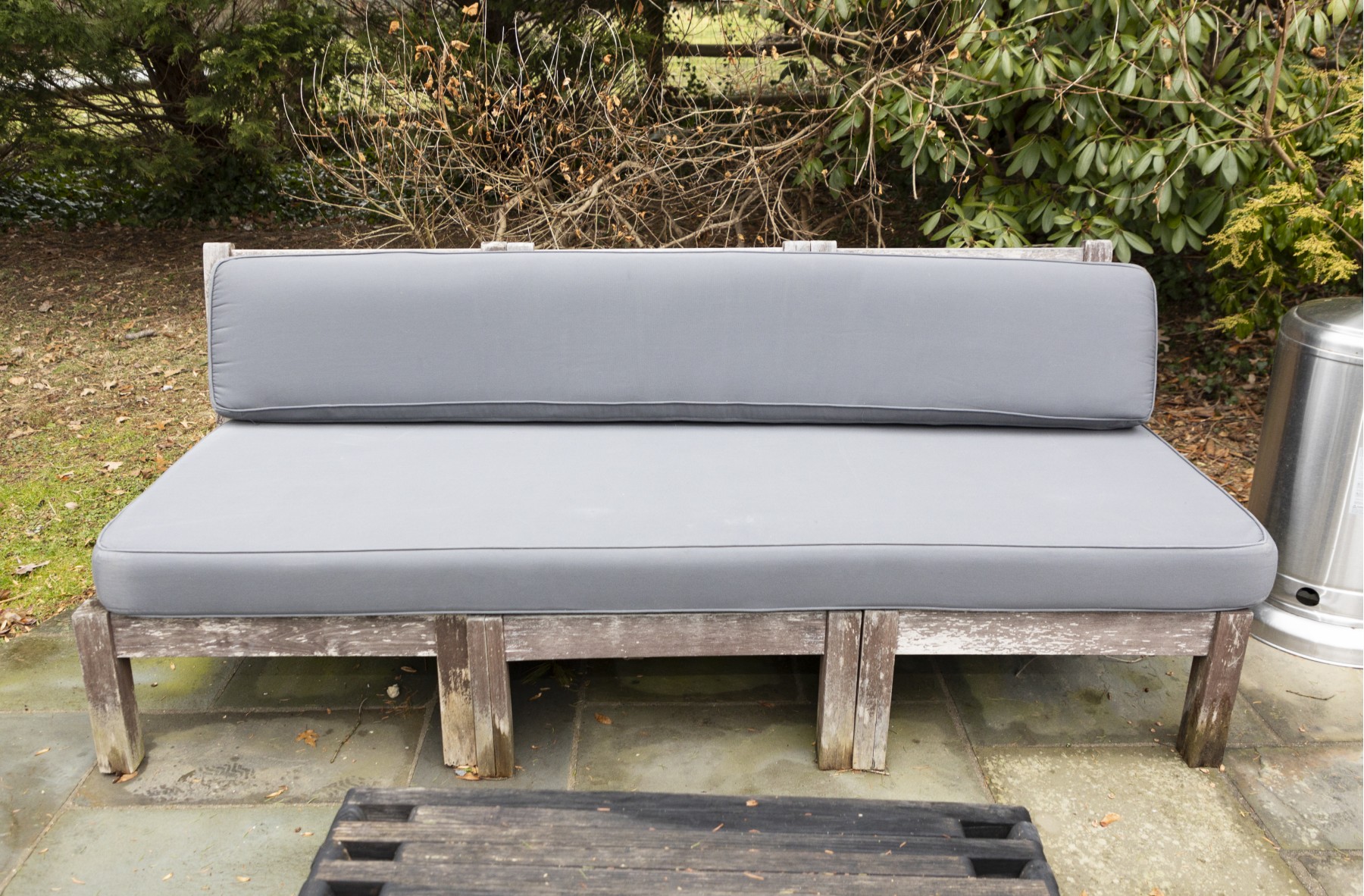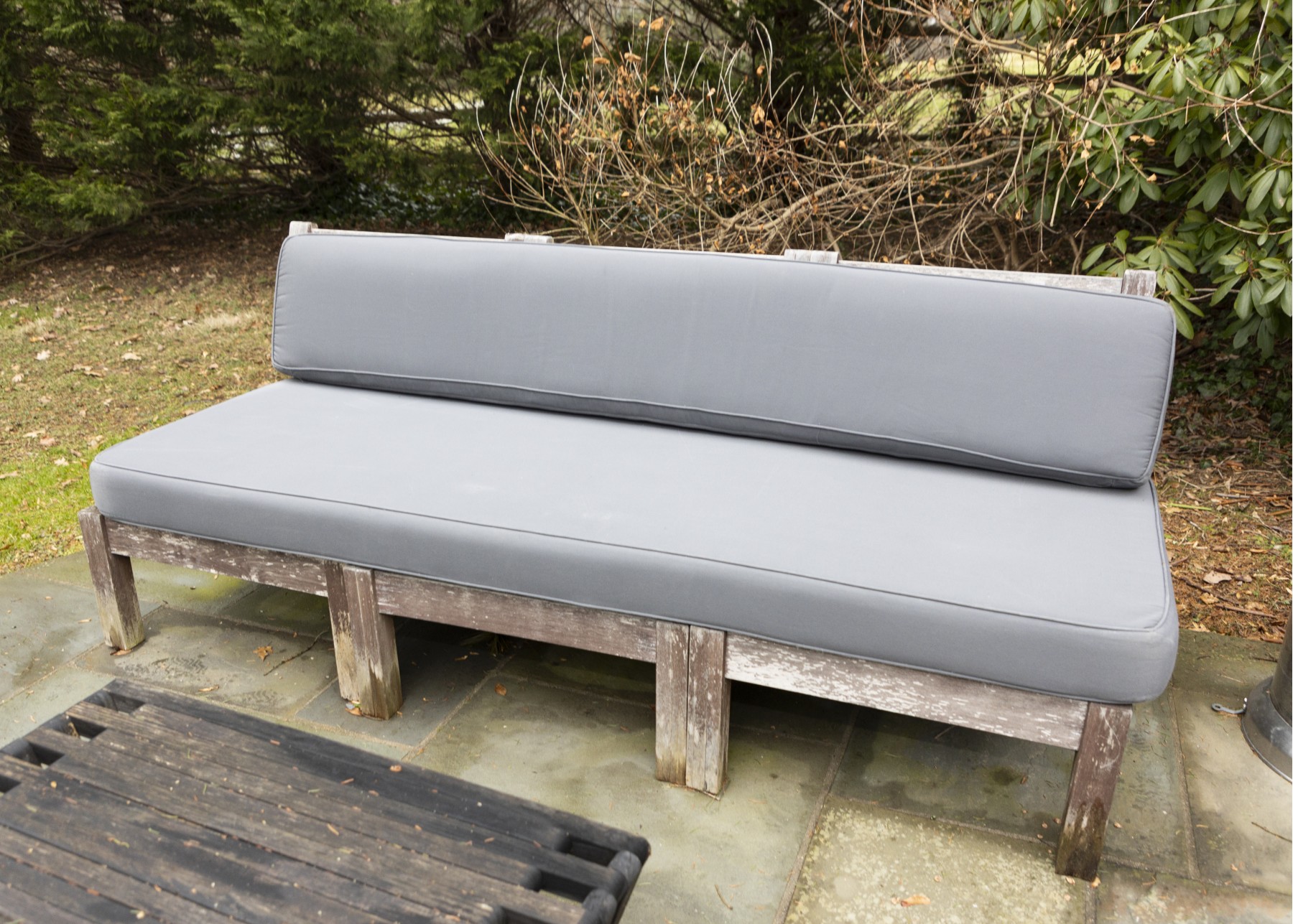 teak frame shows weathering and needs to be polished to bring back to life- cushion in good condition