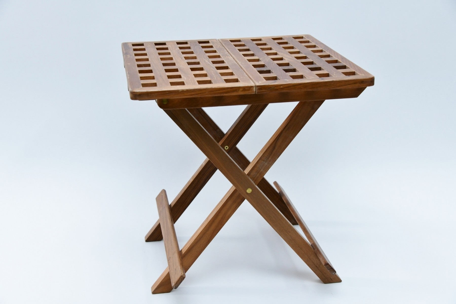 Folding wooden table with lattice top in the indent checkerboard arrangement.