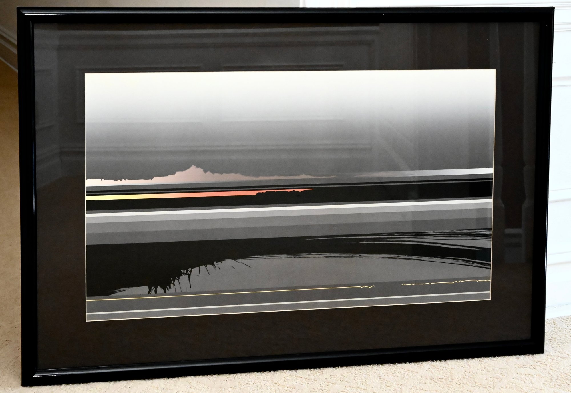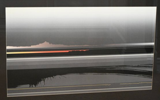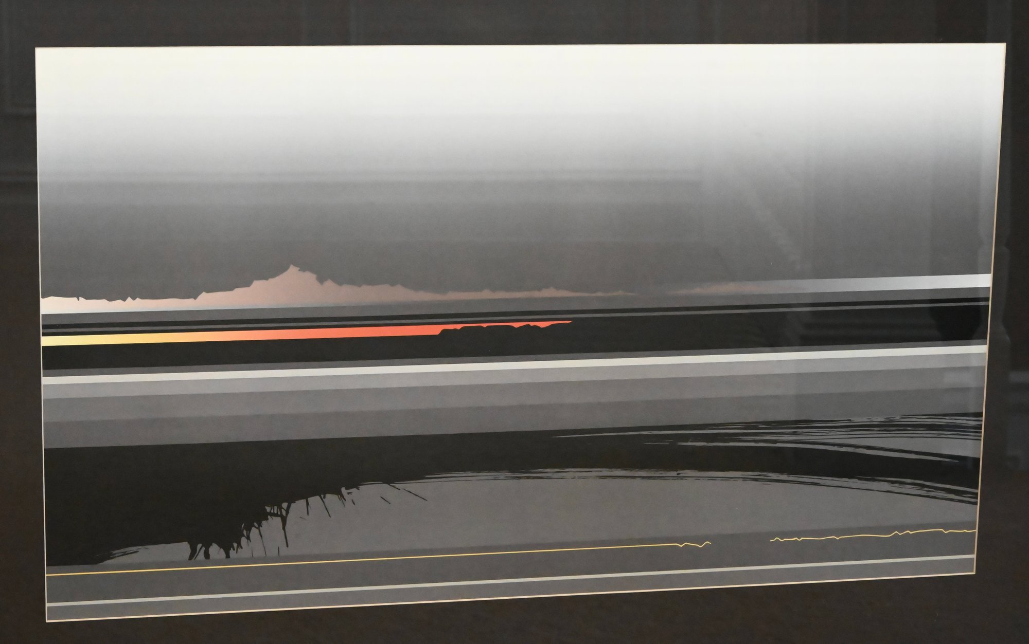 A horizontal abstract composition featuring layered bands of gray and black with a subtle central gradient and a vivid linear accent in red and yellow, creating a luminous horizon effect; presented in a dark frame with matting that emphasizes the sleek, modern aesthetic characteristic of Sawada’s minimalist style.