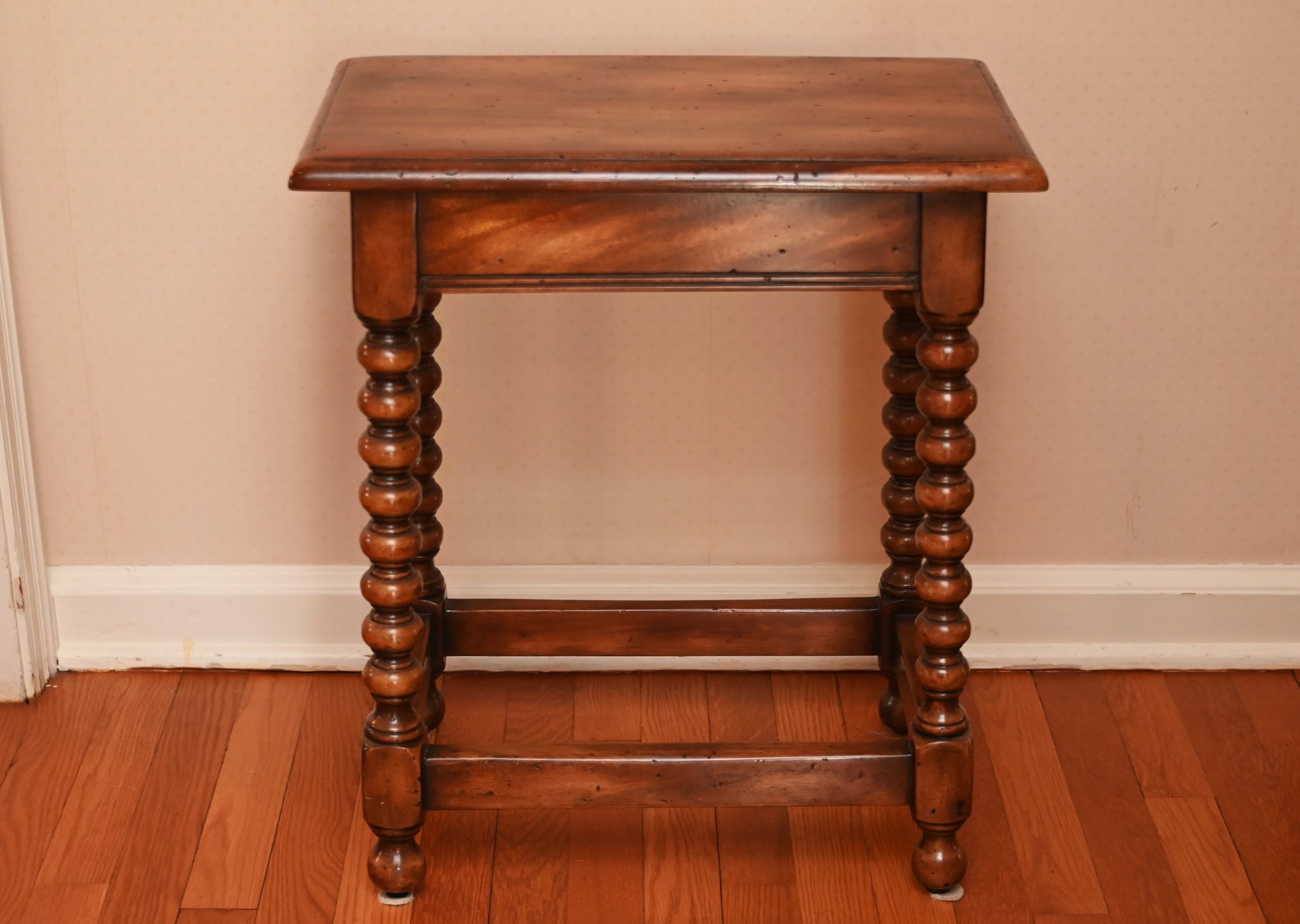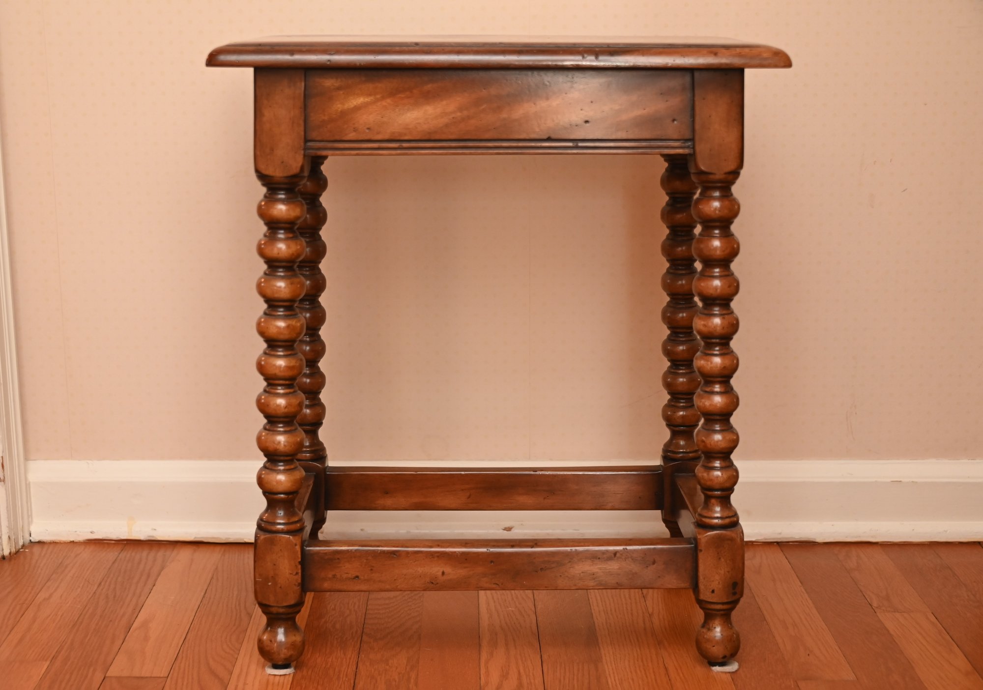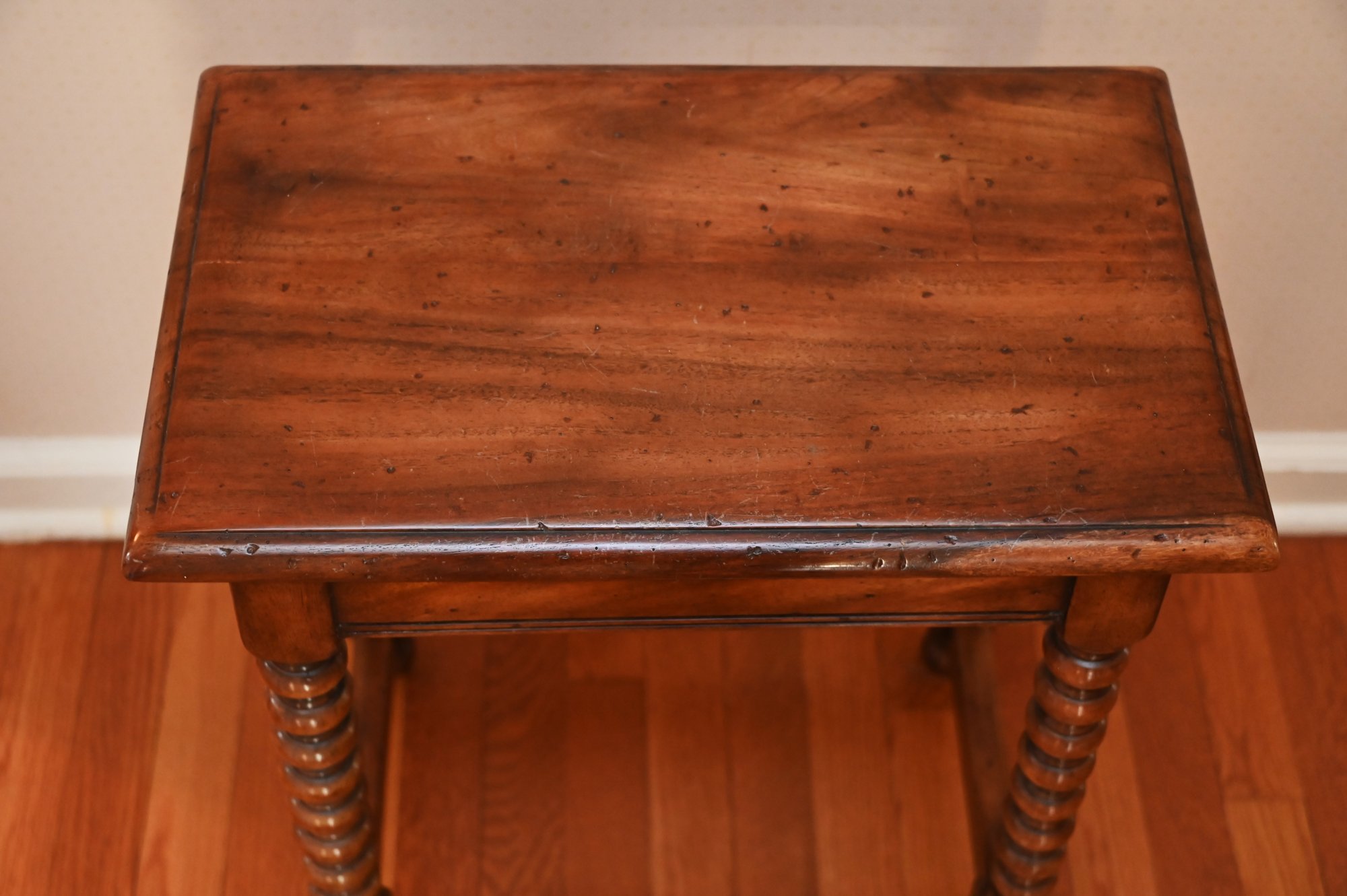 beautifully crafted design featuring barley twist legs, a style that became popular in 17th-century English and French furniture. The table has a smooth, rectangular top with softly rounded edges and a warm, rich wood finish that highlights the natural grain.