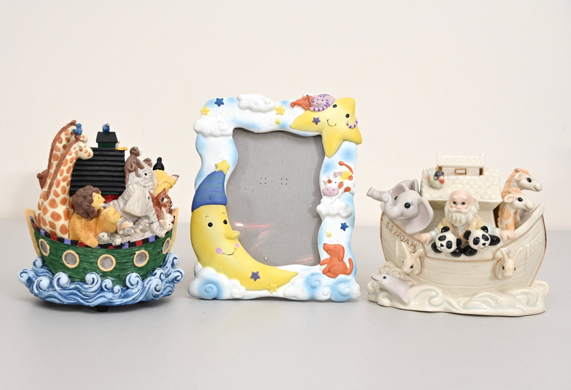 This charming collection features two Noah’s Ark-themed figurines and a whimsical moon and star picture frame, perfect for nursery decor, children's rooms, or collectors of biblical or animal-themed figurines.