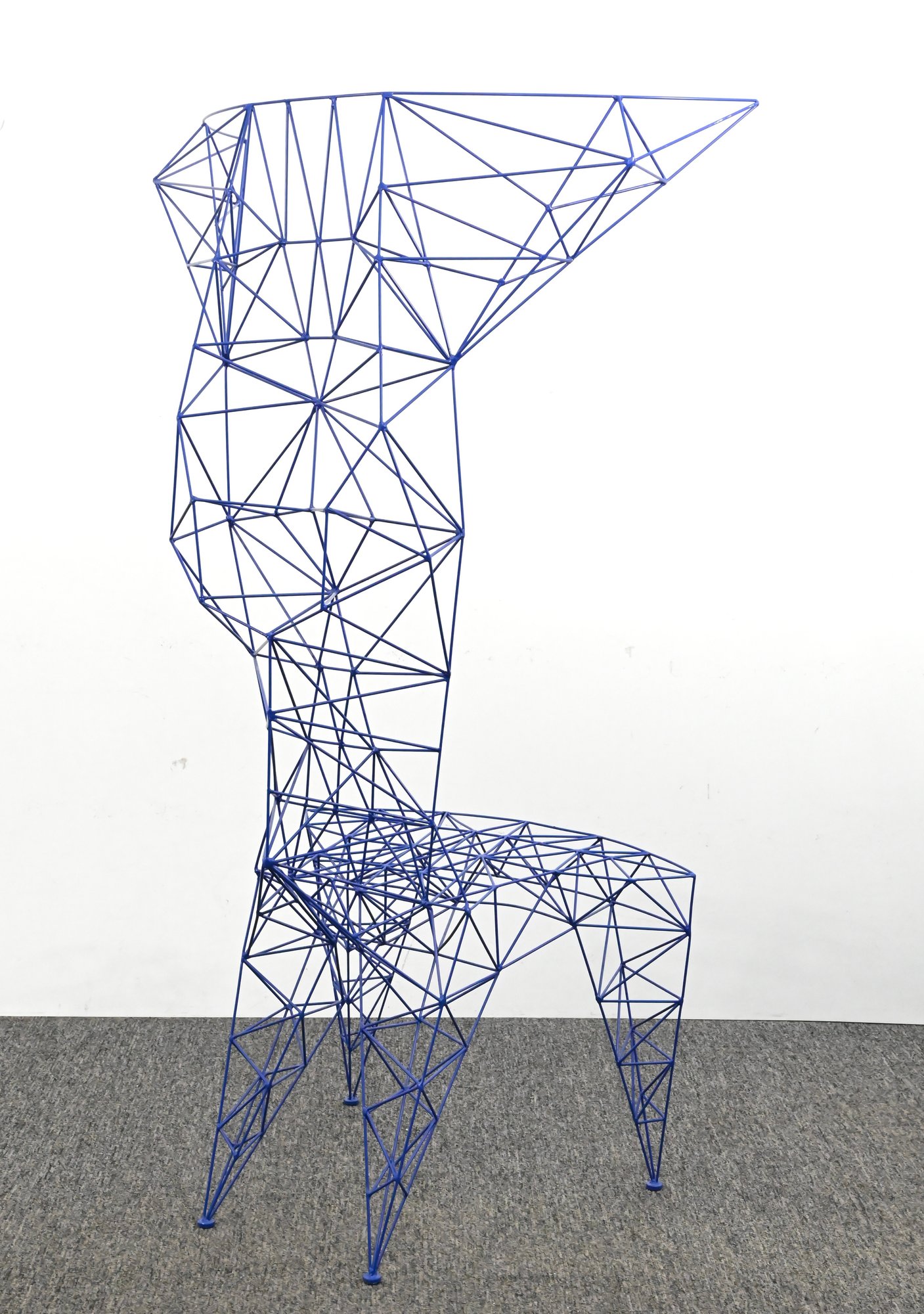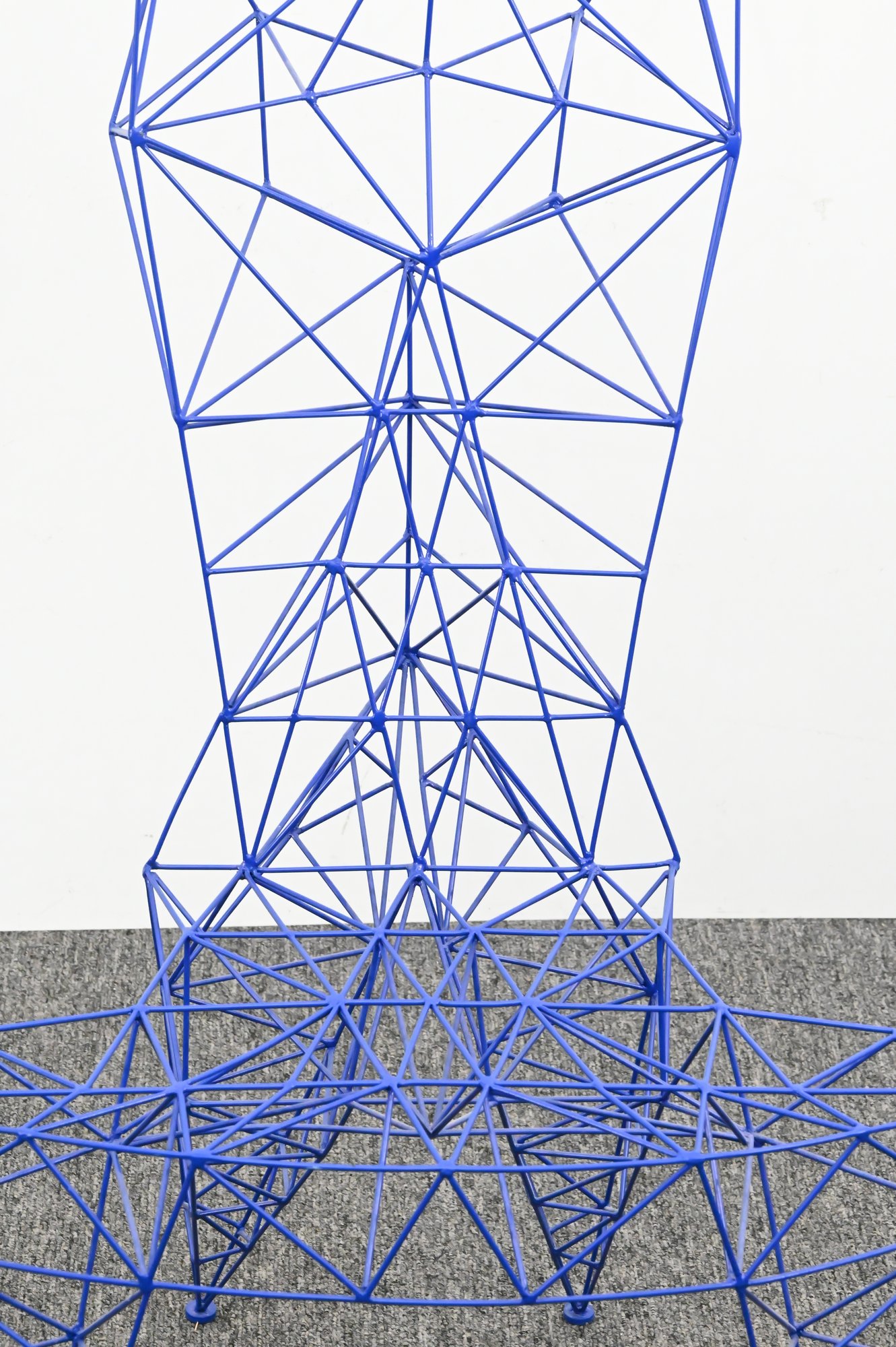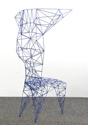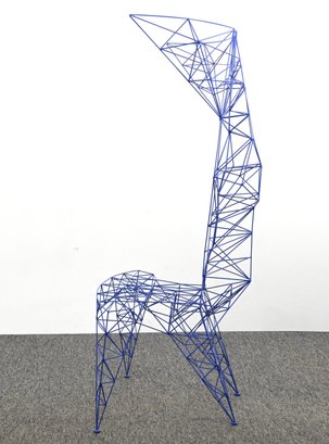 Iconic Pylon chair designed by Tom Dixon, constructed from welded steel rods in a striking blue powder-coated finish. The geometric, open-frame structure forms a sculptural silhouette with angular lines and a distinctive high back. A bold example of Dixon’s industrial, architectural design approach.