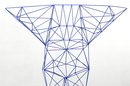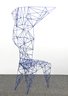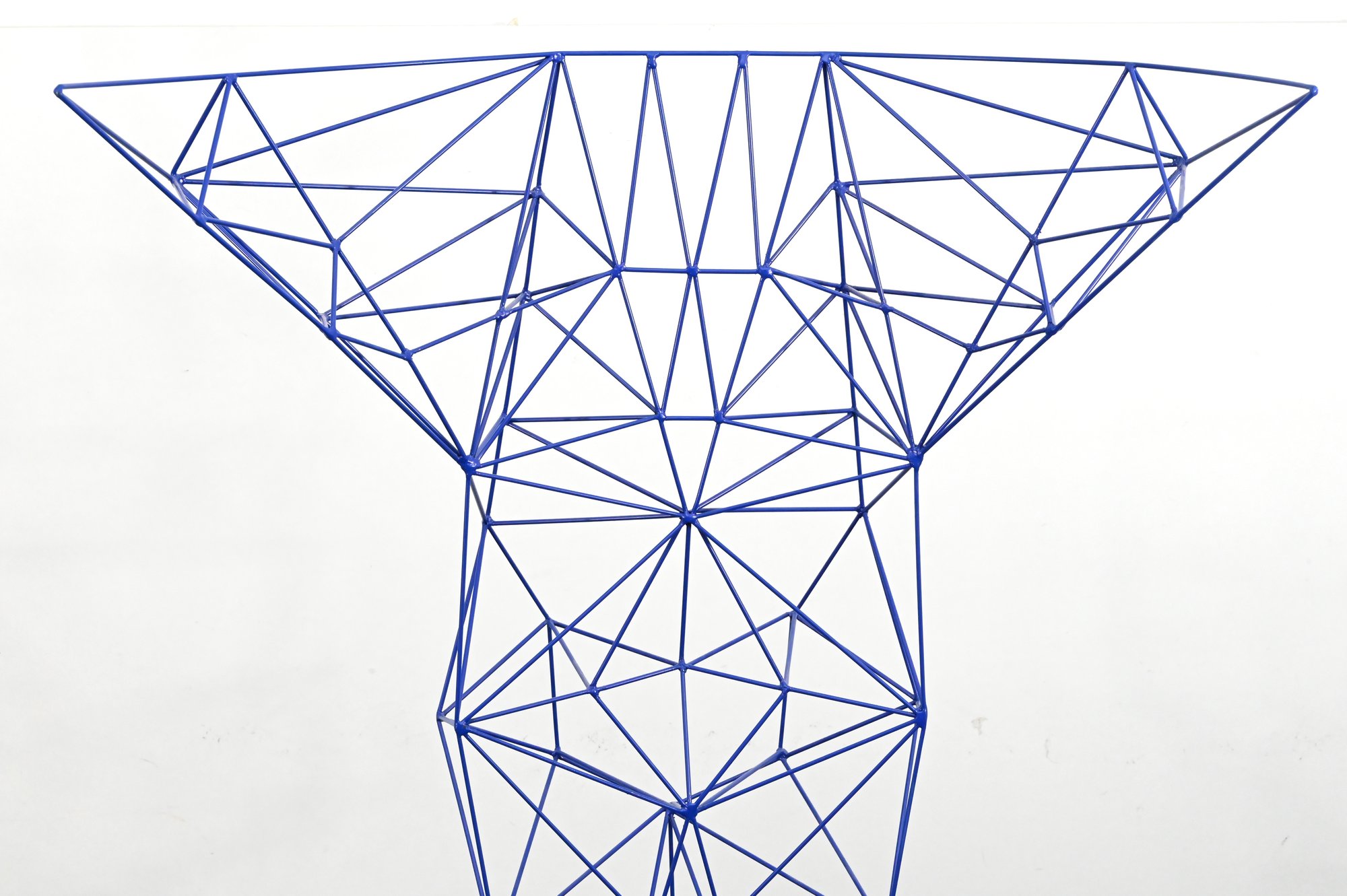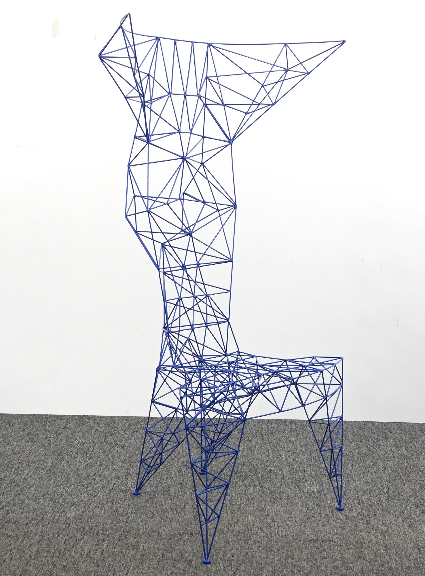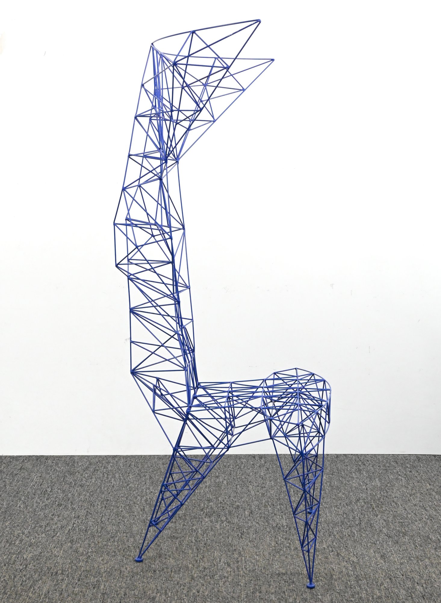 Iconic Pylon chair designed by Tom Dixon, constructed from welded steel rods in a striking blue powder-coated finish. The geometric, open-frame structure forms a sculptural silhouette with angular lines and a distinctive high back. A bold example of Dixon’s industrial, architectural design approach.