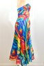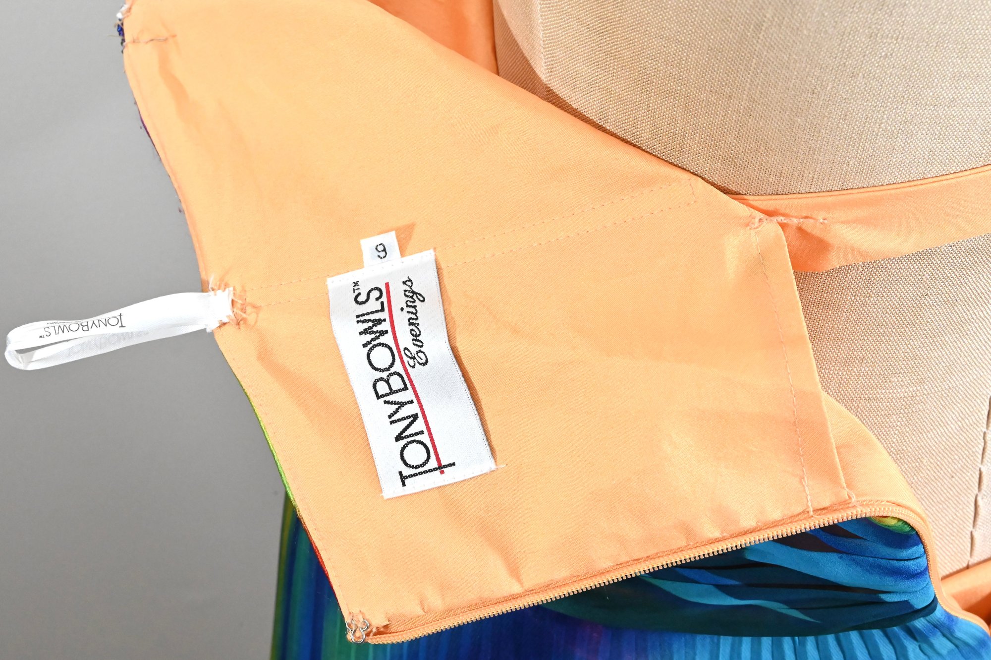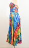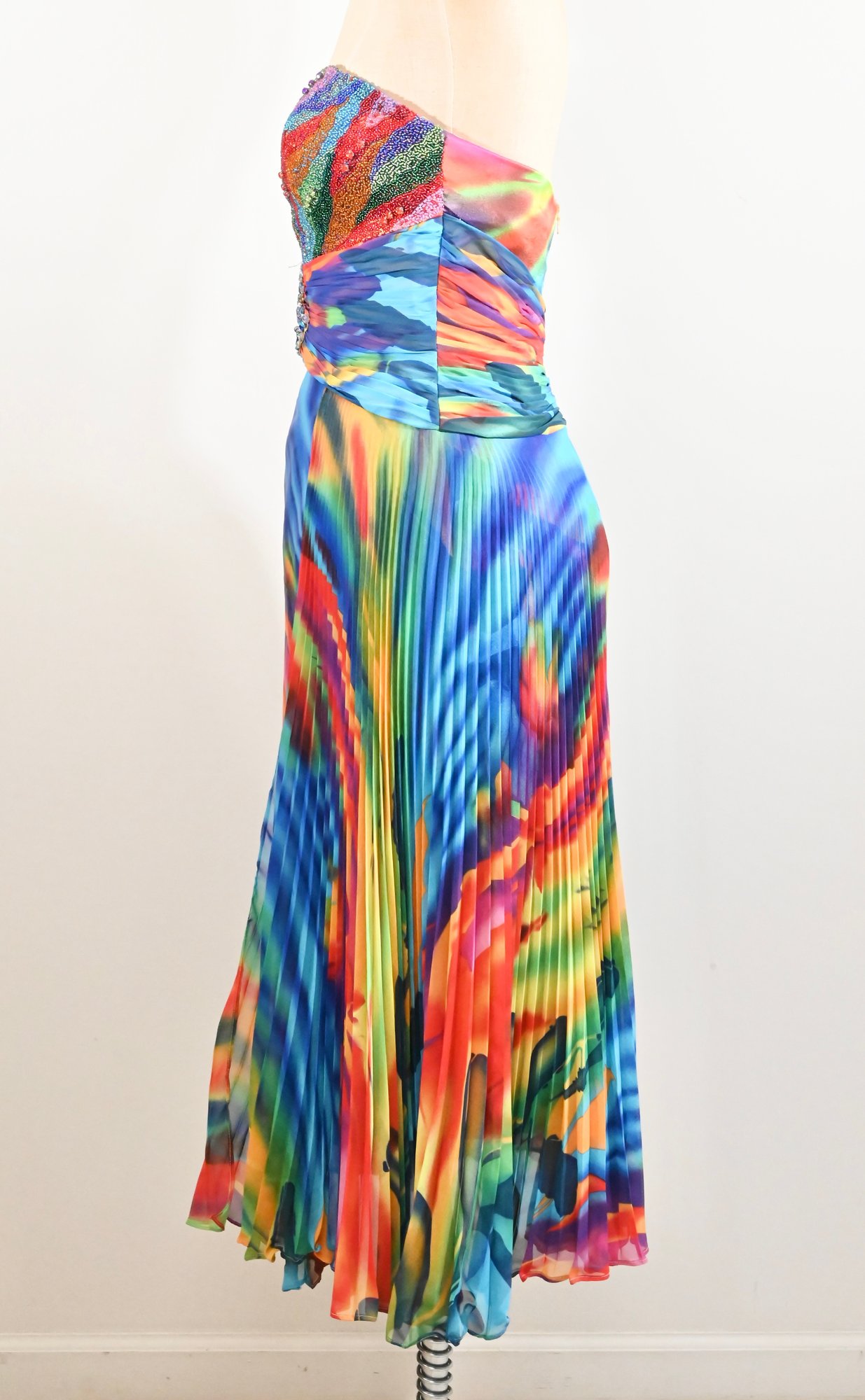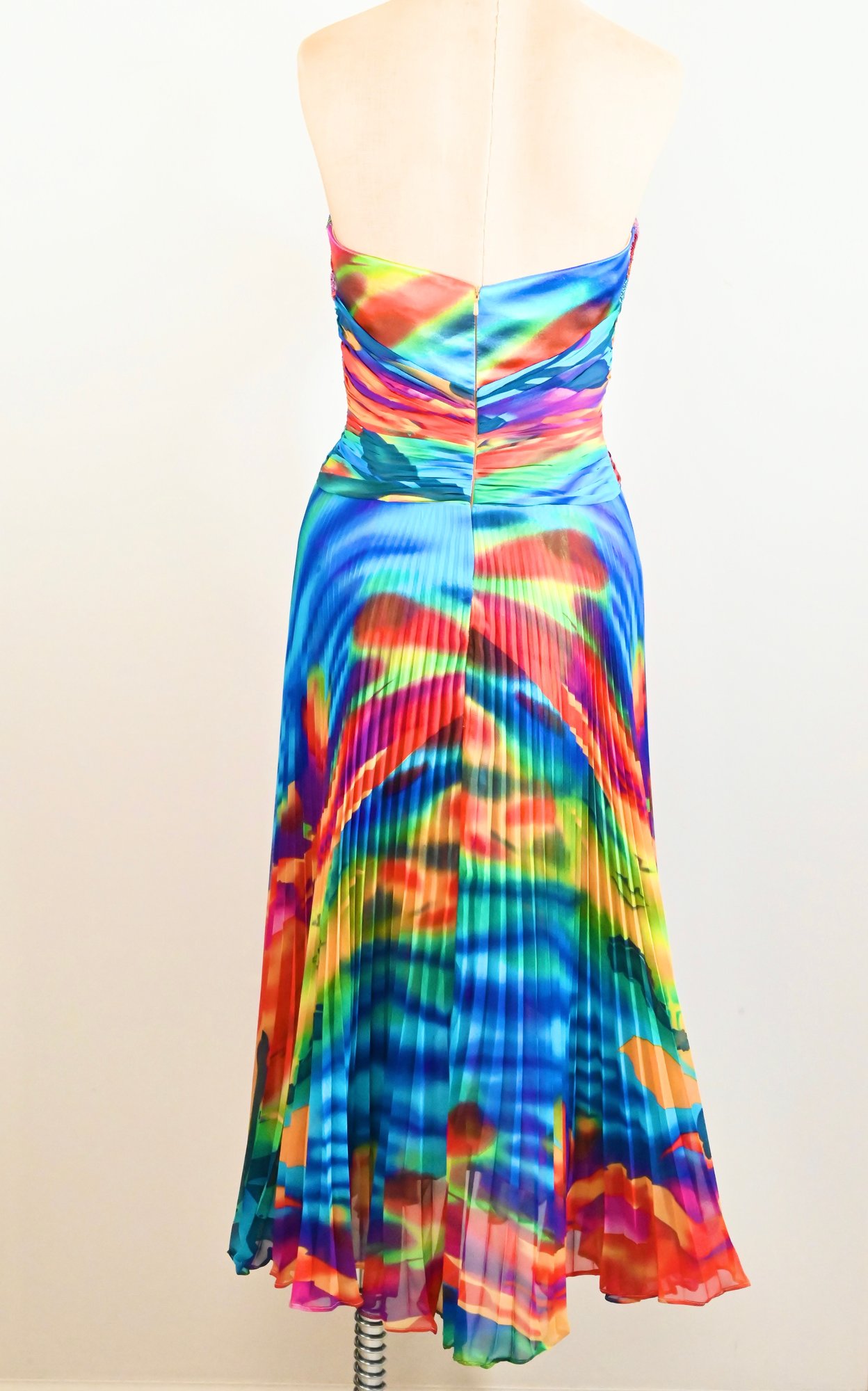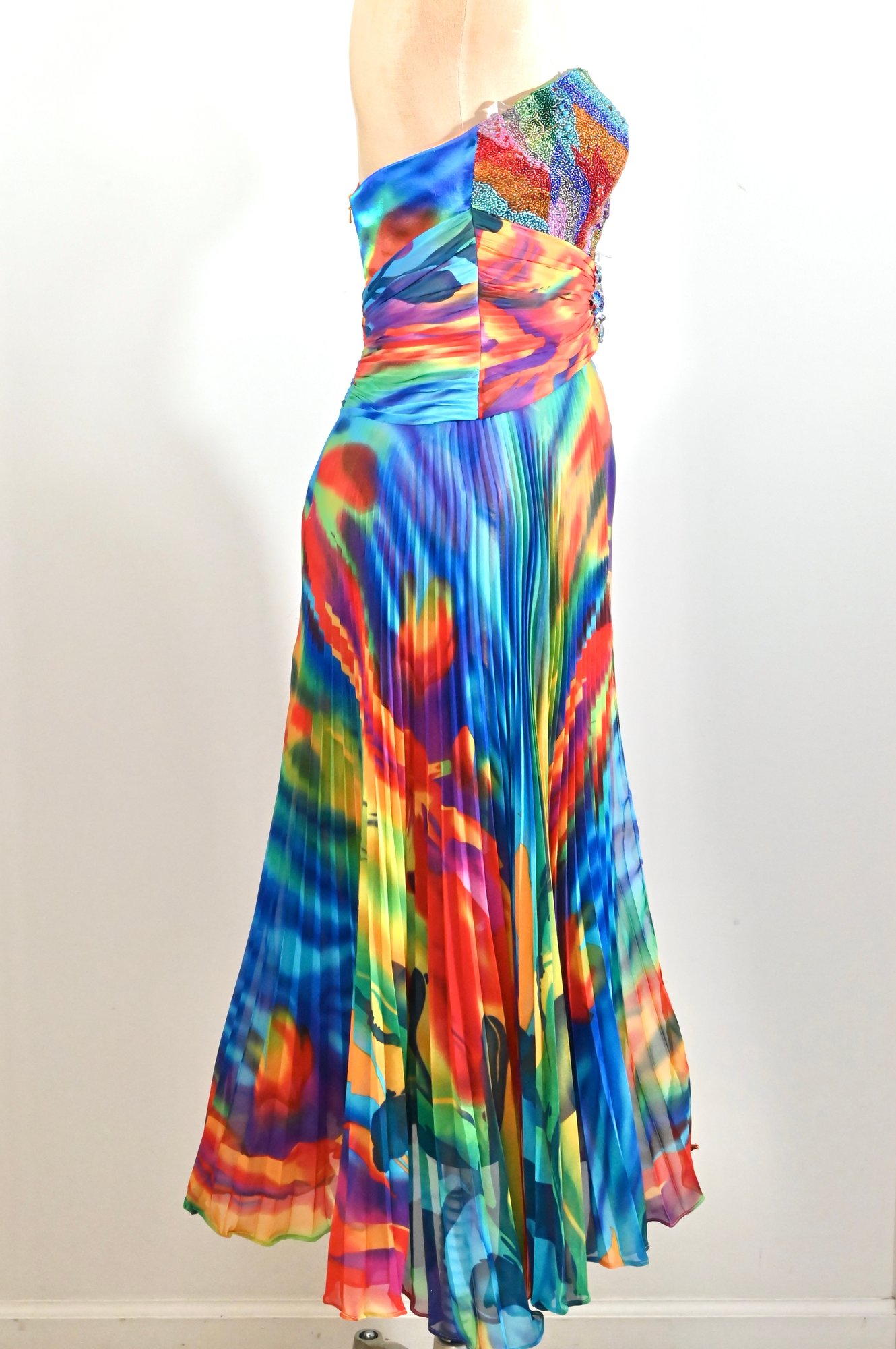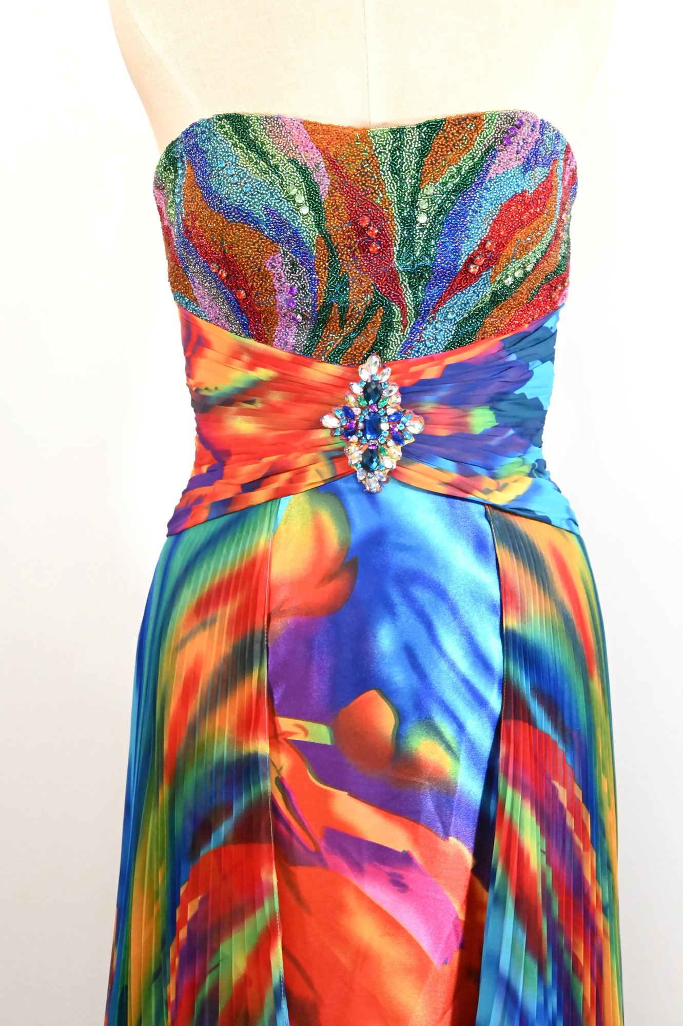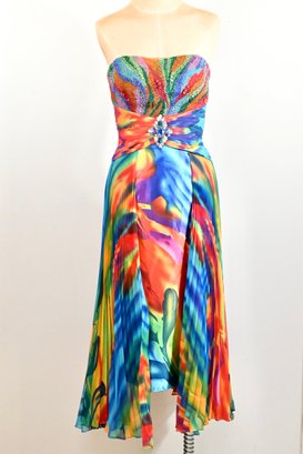 Stunning Tony Bowls Evenings strapless formal dress featuring a vibrant multicolor abstract print skirt with a flowing, pleated high-low hem. The bodice is beautifully embellished with intricate beadwork in coordinating rainbow tones. Accented at the waist with a ruched satin band and jeweled brooch centerpiece for added sparkle and definition. Structured interior with zipper back closure. A standout gown perfect for prom, pageants, galas, or special occasions.
