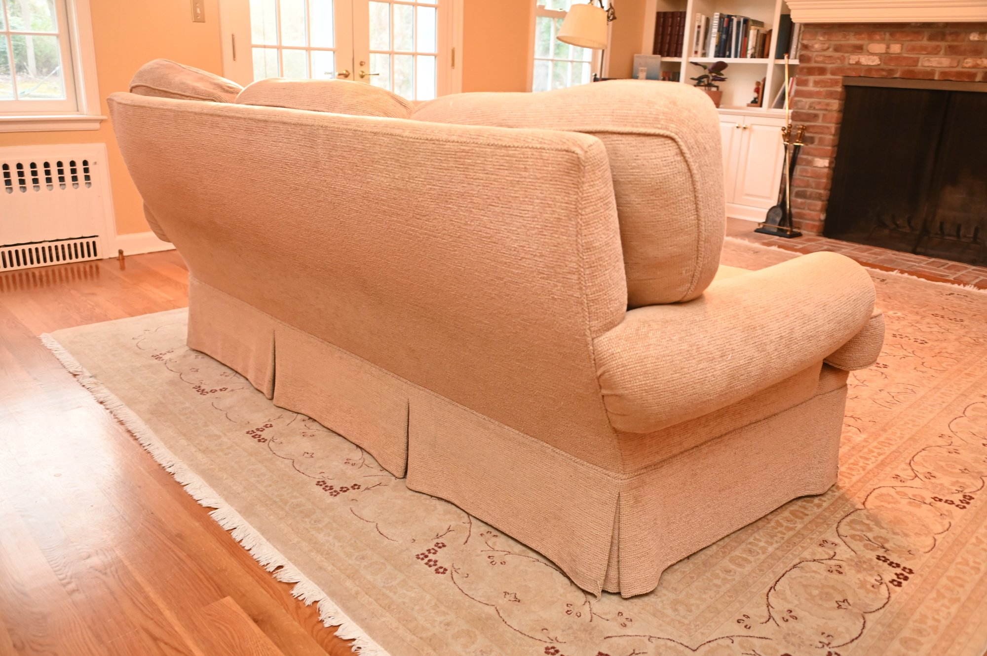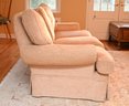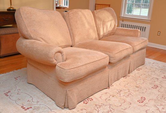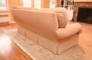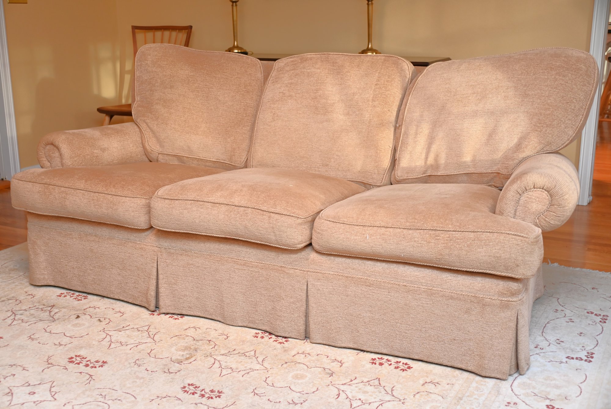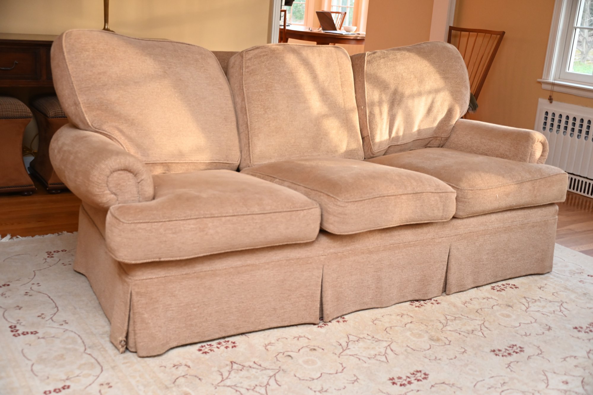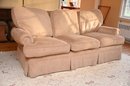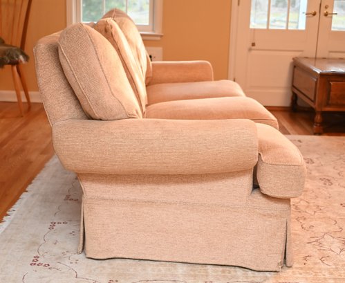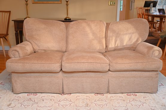 This is a traditional three-seat upholstered sofa with a classic rolled-arm design. The sofa is covered in a soft, textured beige fabric, giving it a warm and inviting appearance. The plush, overstuffed back cushions provide comfort. The seat cushions are thick and removable, and the base features a tailored skirt, concealing the legs for a more refined look