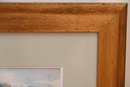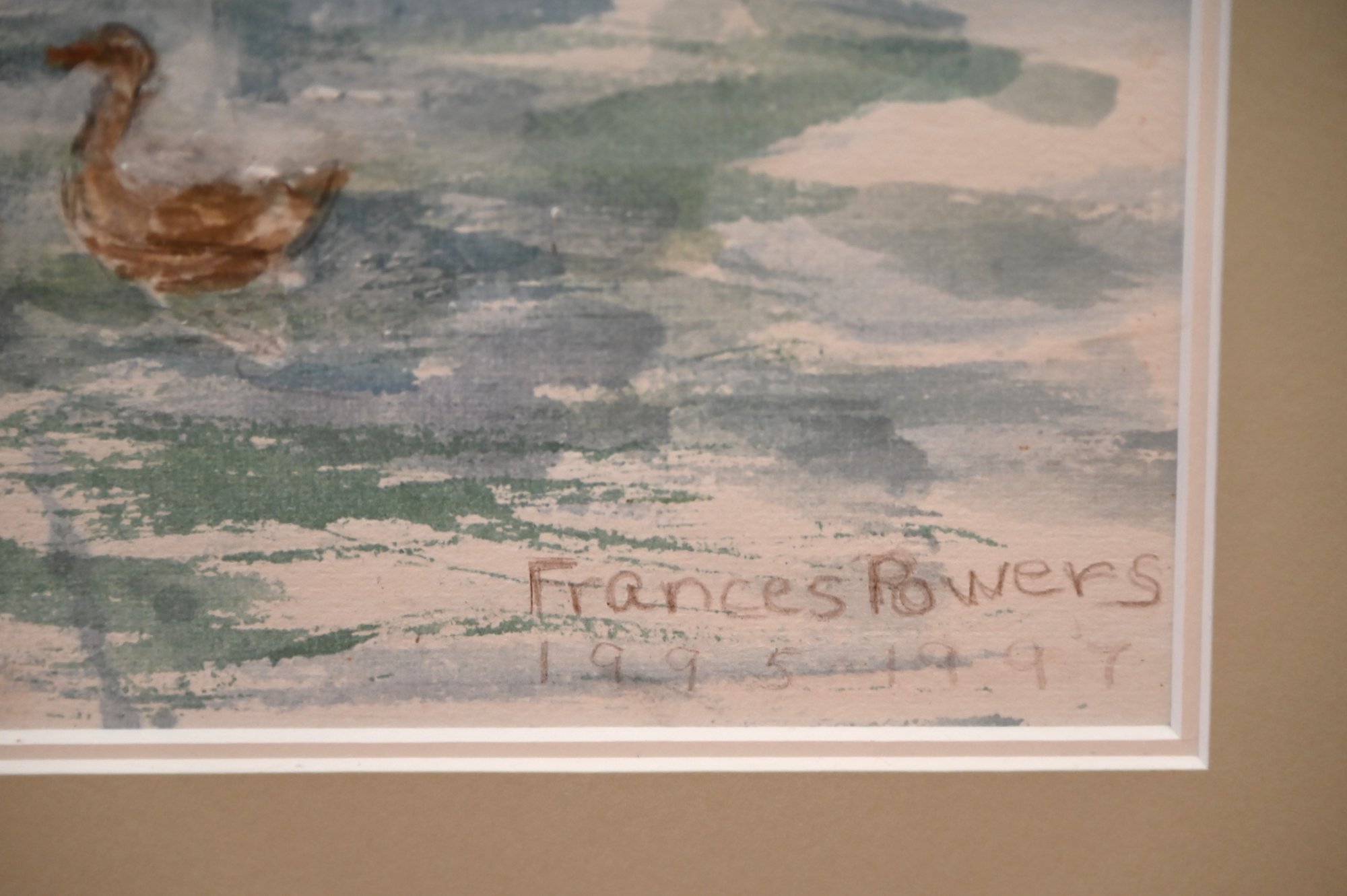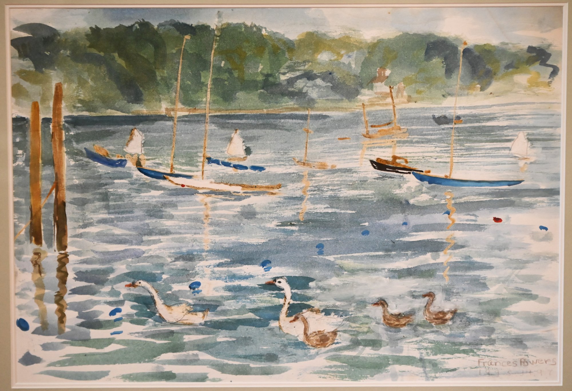 This is a framed watercolor painting depicting a tranquil harbor scene with sailboats, waterfowl, and reflections on the water. The artist, Frances Powers, has captured the movement and light of the water using fluid brushstrokes and a soft color palette dominated by shades of blue, green, and earthy tones.