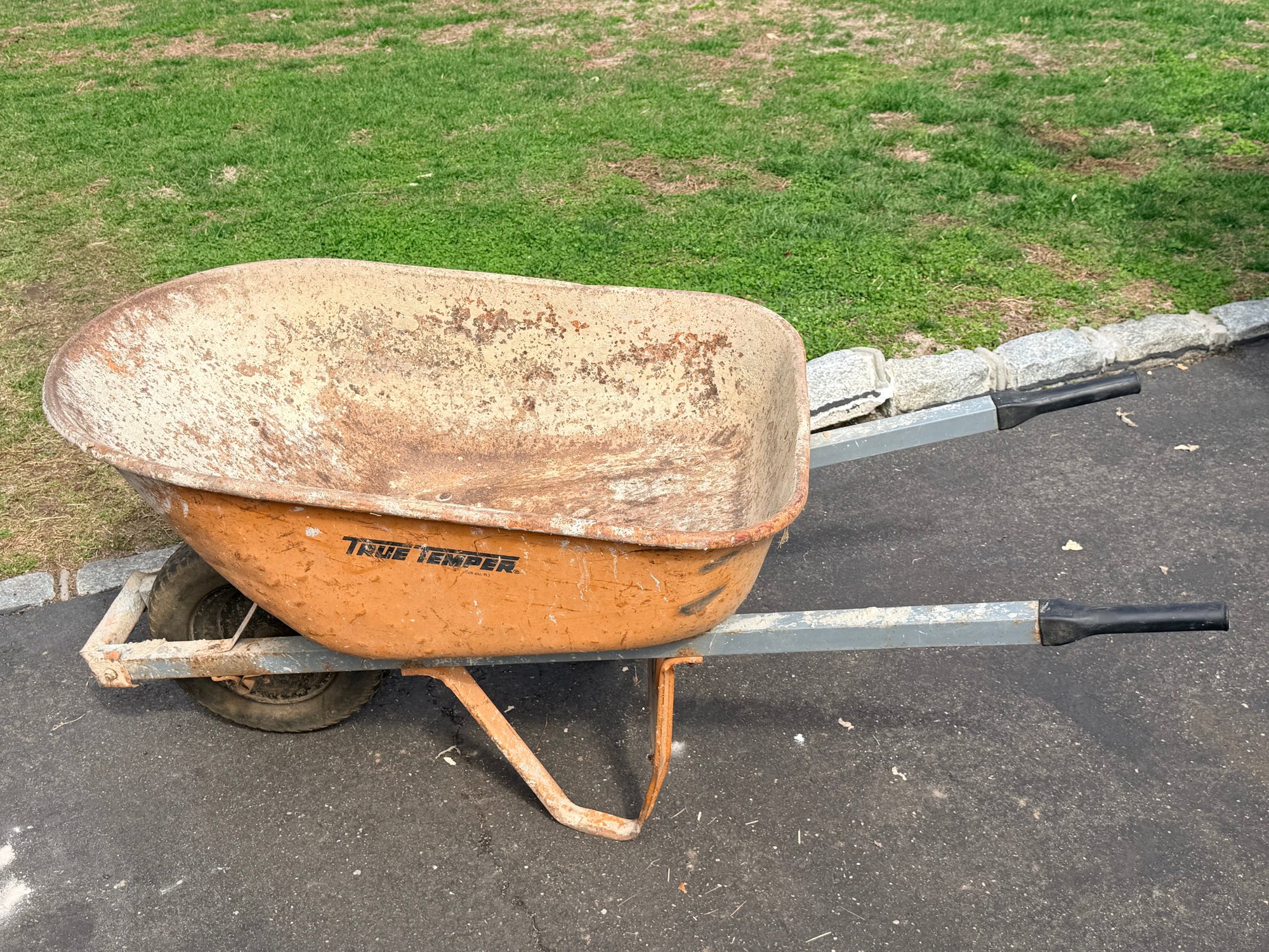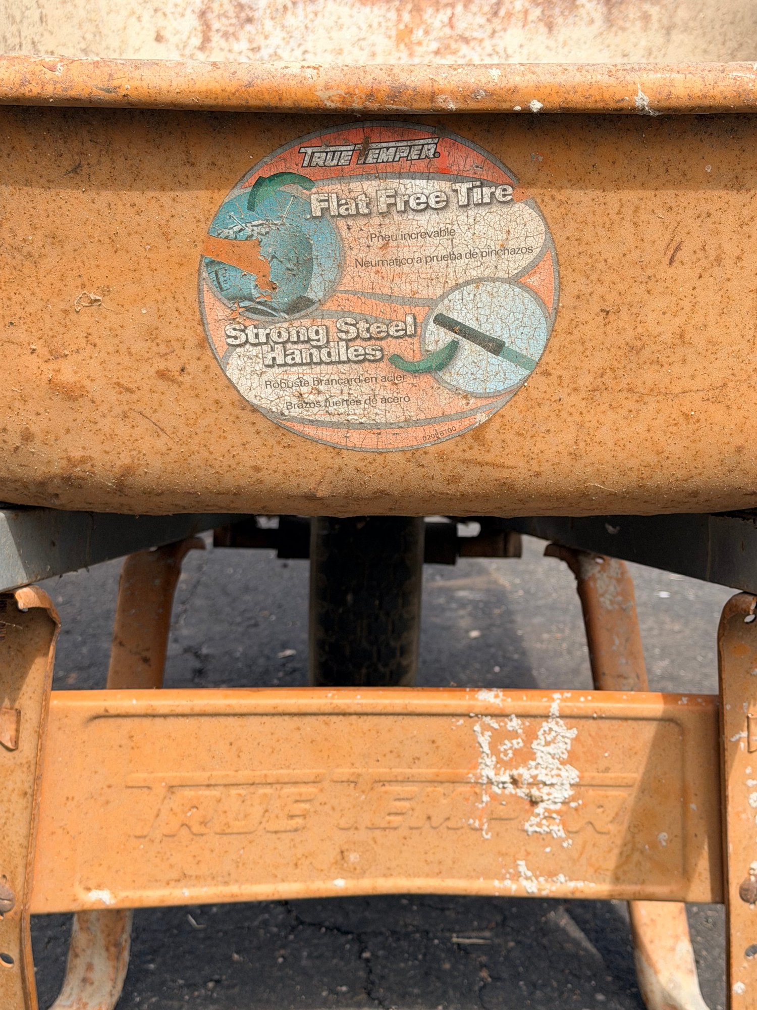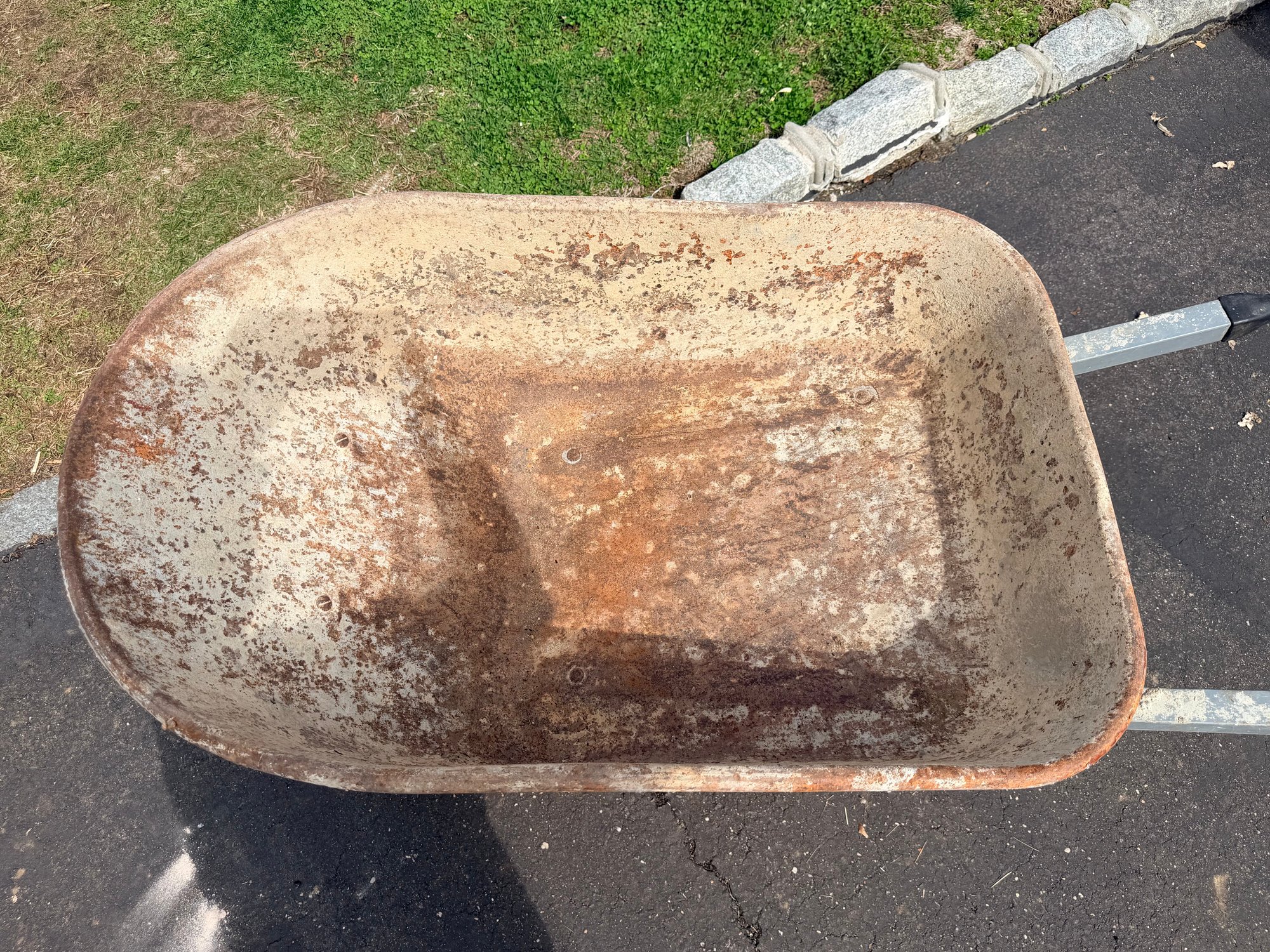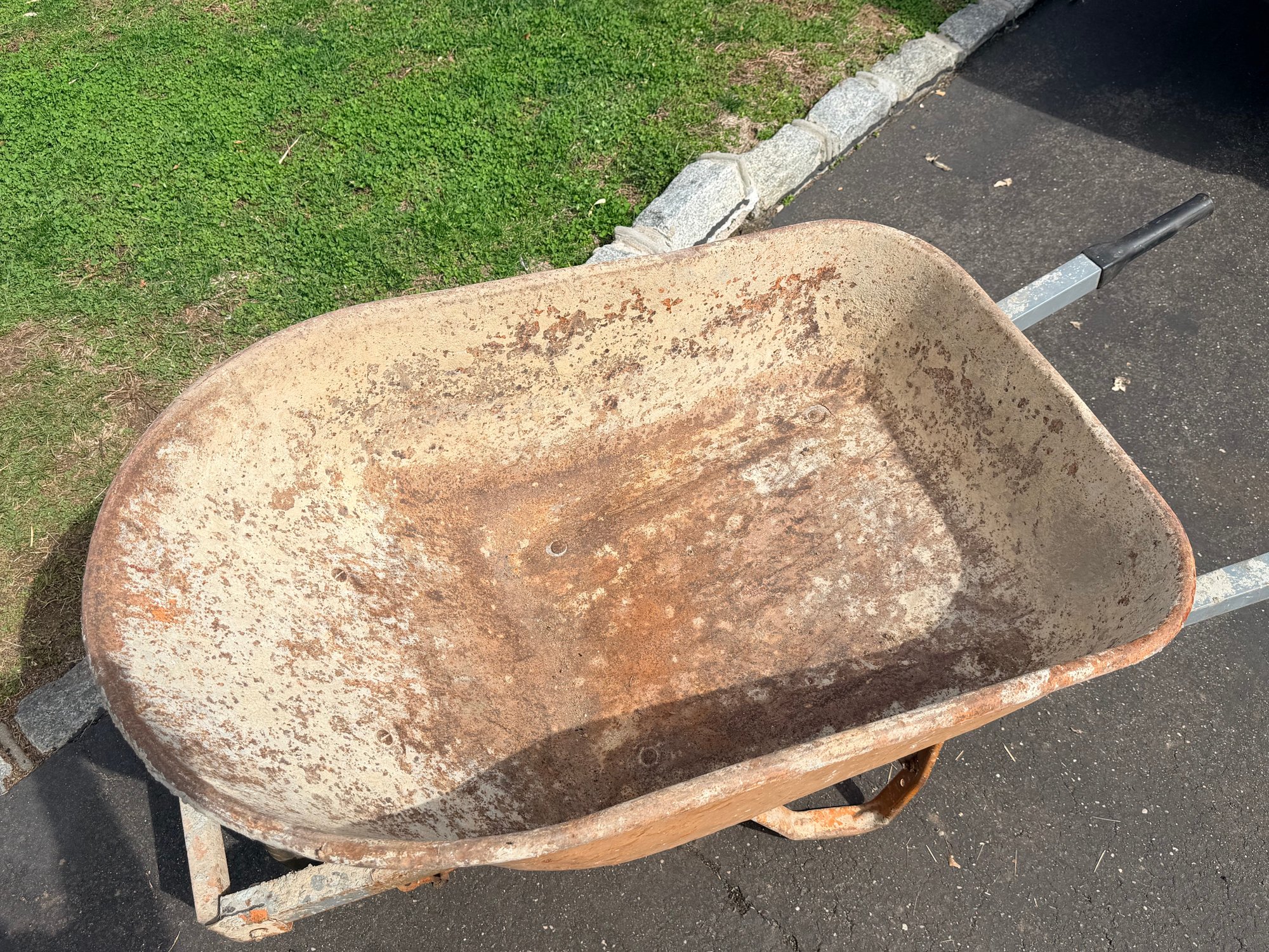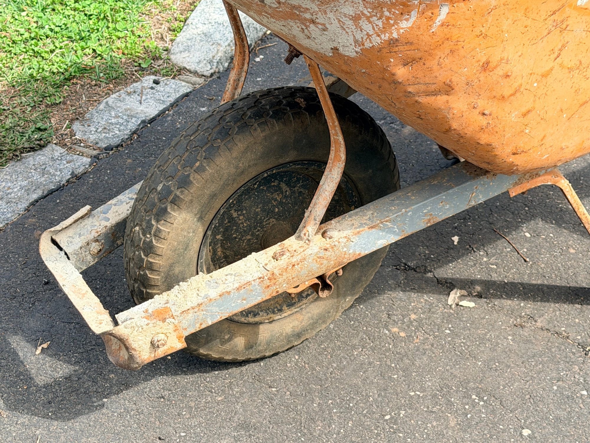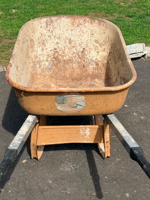 Fair used condition with noticeable rust, paint wear, and surface corrosion inside and along the rim of the basin, along with general wear to the frame and wheel; remains functional and sturdy for continued use.