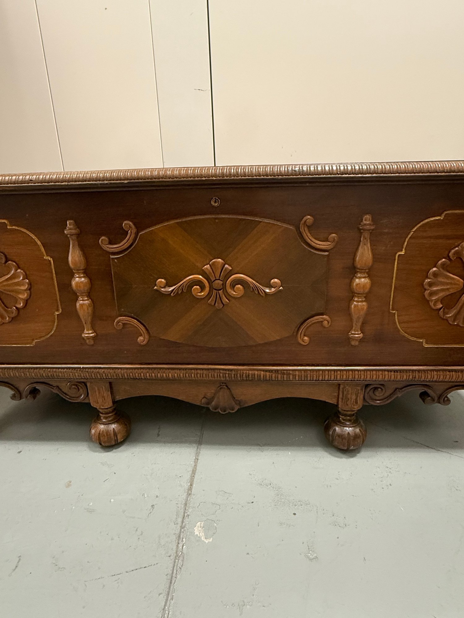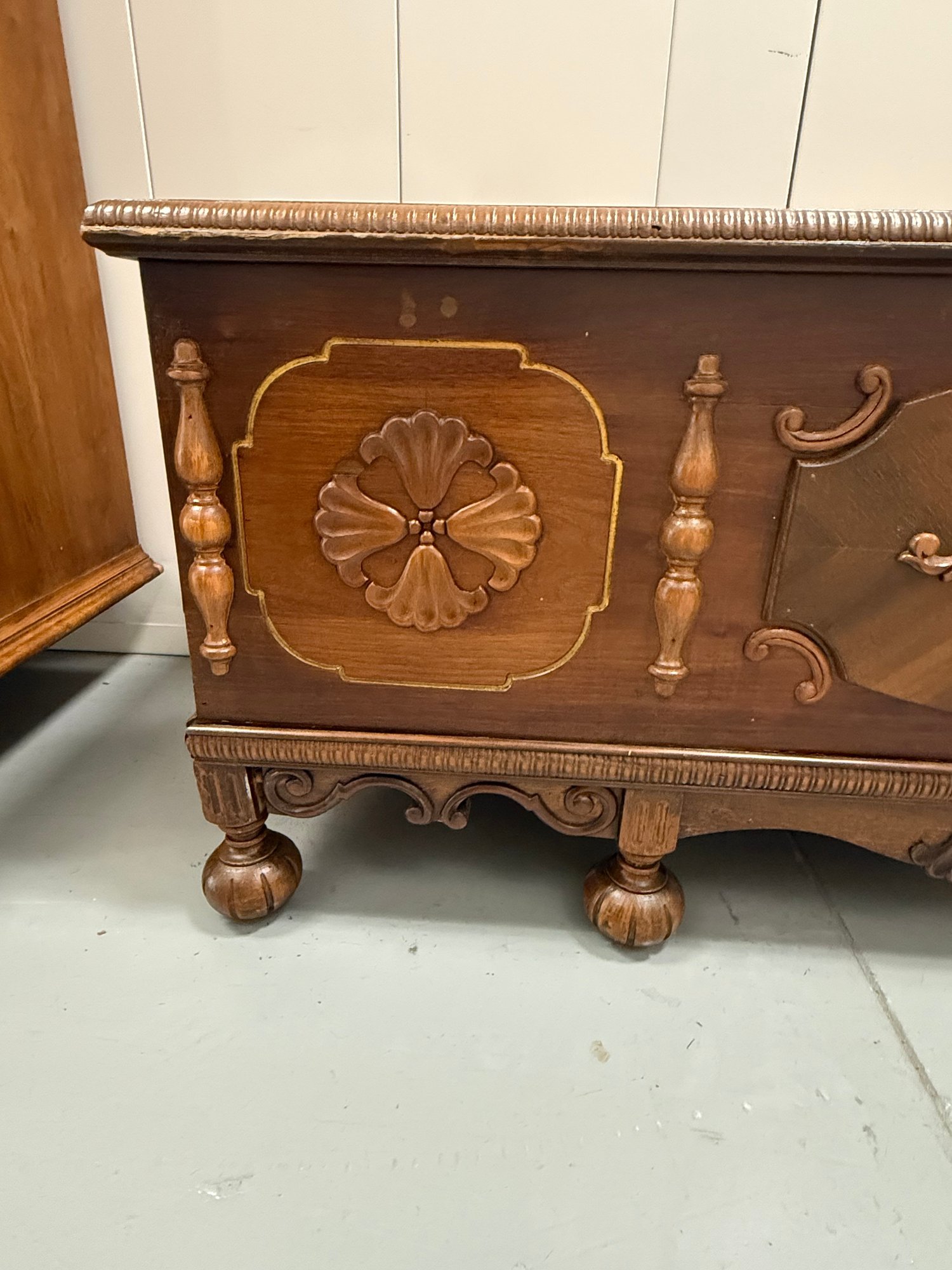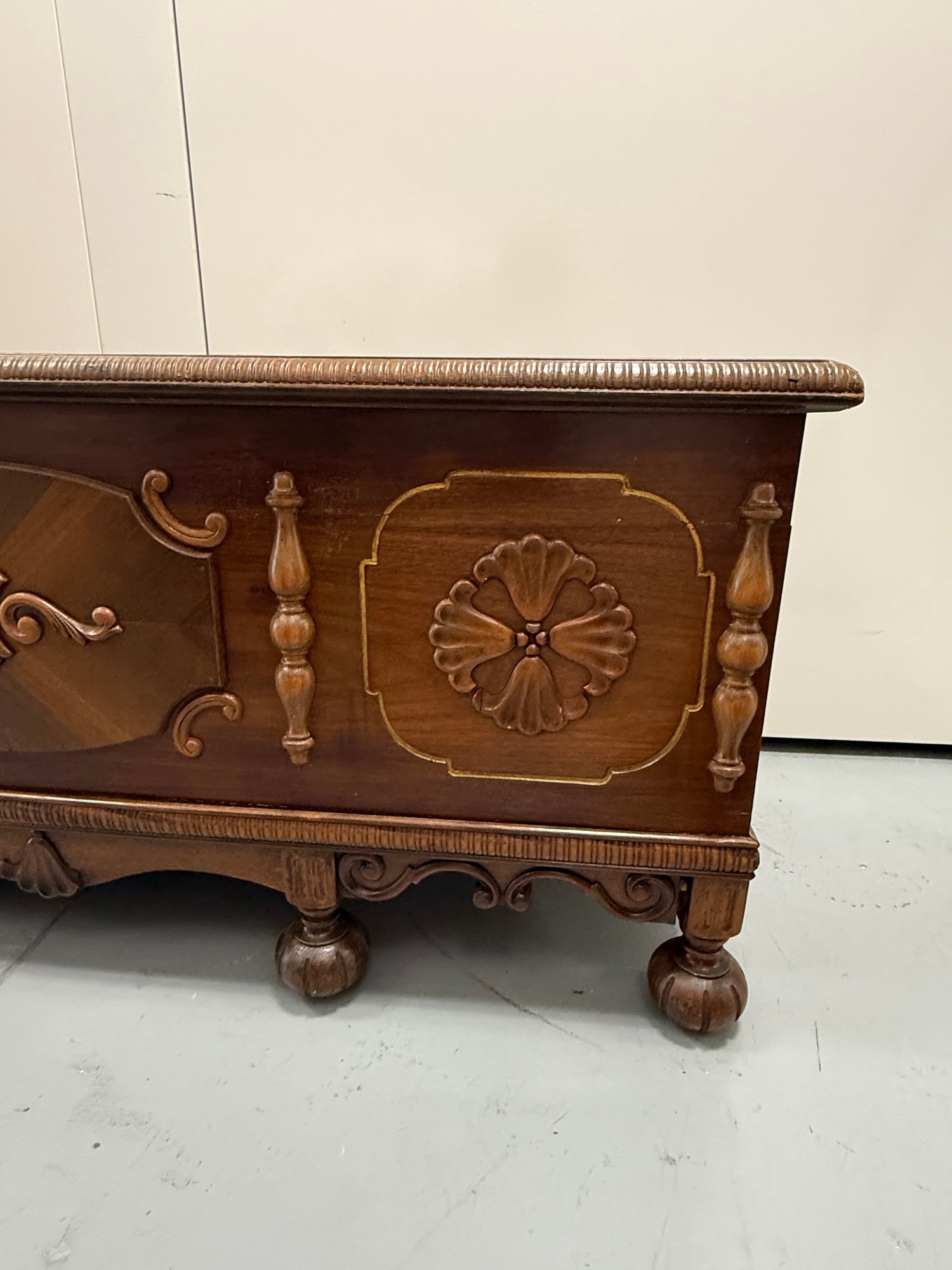 Vintage 1930s Tudor-style carved wooden blanket or hope chest, featuring a richly finished exterior with decorative panels, a cedar-lined interior, ornate legs, and a scalloped apron.