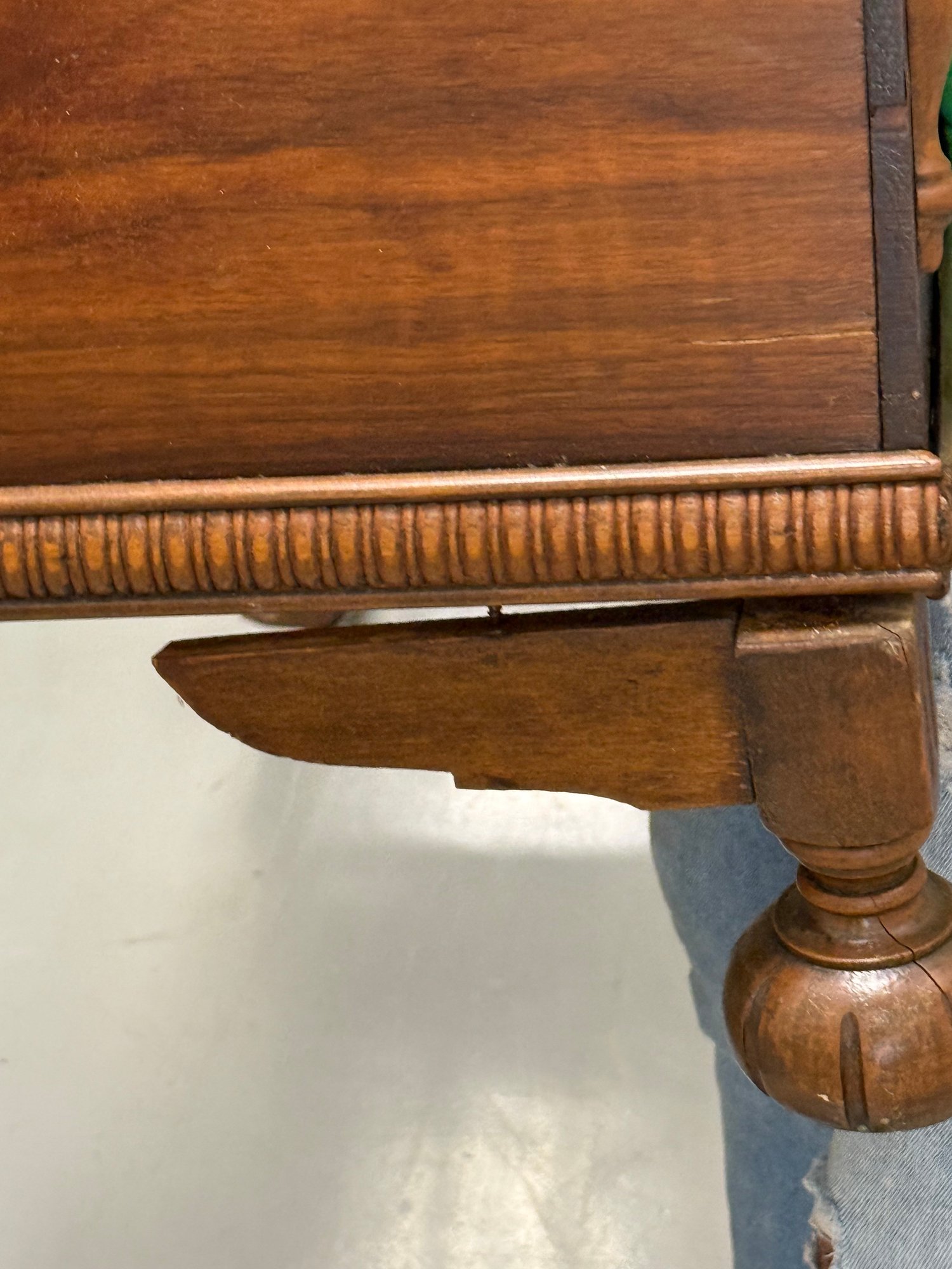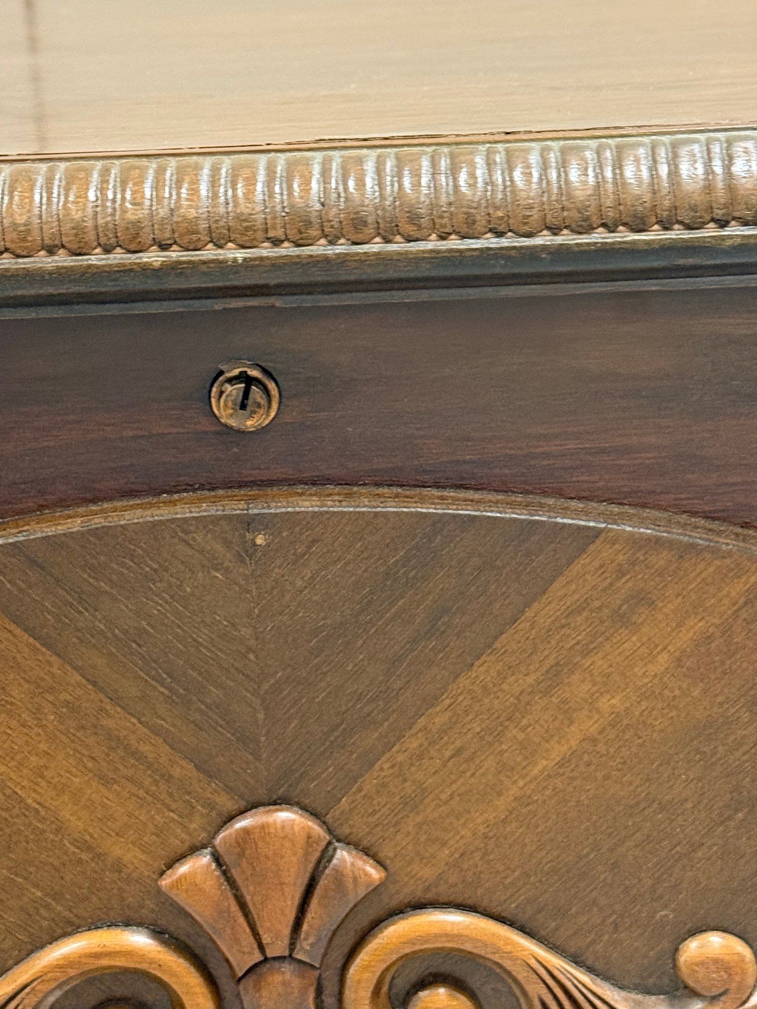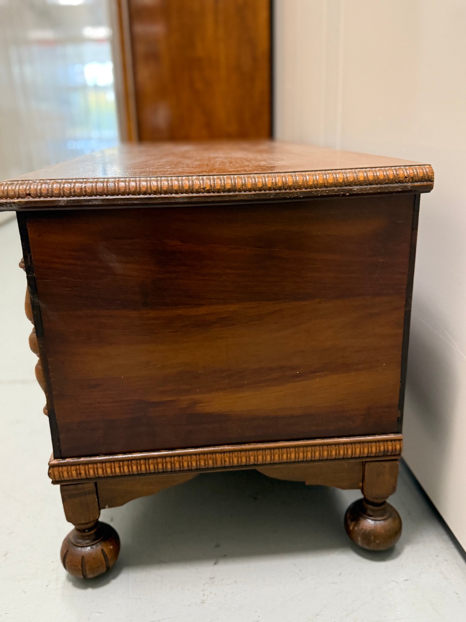 Vintage 1930s Tudor-style carved wooden blanket or hope chest, featuring a richly finished exterior with decorative panels, a cedar-lined interior, ornate legs, and a scalloped apron.