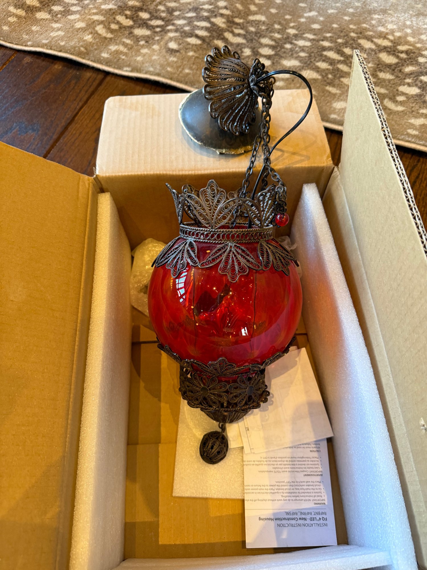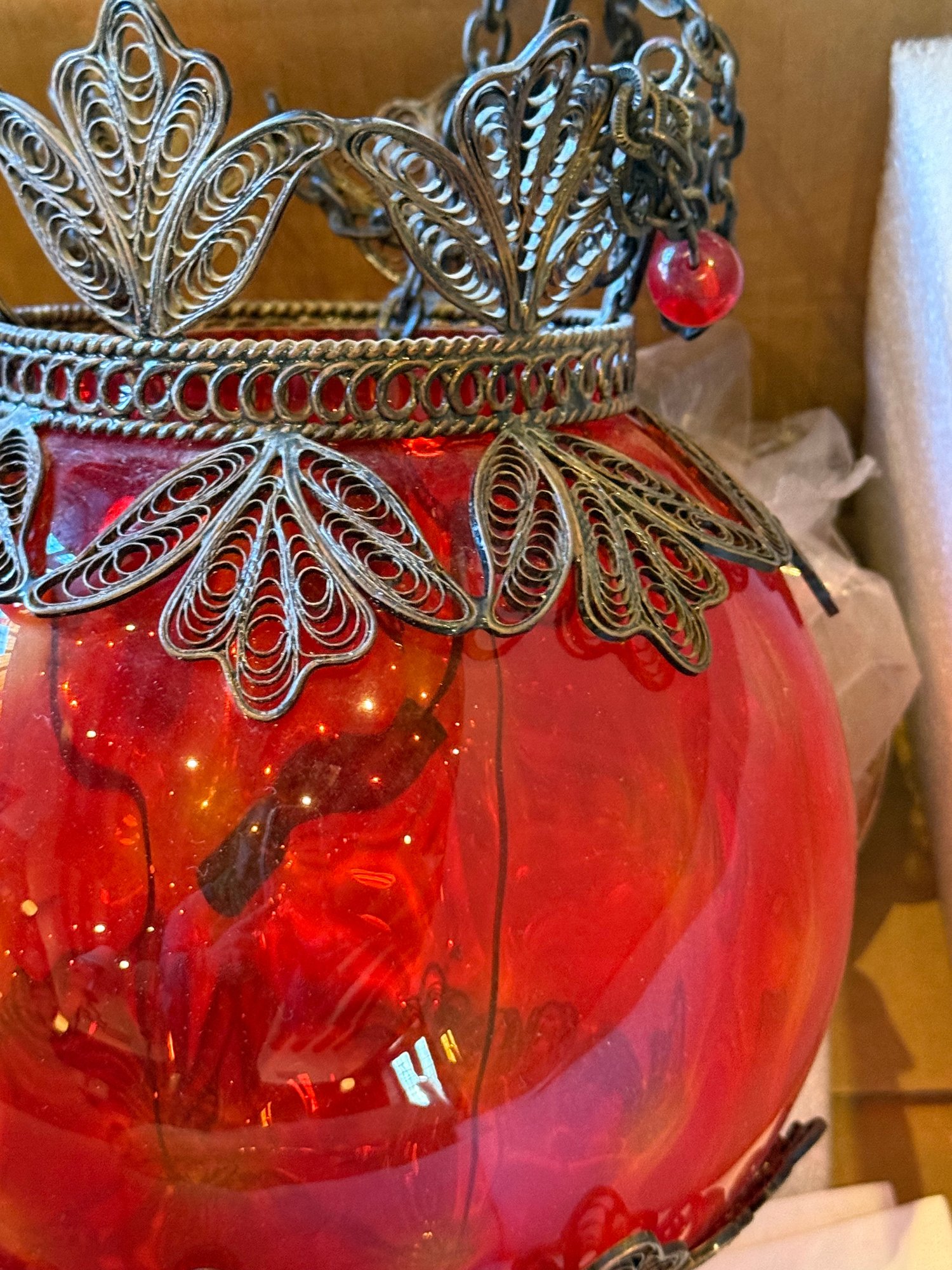 Turkish or Moroccan ornate hanging lantern with a vibrant red glass globe encased in intricate leaf- and floral-motif metalwork.