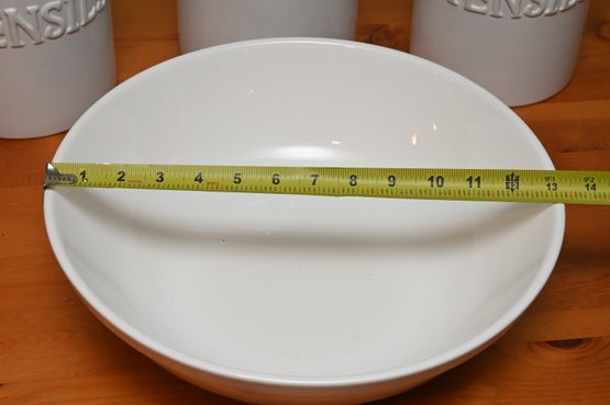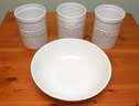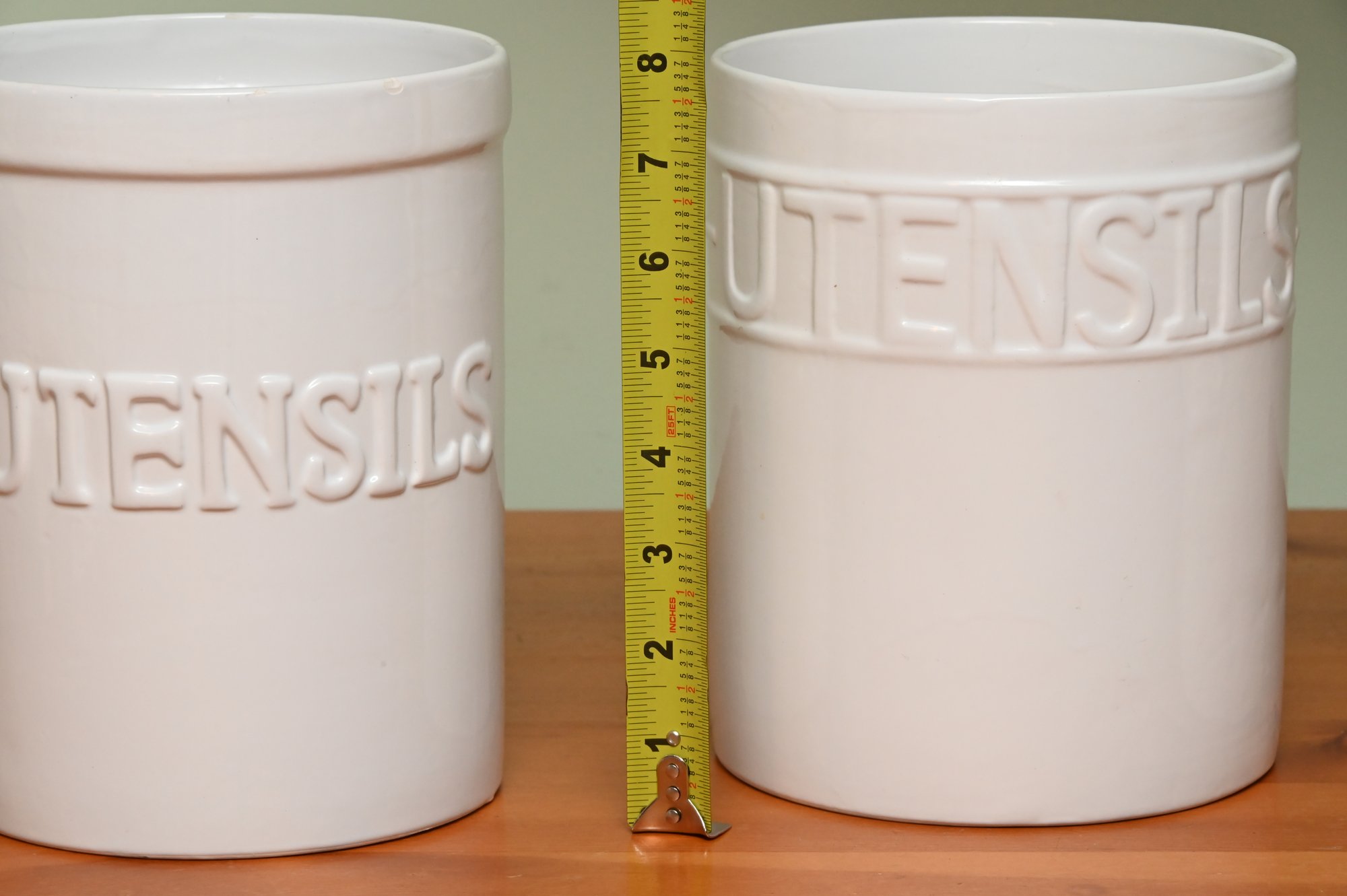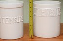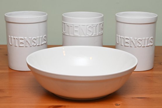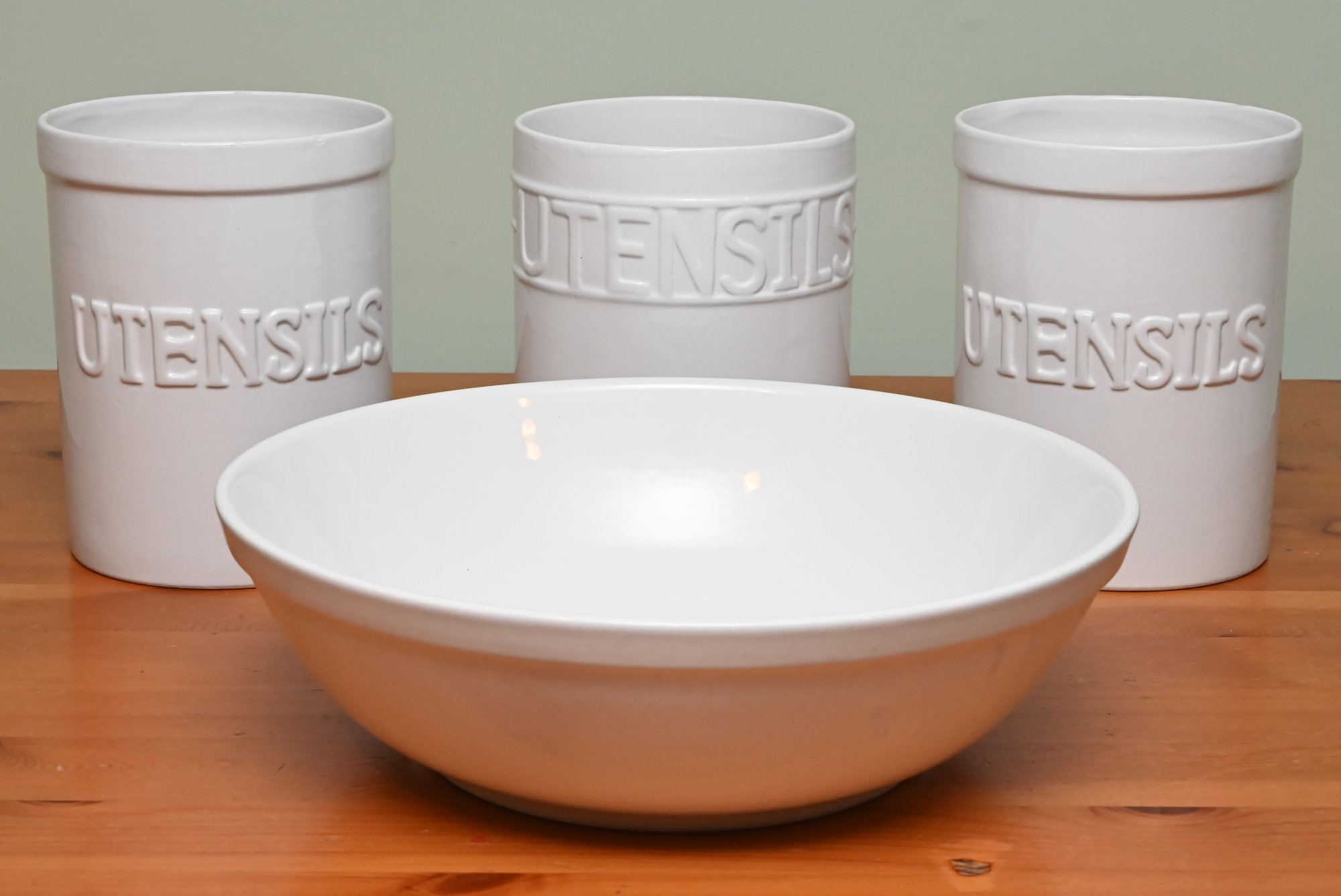 set of ceramic kitchenware, including three white utensil holders and a large white serving bowl