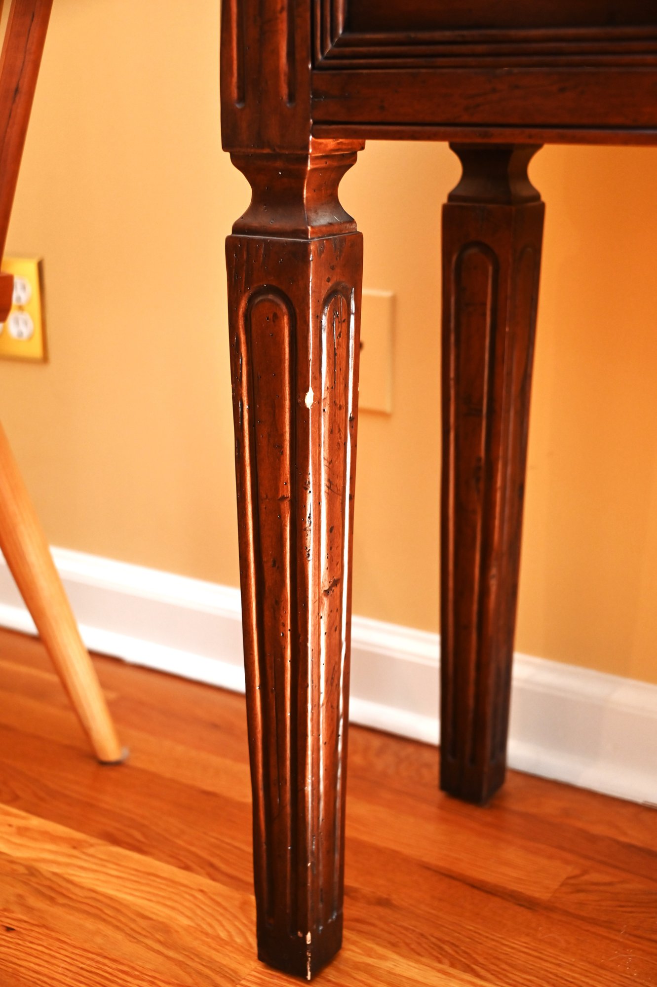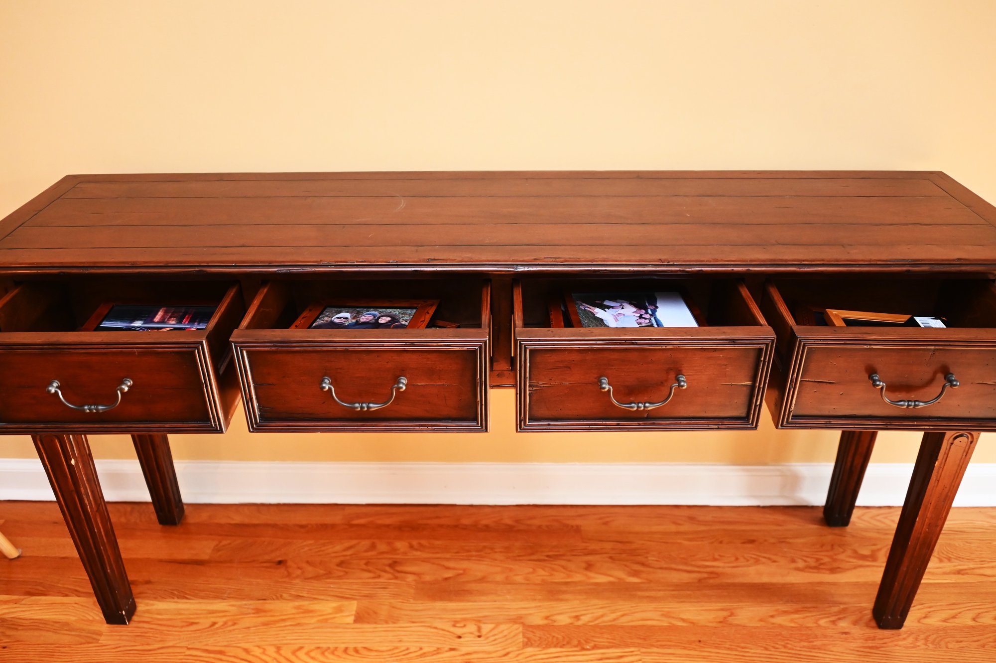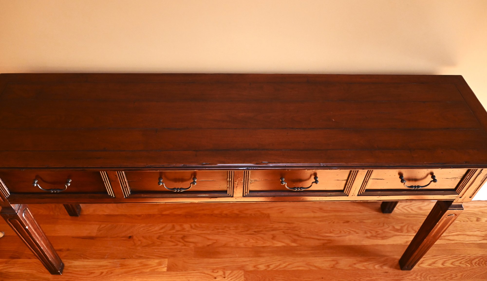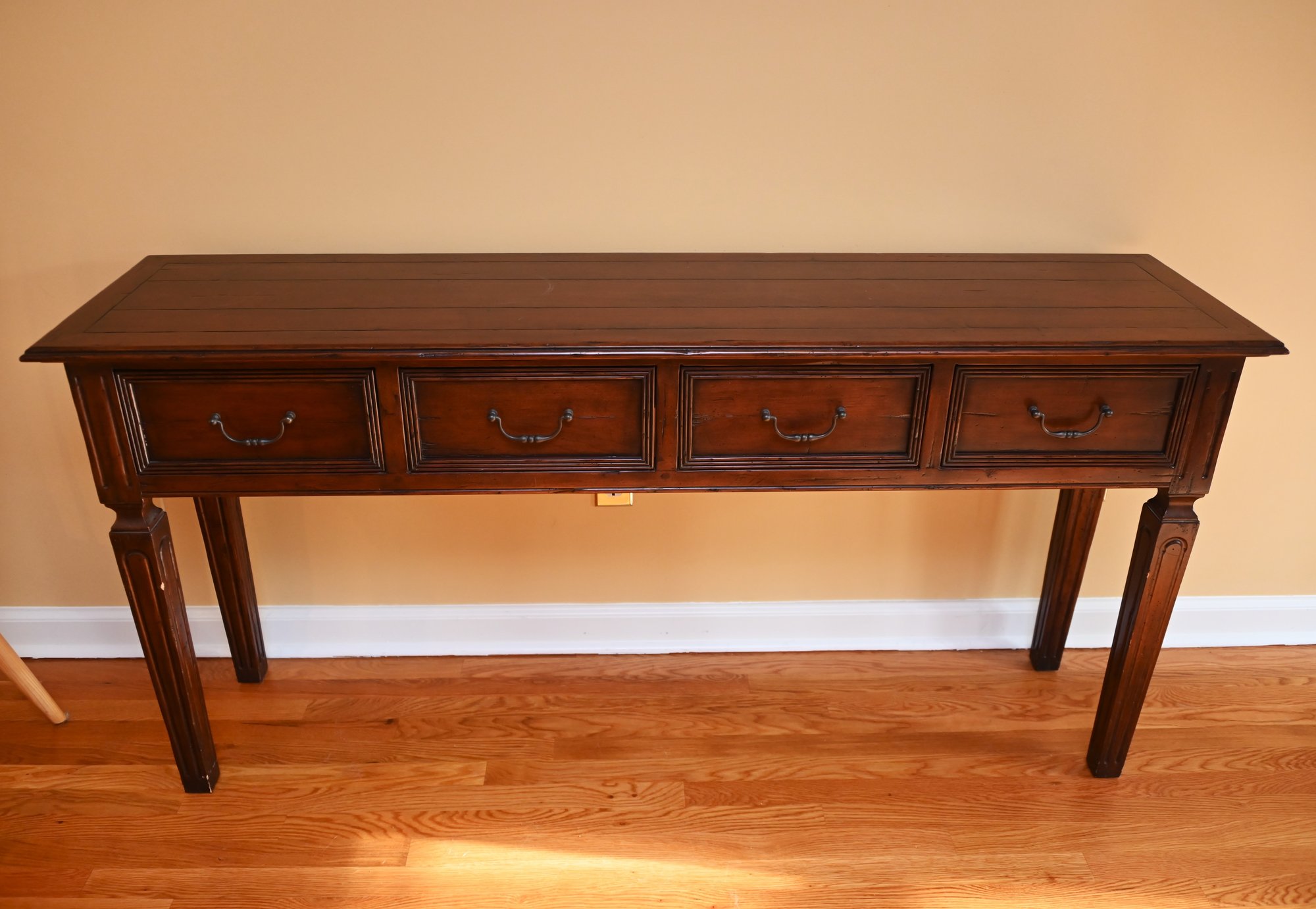 Its design includes four drawers with finely crafted paneling and antique-style brass handles, providing both aesthetic appeal and functional storage. The legs are sturdy and slightly tapered with carved detailing, adding to its refined yet rustic charm