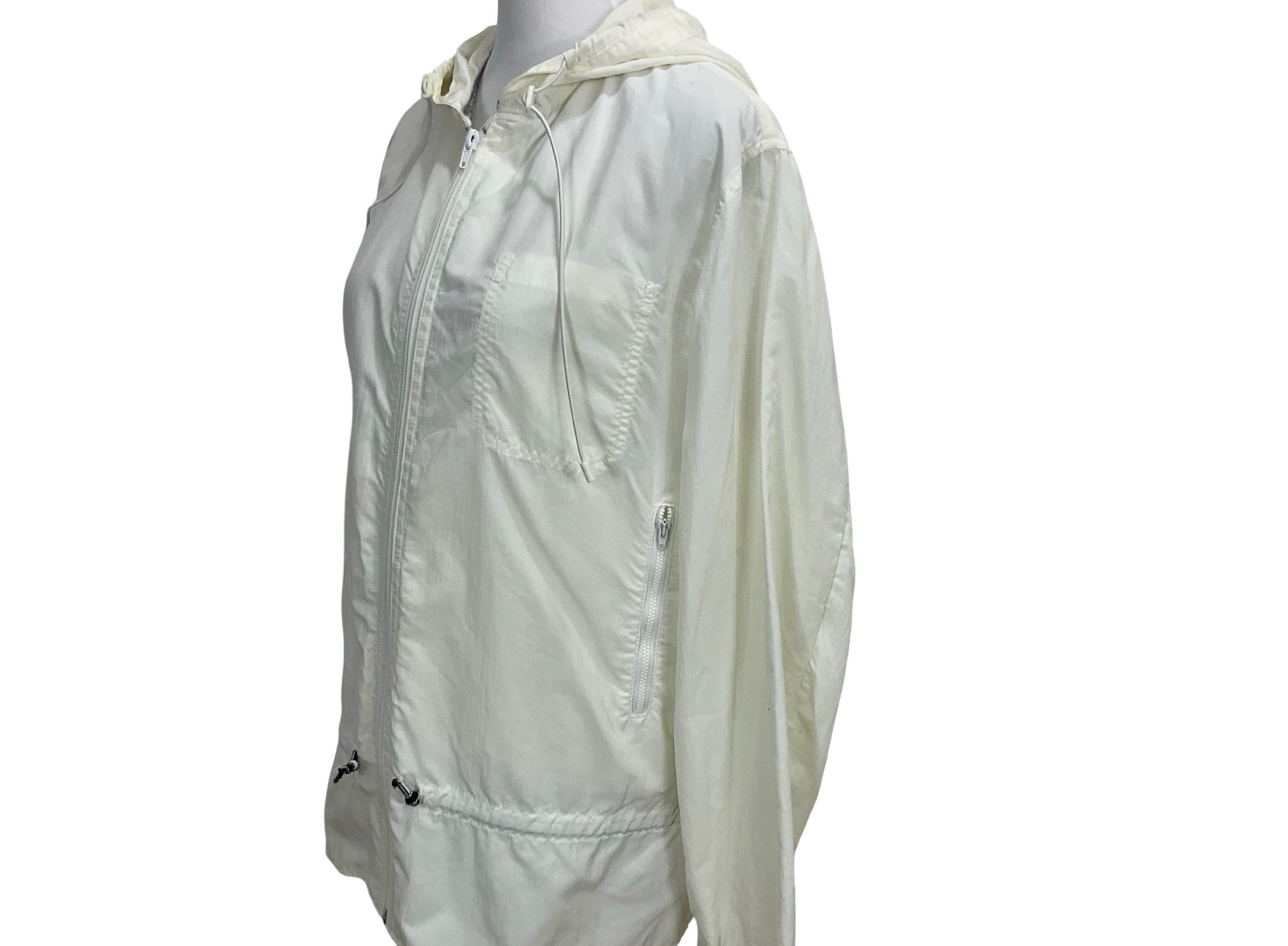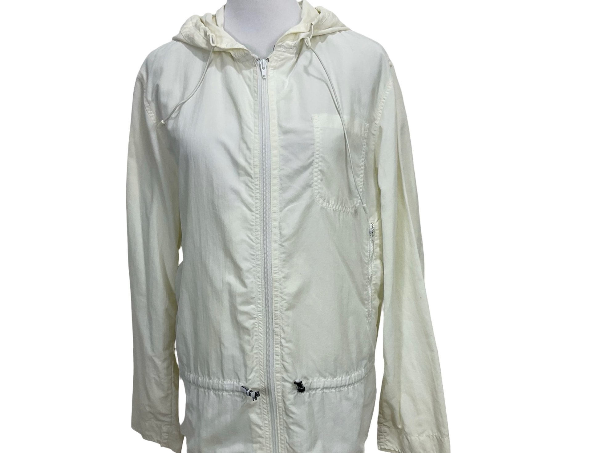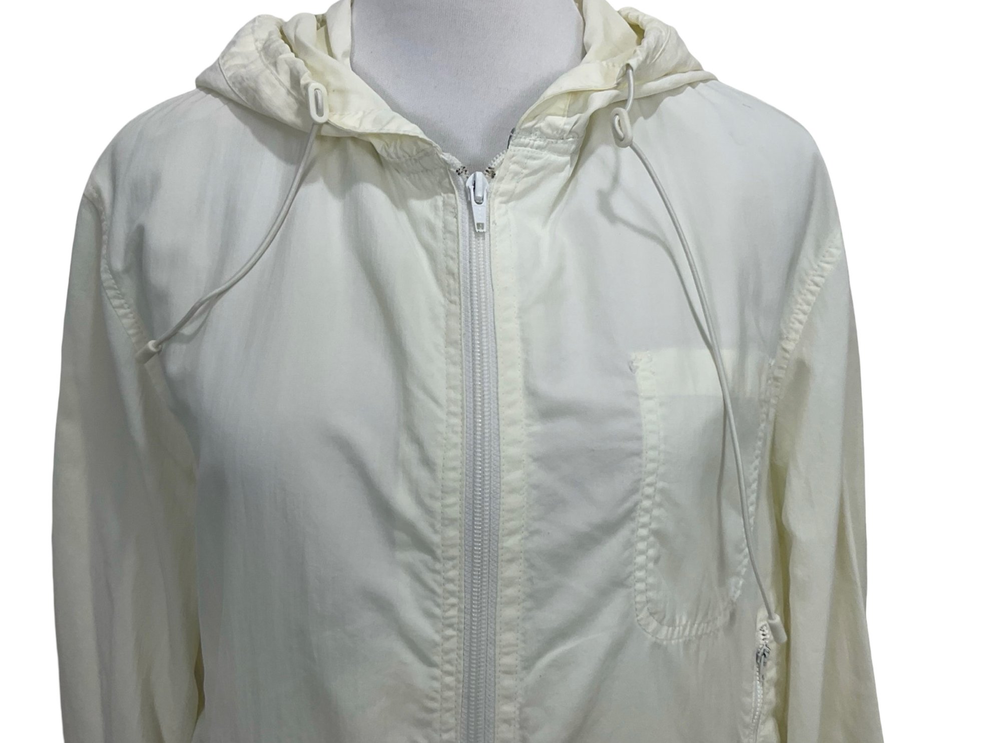 Zipper closure front zipper pockets, open chest pocket Measures, drawstring at waist and drawstring hood