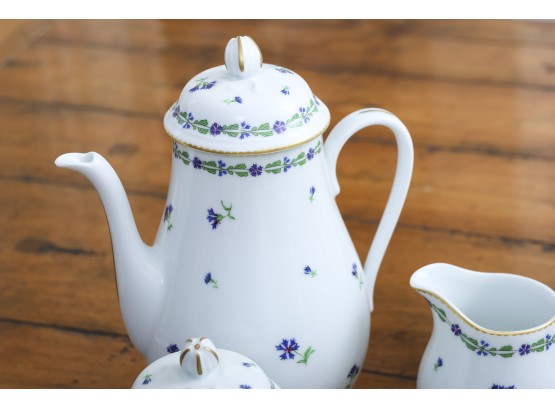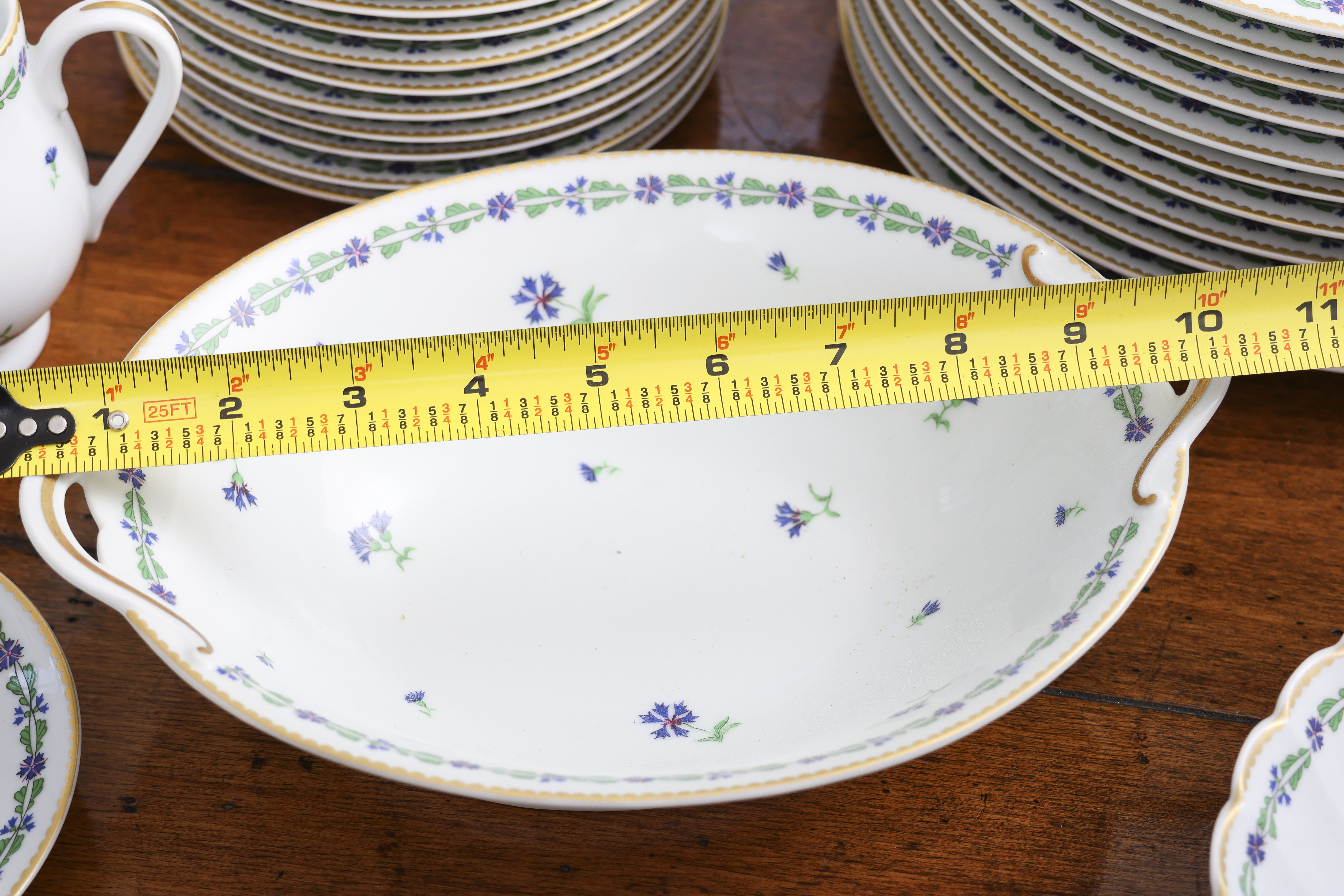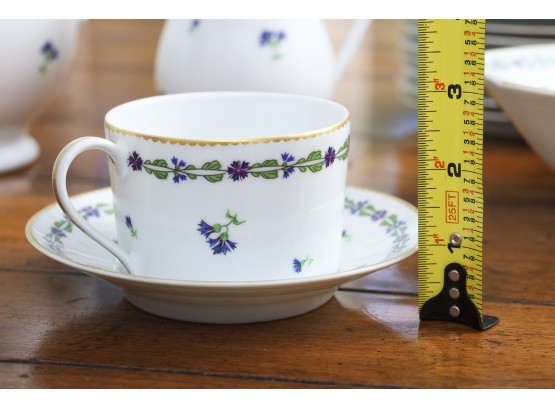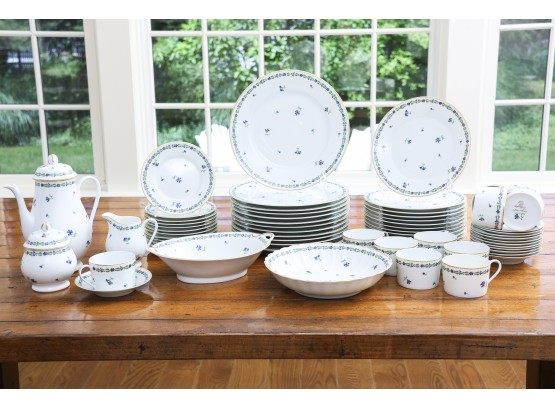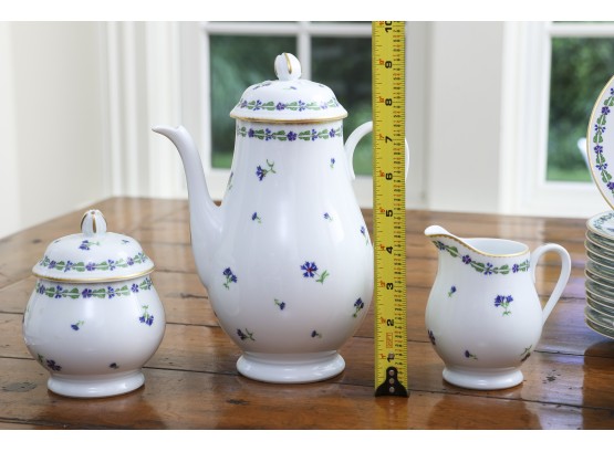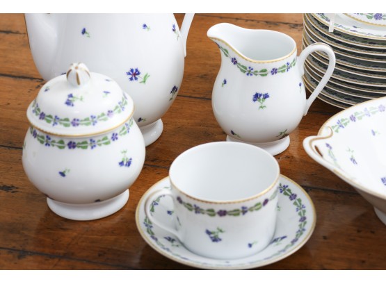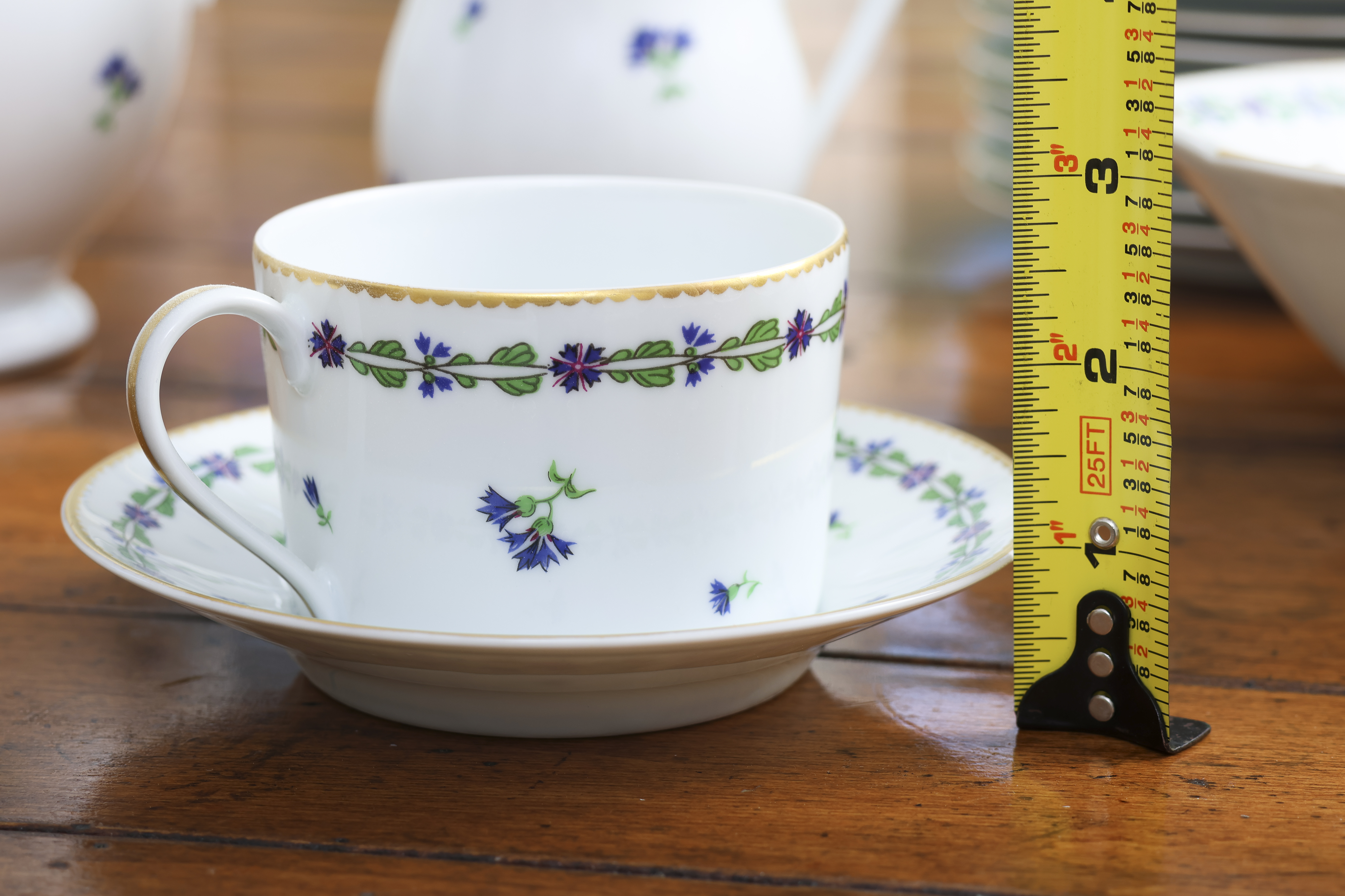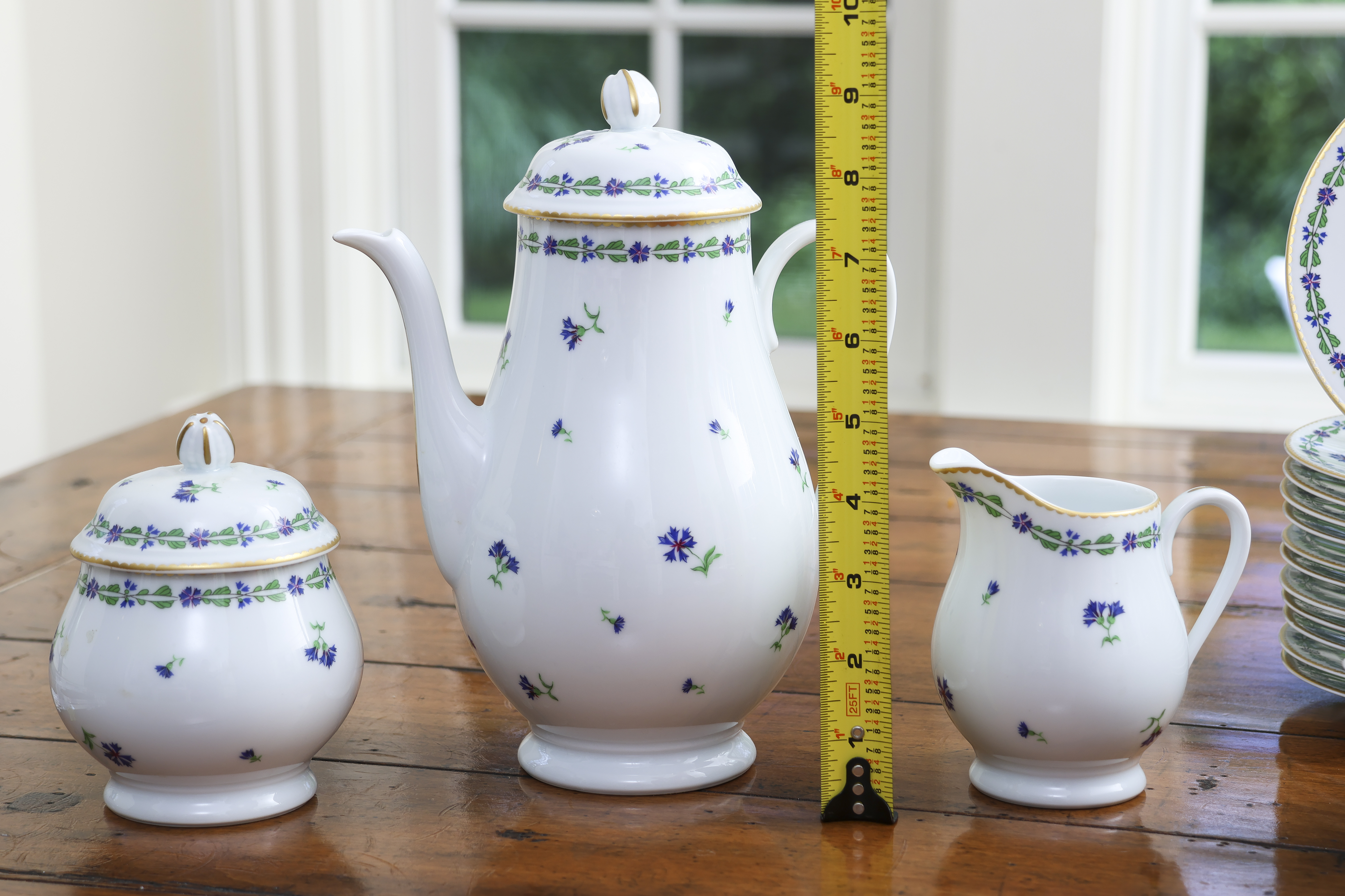 Beautiful 64-piece set of "Villandry" fine china from Gerard, Dufraisseix & Abbot (GDA) in Limoges France, made for Tiffany & Co., as marked on the underside of each piece. The set includes dinner plates, salad plates, dessert plates, serving platters, coffee/teacups and saucers, coffee/tea pot, creamer and sugar bowl. Each piece is adorned with a delicate motif featuring blue flowers and green leaves, a gilt scalloped trim along the edges, and a subtle gold stripe accent on handles.