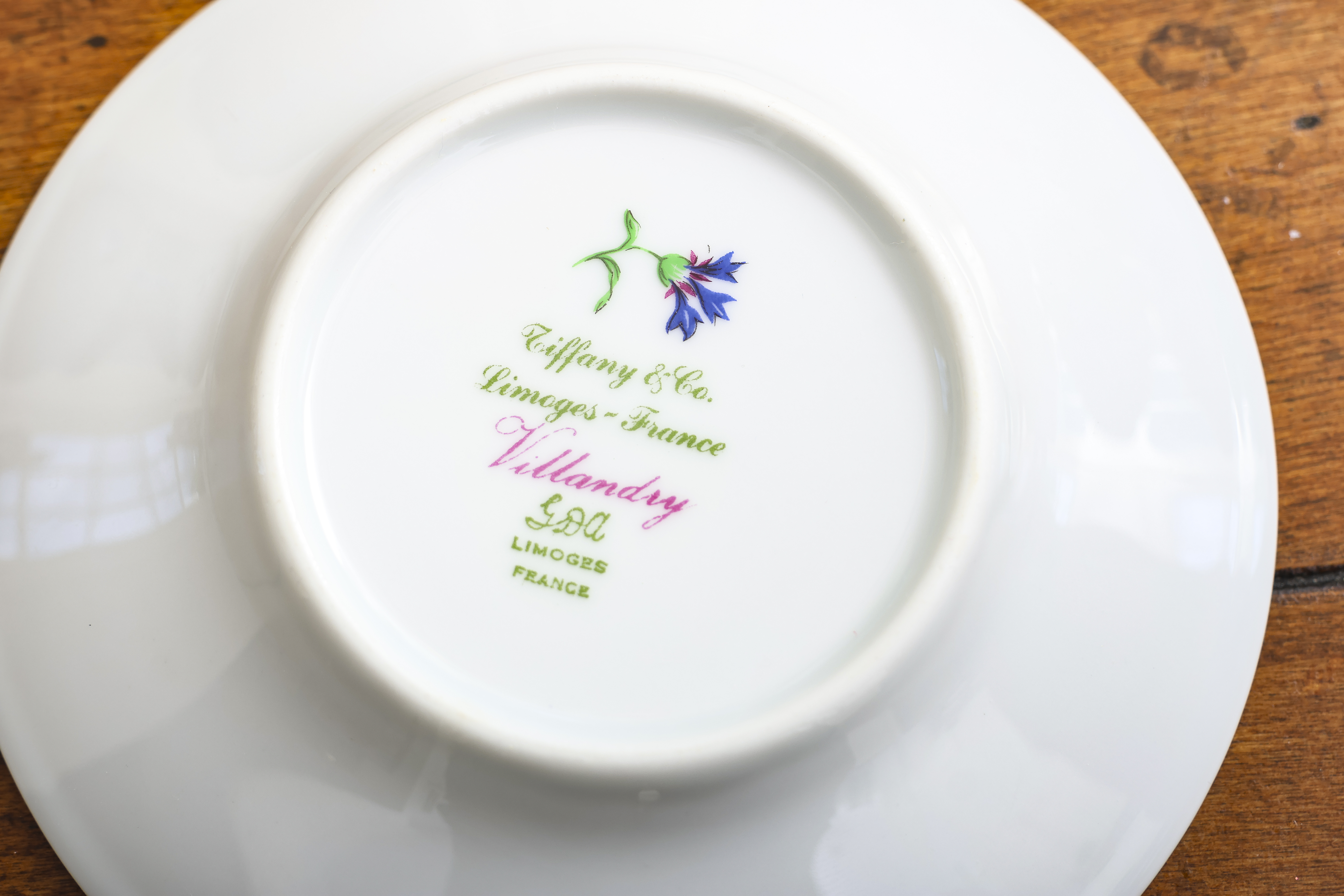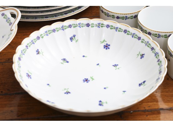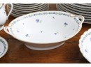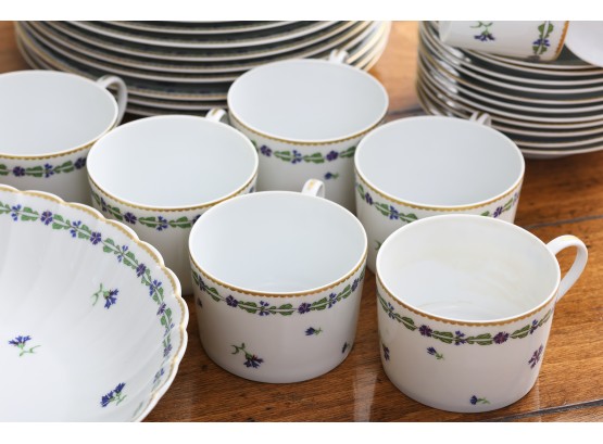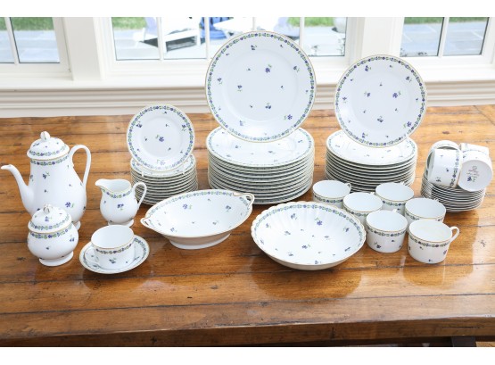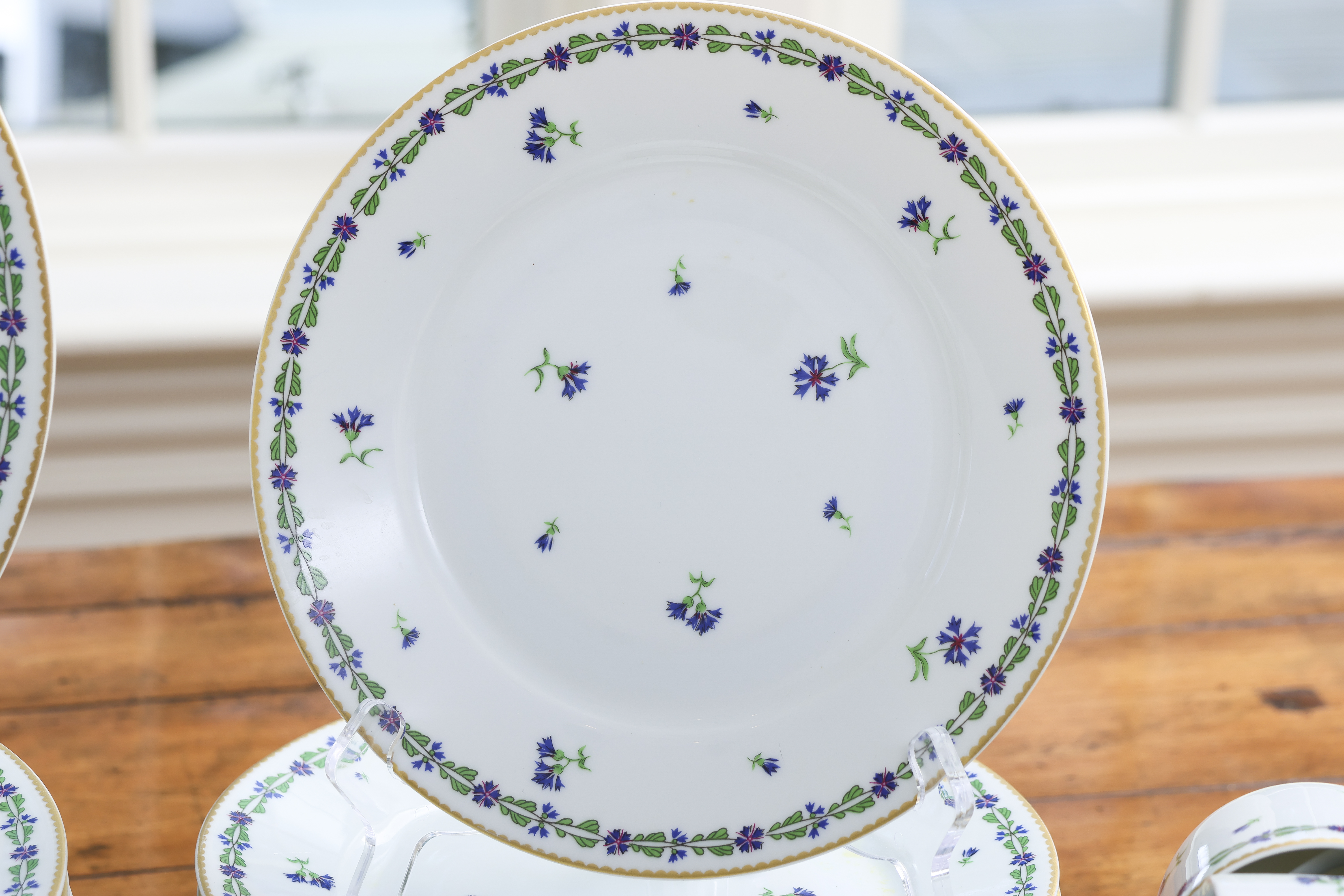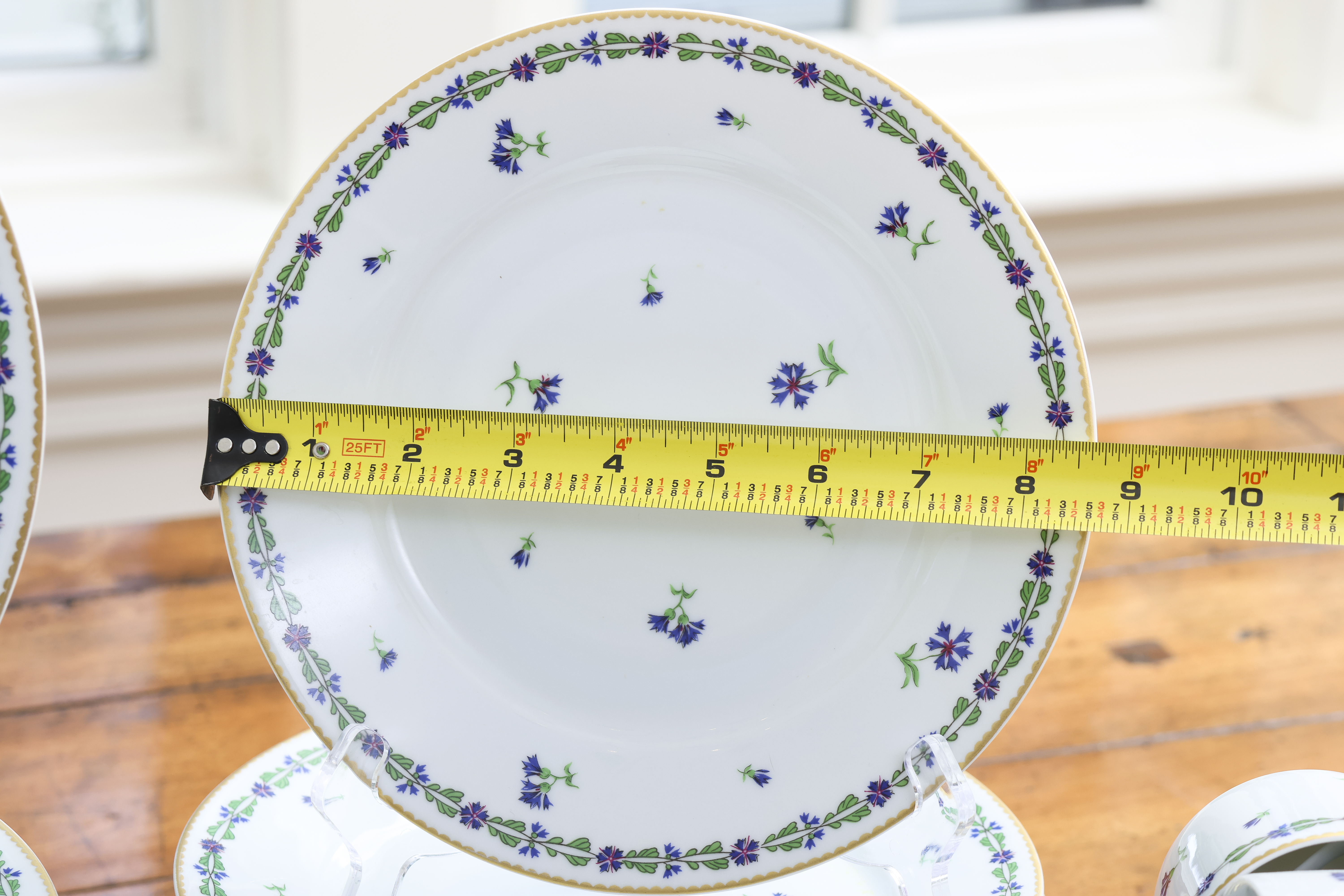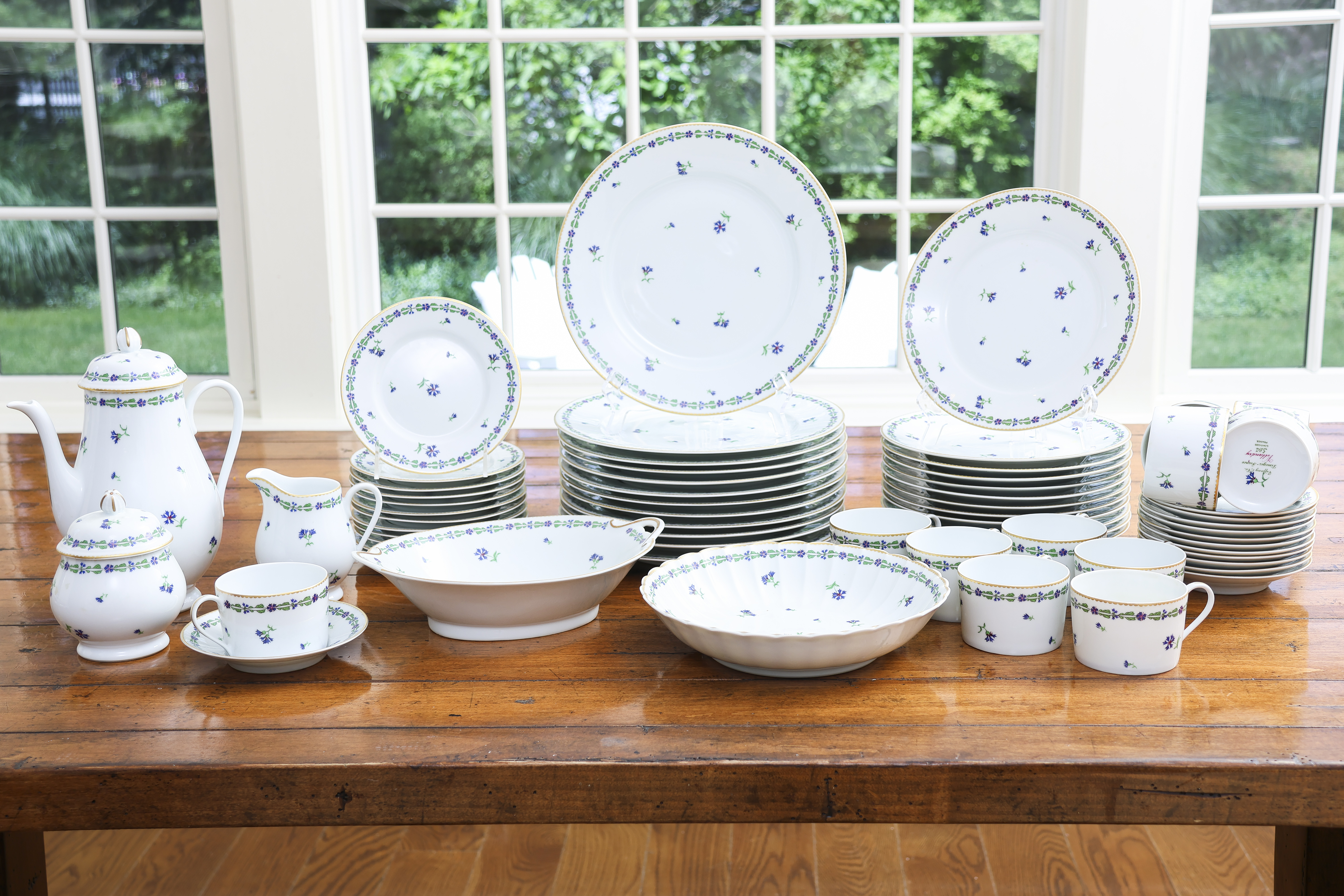 Beautiful 64-piece set of "Villandry" fine china from Gerard, Dufraisseix & Abbot (GDA) in Limoges France, made for Tiffany & Co., as marked on the underside of each piece. The set includes dinner plates, salad plates, dessert plates, serving platters, coffee/teacups and saucers, coffee/tea pot, creamer and sugar bowl. Each piece is adorned with a delicate motif featuring blue flowers and green leaves, a gilt scalloped trim along the edges, and a subtle gold stripe accent on handles.