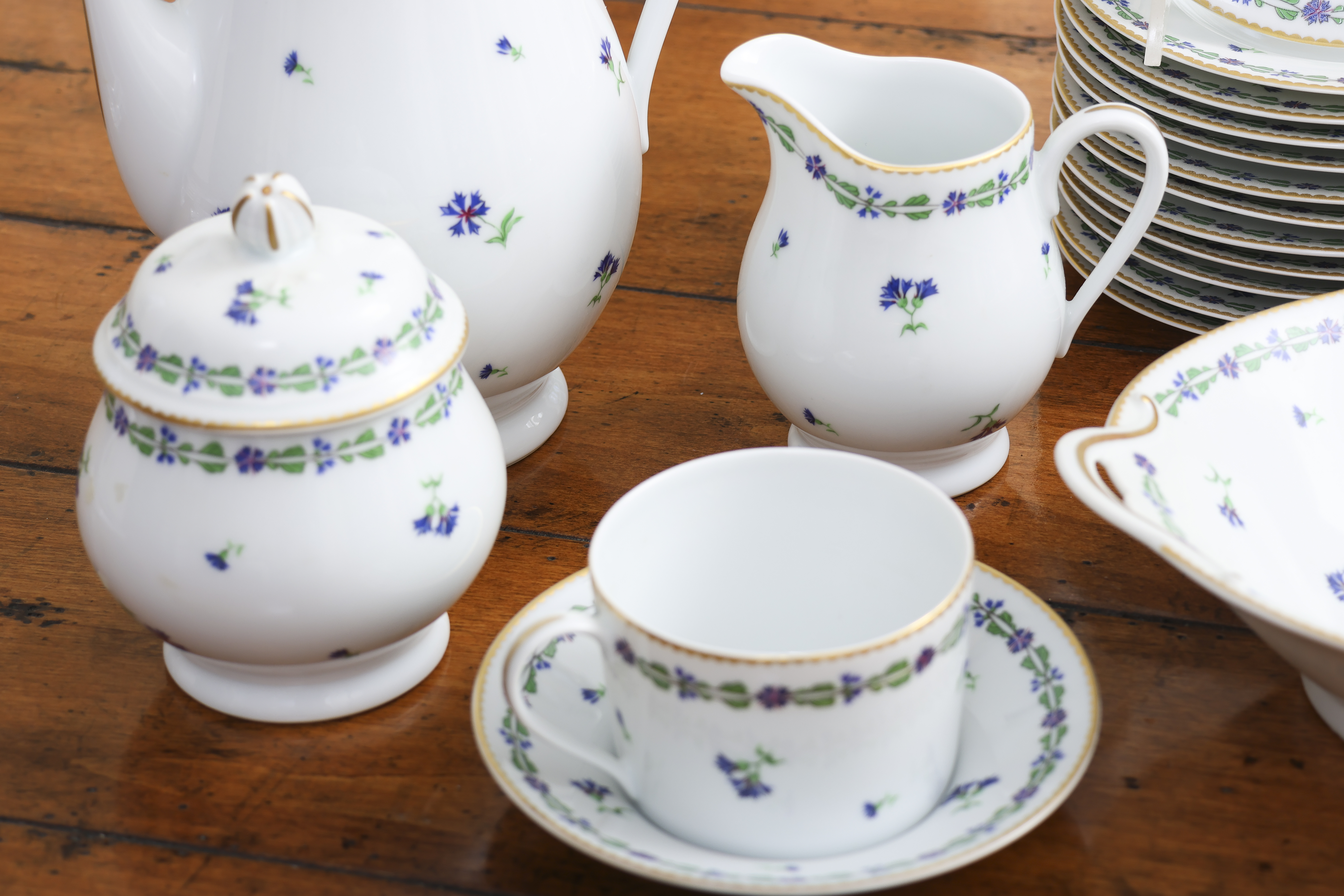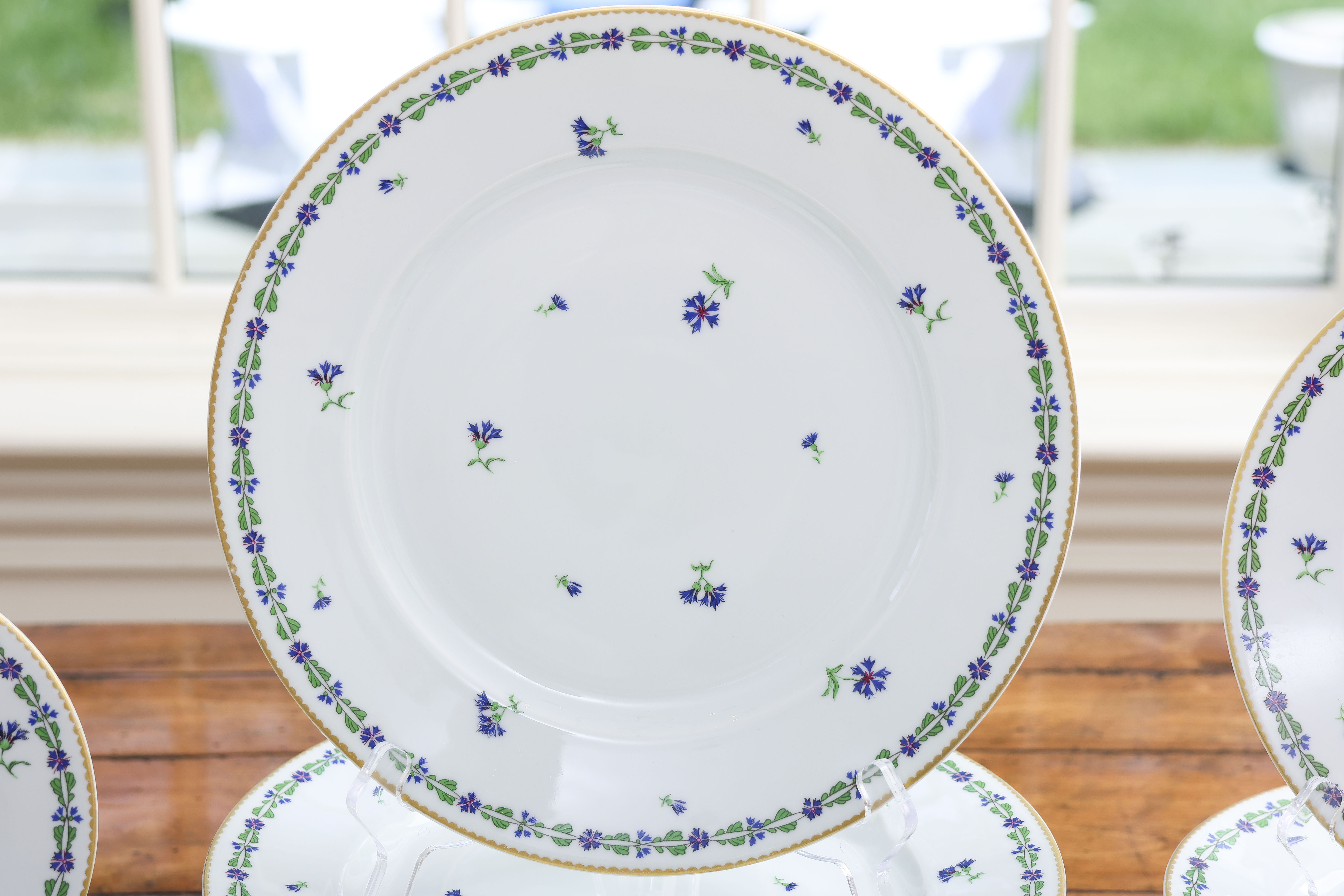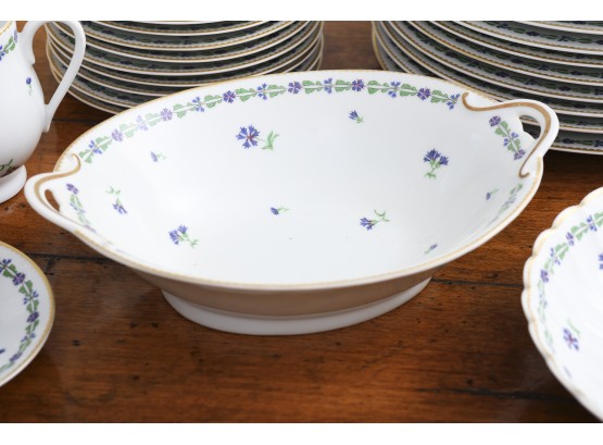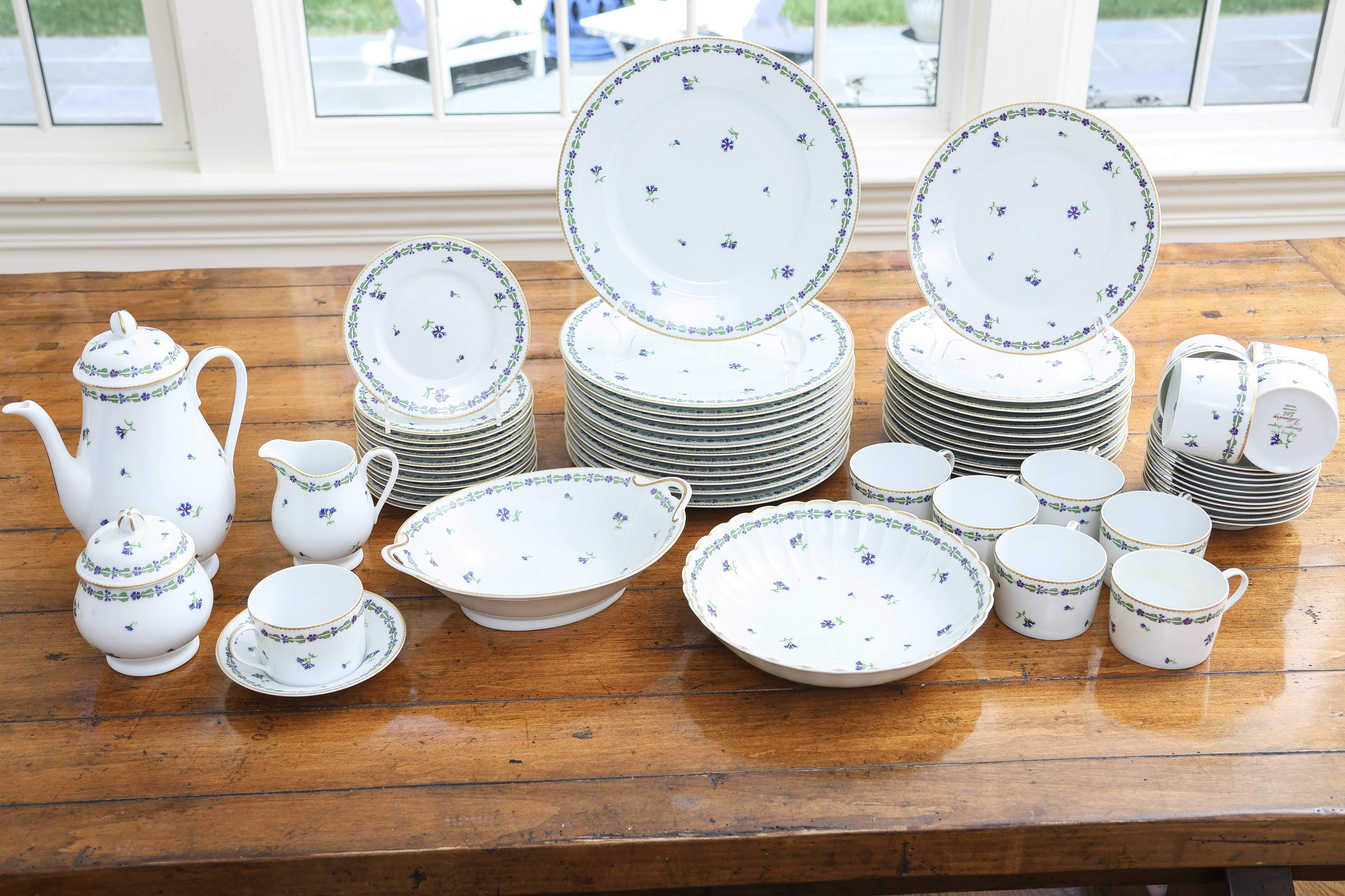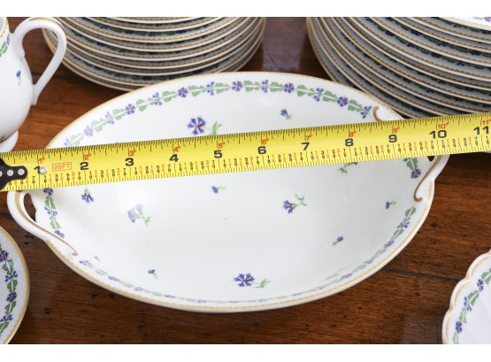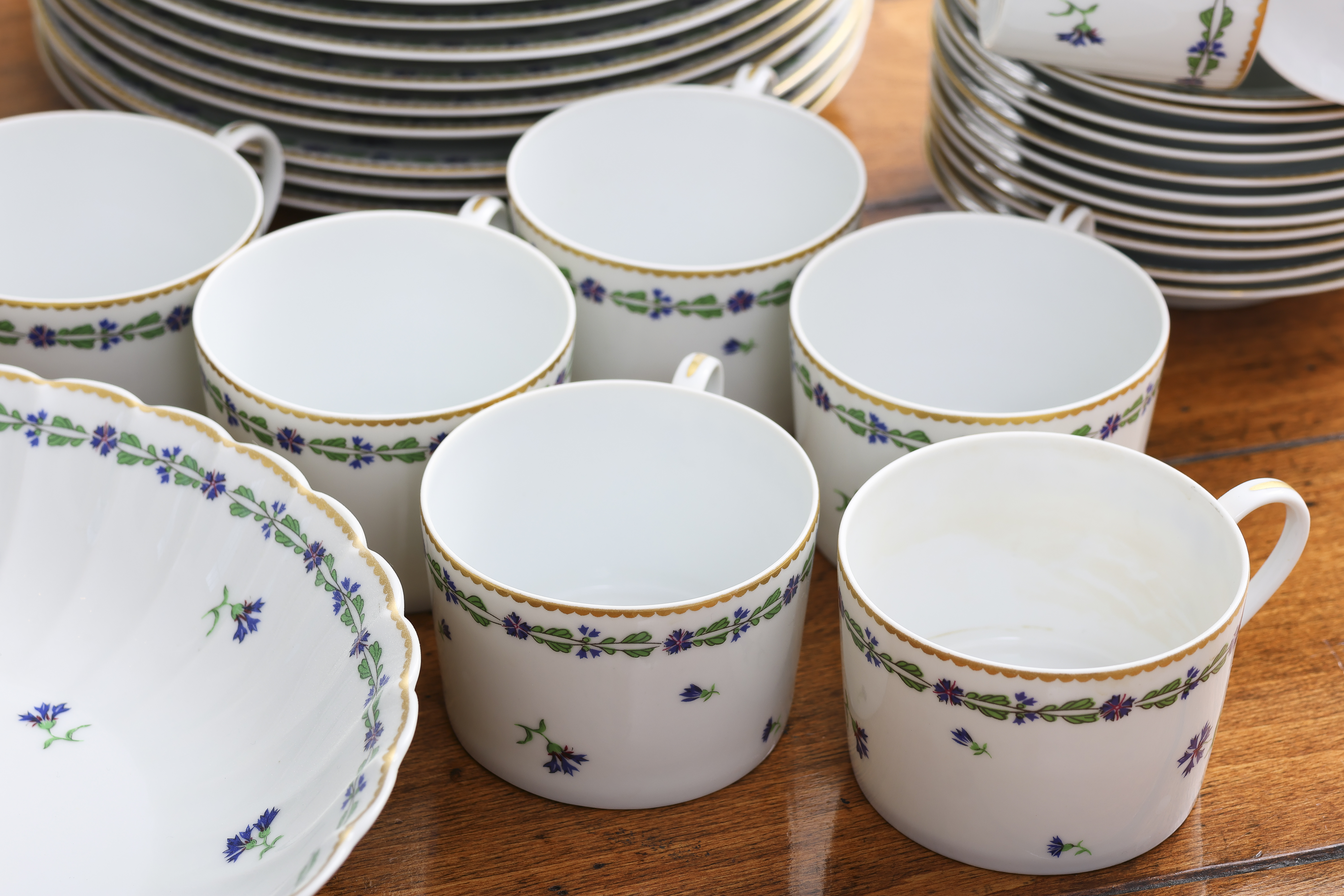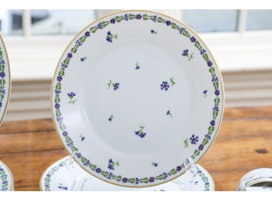 Beautiful 64-piece set of "Villandry" fine china from Gerard, Dufraisseix & Abbot (GDA) in Limoges France, made for Tiffany & Co., as marked on the underside of each piece. The set includes dinner plates, salad plates, dessert plates, serving platters, coffee/teacups and saucers, coffee/tea pot, creamer and sugar bowl. Each piece is adorned with a delicate motif featuring blue flowers and green leaves, a gilt scalloped trim along the edges, and a subtle gold stripe accent on handles.