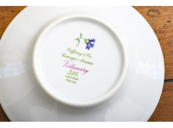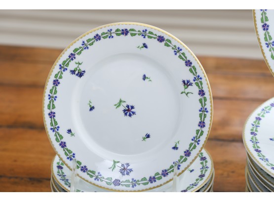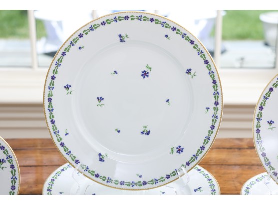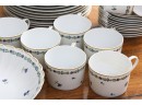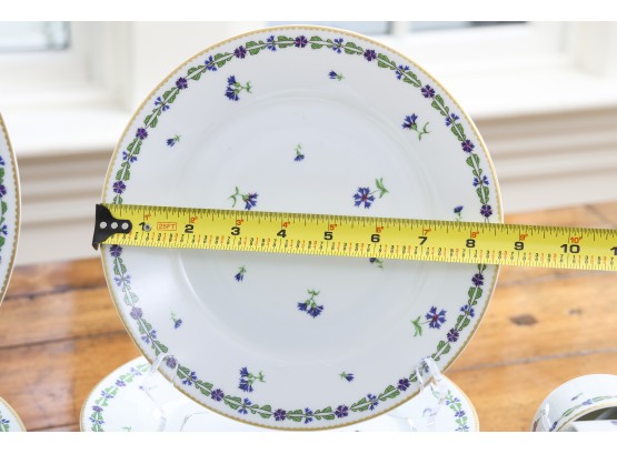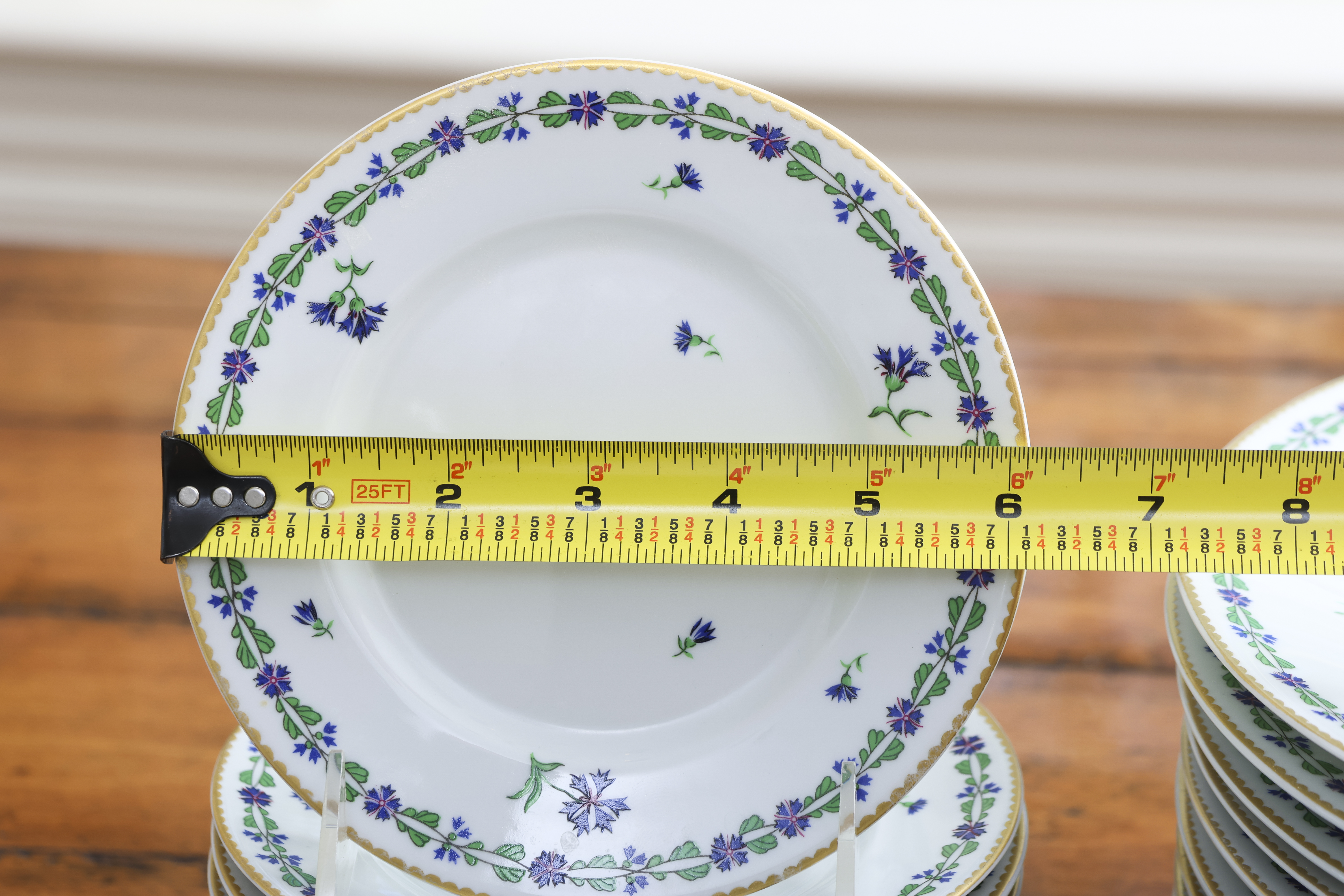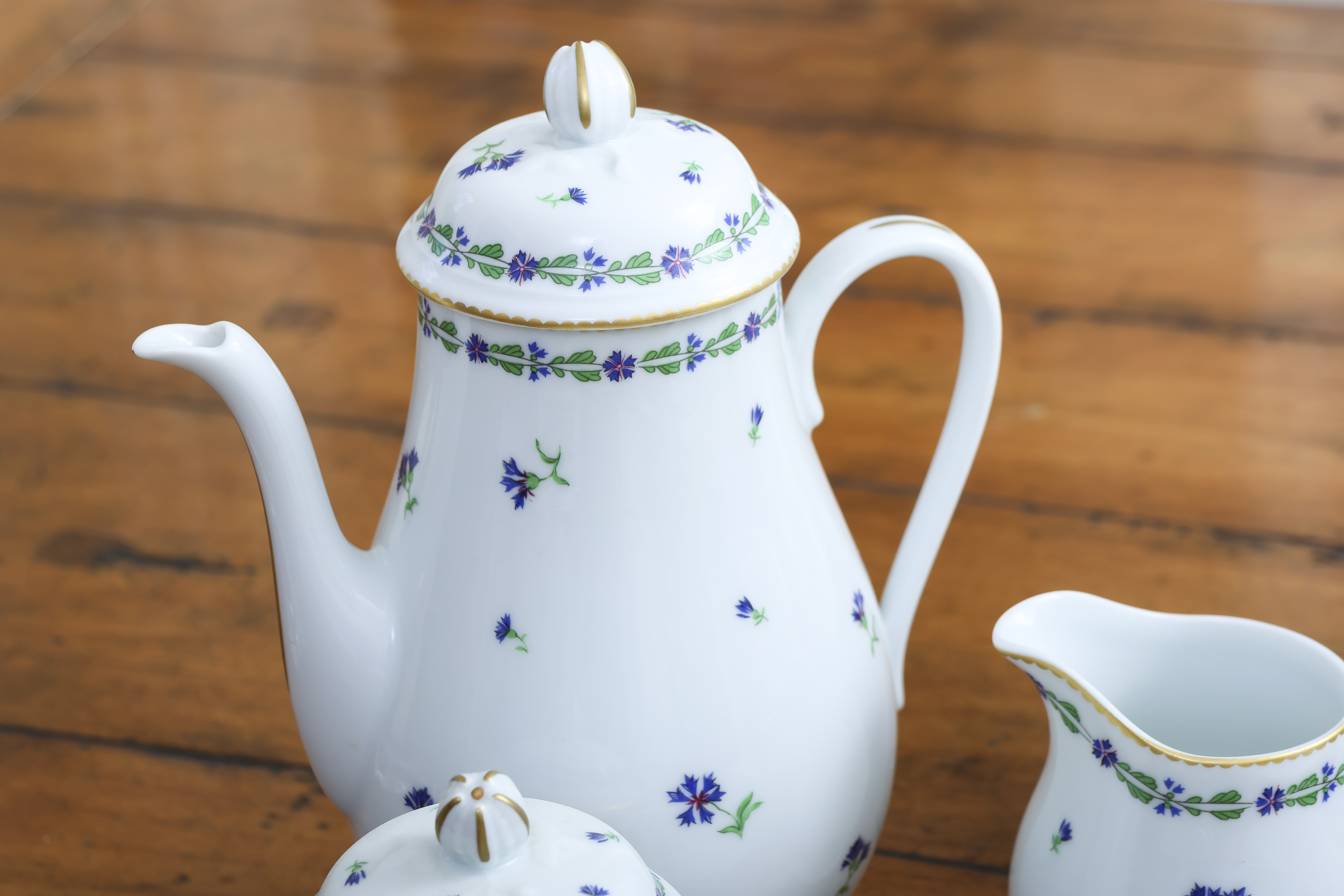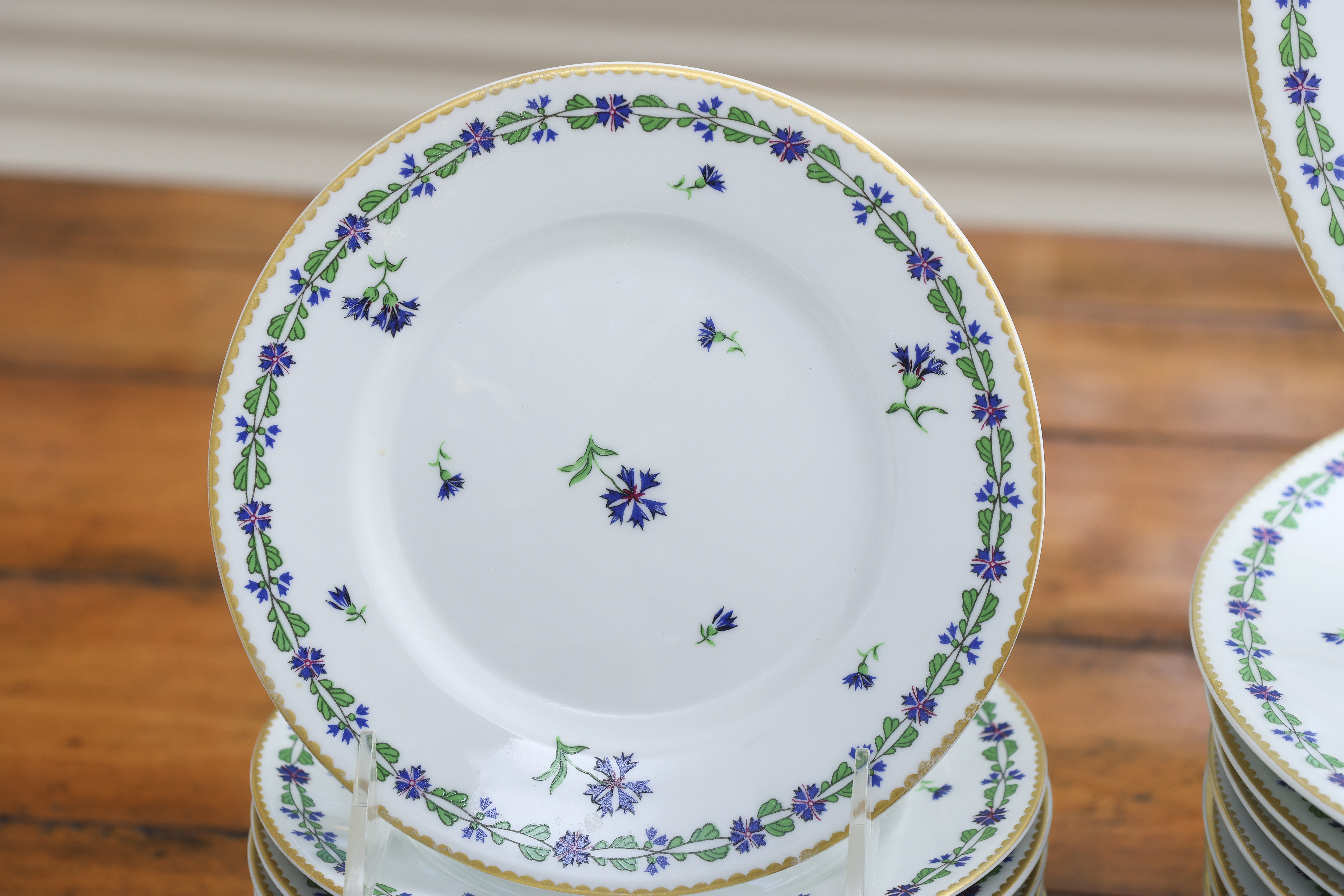 Beautiful 64-piece set of "Villandry" fine china from Gerard, Dufraisseix & Abbot (GDA) in Limoges France, made for Tiffany & Co., as marked on the underside of each piece. The set includes dinner plates, salad plates, dessert plates, serving platters, coffee/teacups and saucers, coffee/tea pot, creamer and sugar bowl. Each piece is adorned with a delicate motif featuring blue flowers and green leaves, a gilt scalloped trim along the edges, and a subtle gold stripe accent on handles.