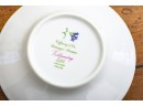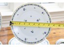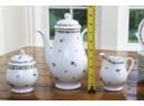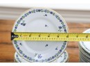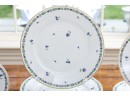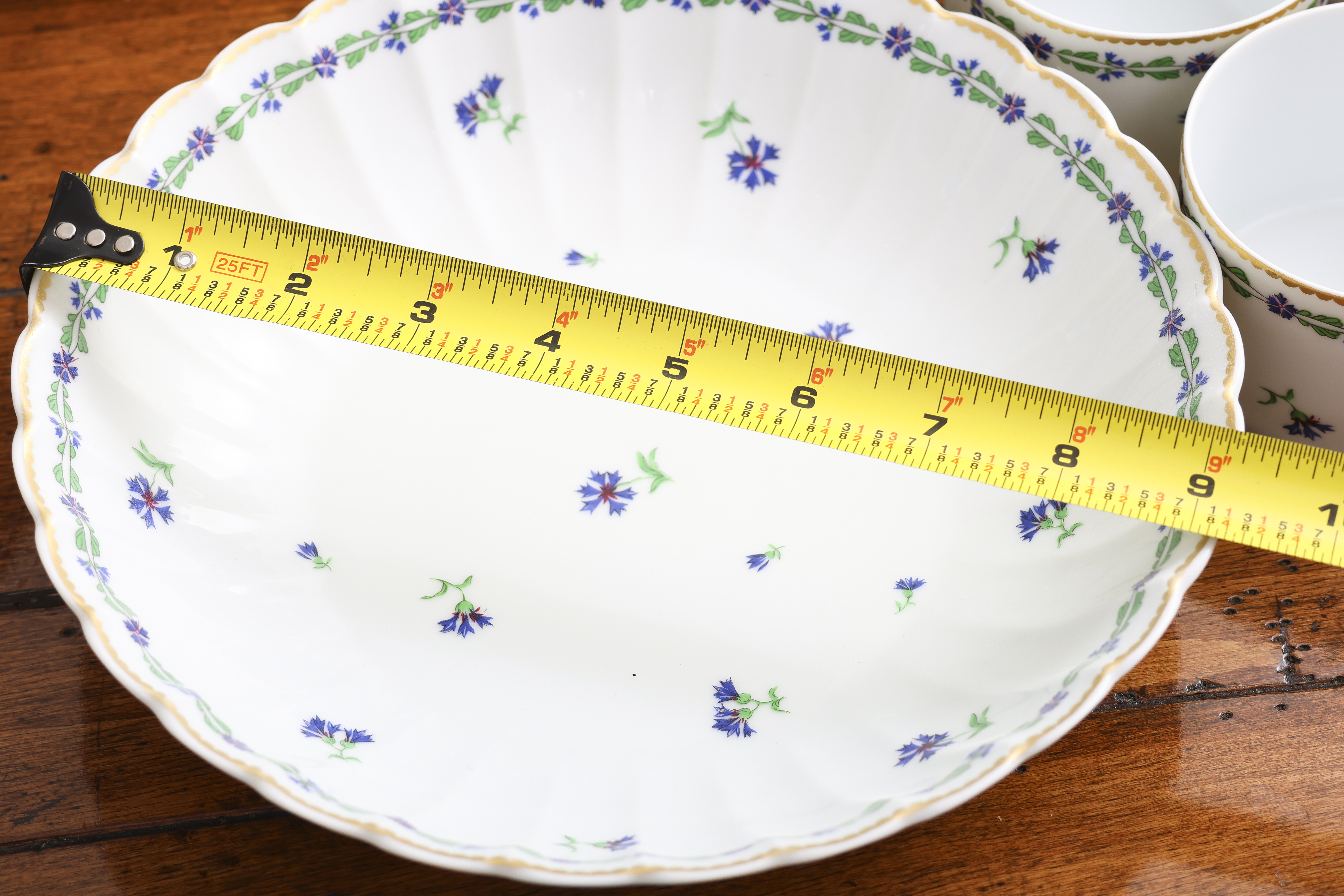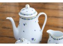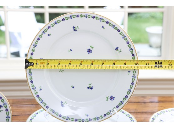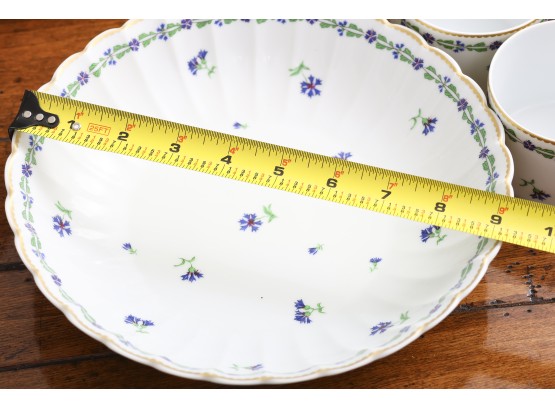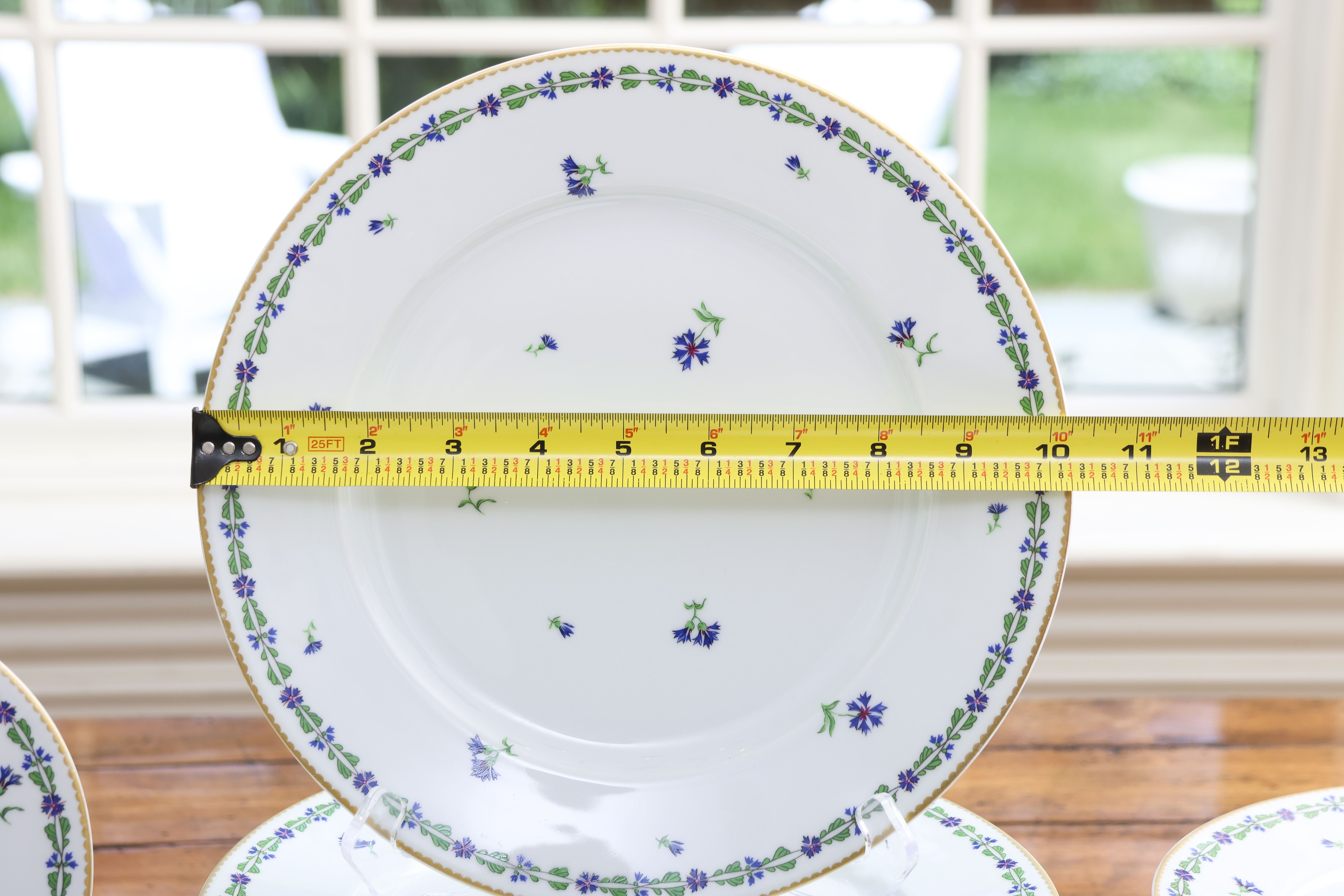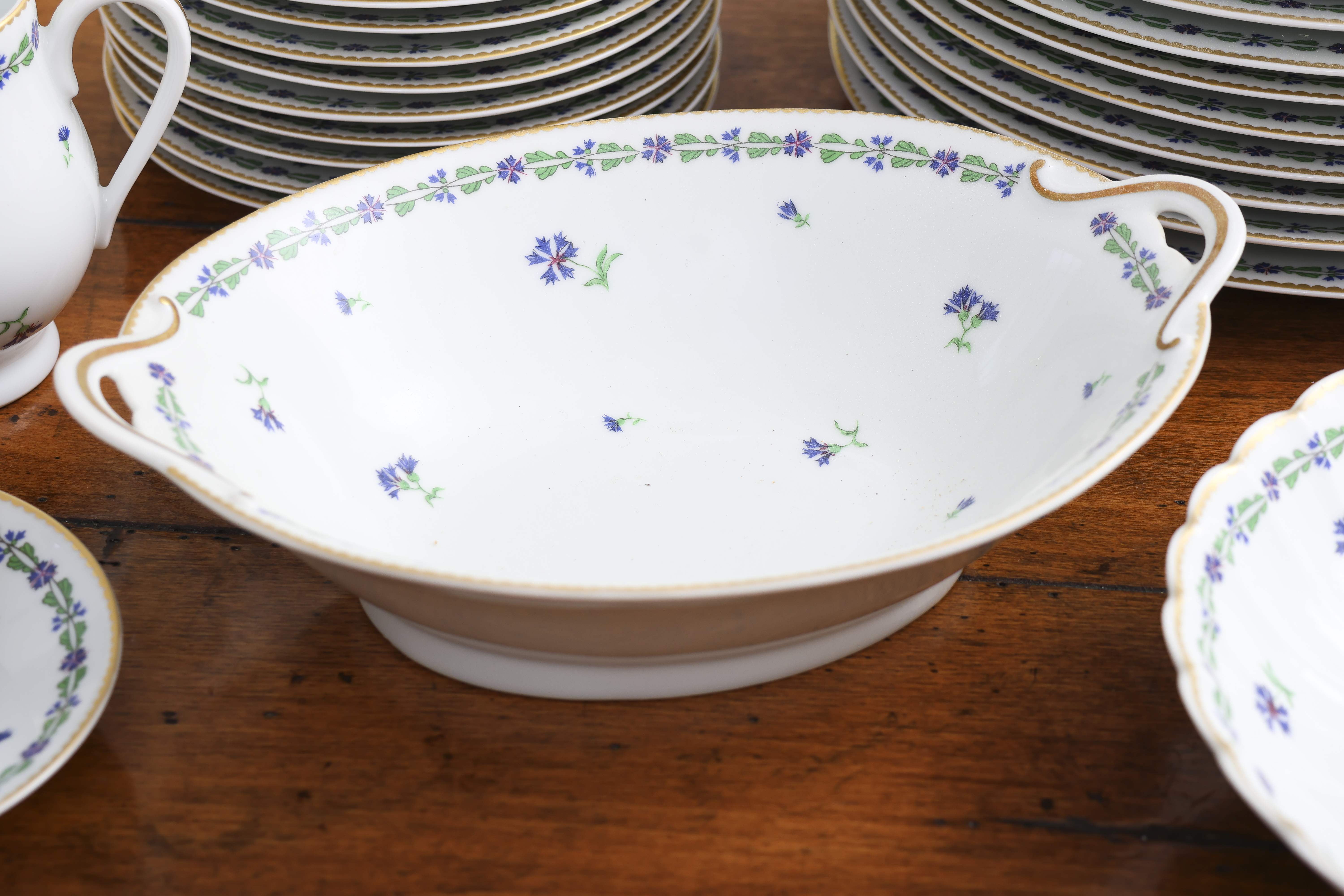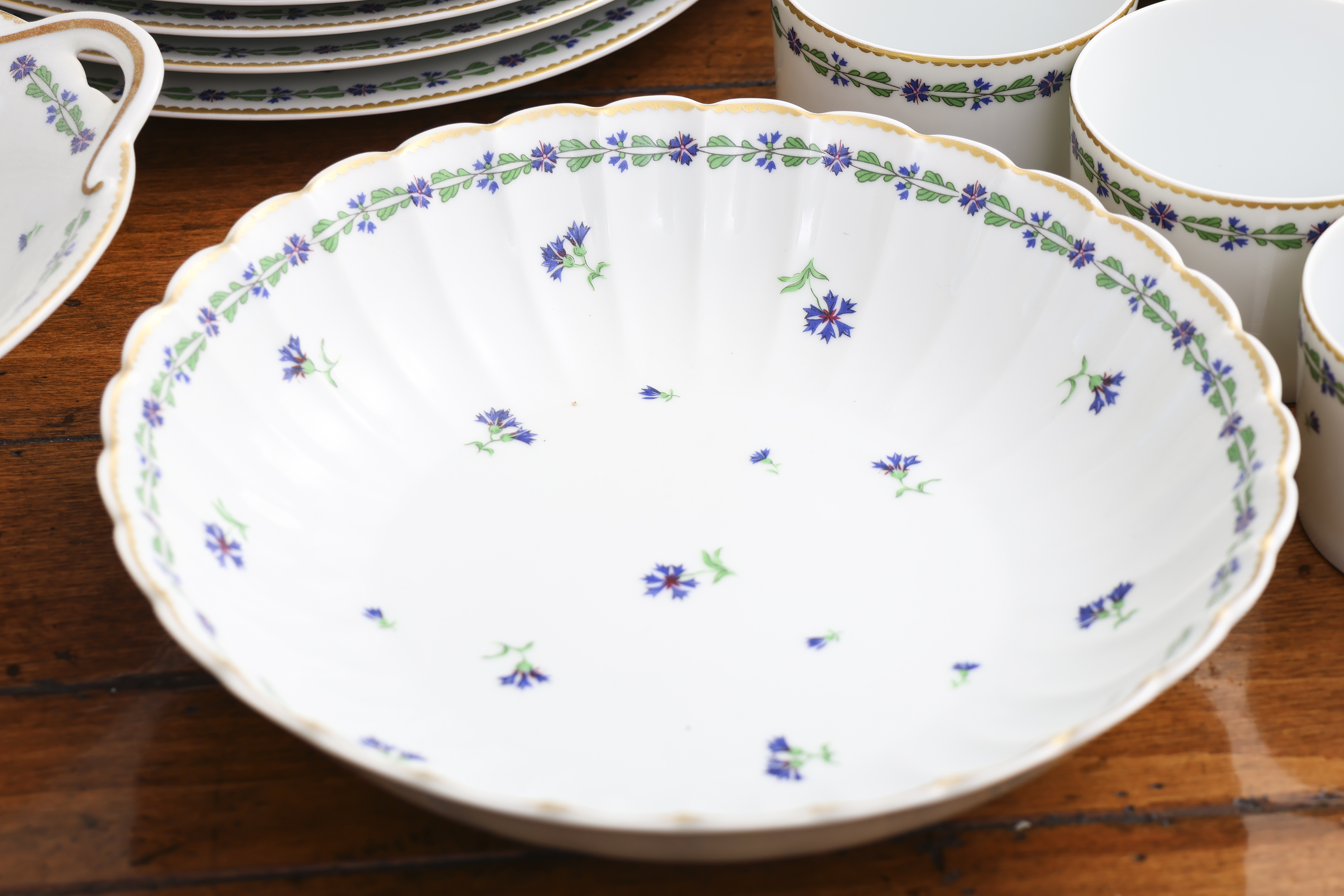 Beautiful 64-piece set of "Villandry" fine china from Gerard, Dufraisseix & Abbot (GDA) in Limoges France, made for Tiffany & Co., as marked on the underside of each piece. The set includes dinner plates, salad plates, dessert plates, serving platters, coffee/teacups and saucers, coffee/tea pot, creamer and sugar bowl. Each piece is adorned with a delicate motif featuring blue flowers and green leaves, a gilt scalloped trim along the edges, and a subtle gold stripe accent on handles.