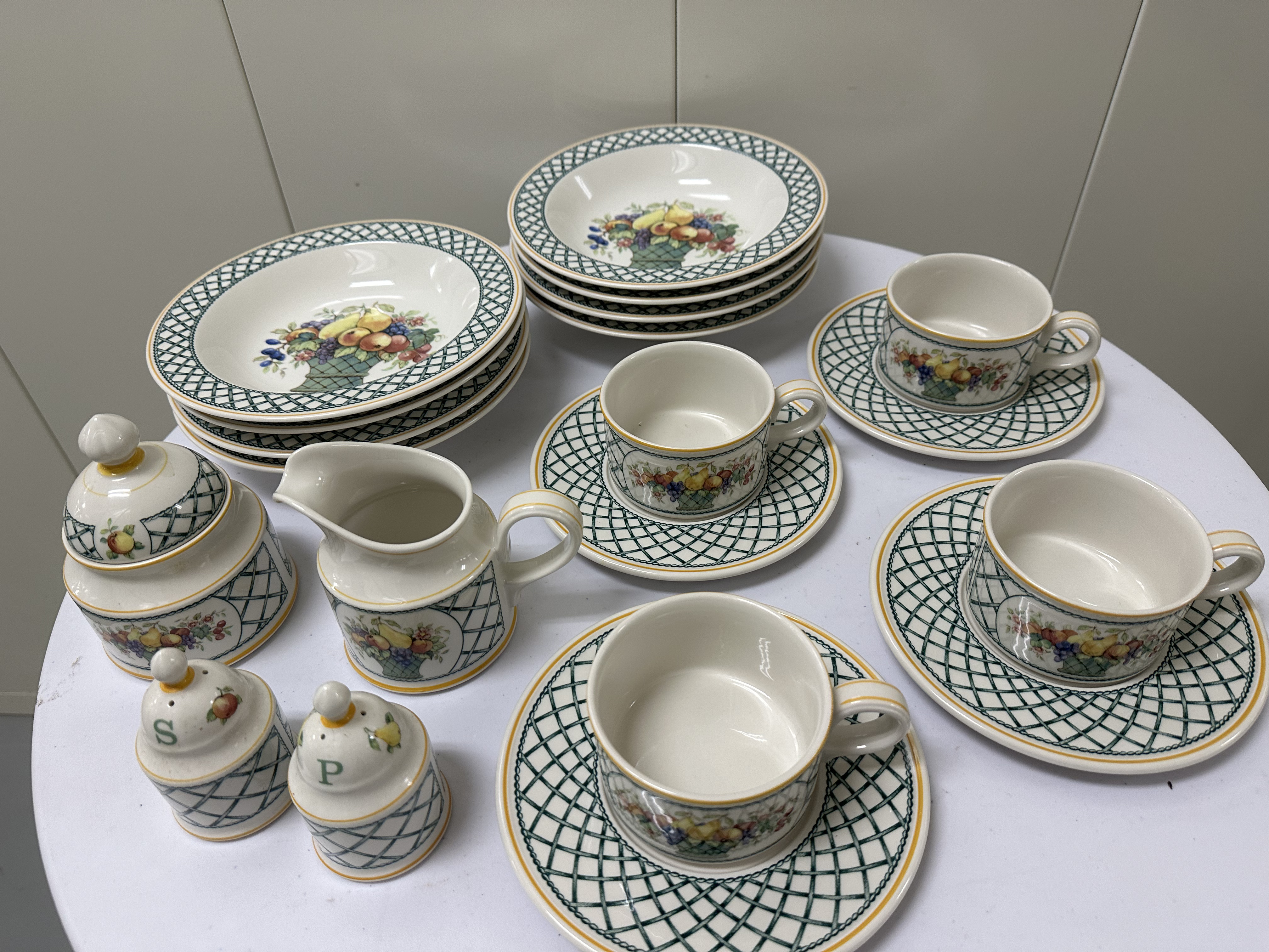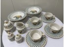 20 piece set, 4 teacups and saucers, 1 salt and 1 pepper shaker, Creamer, Sugar, 8 bowls