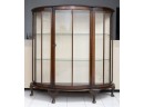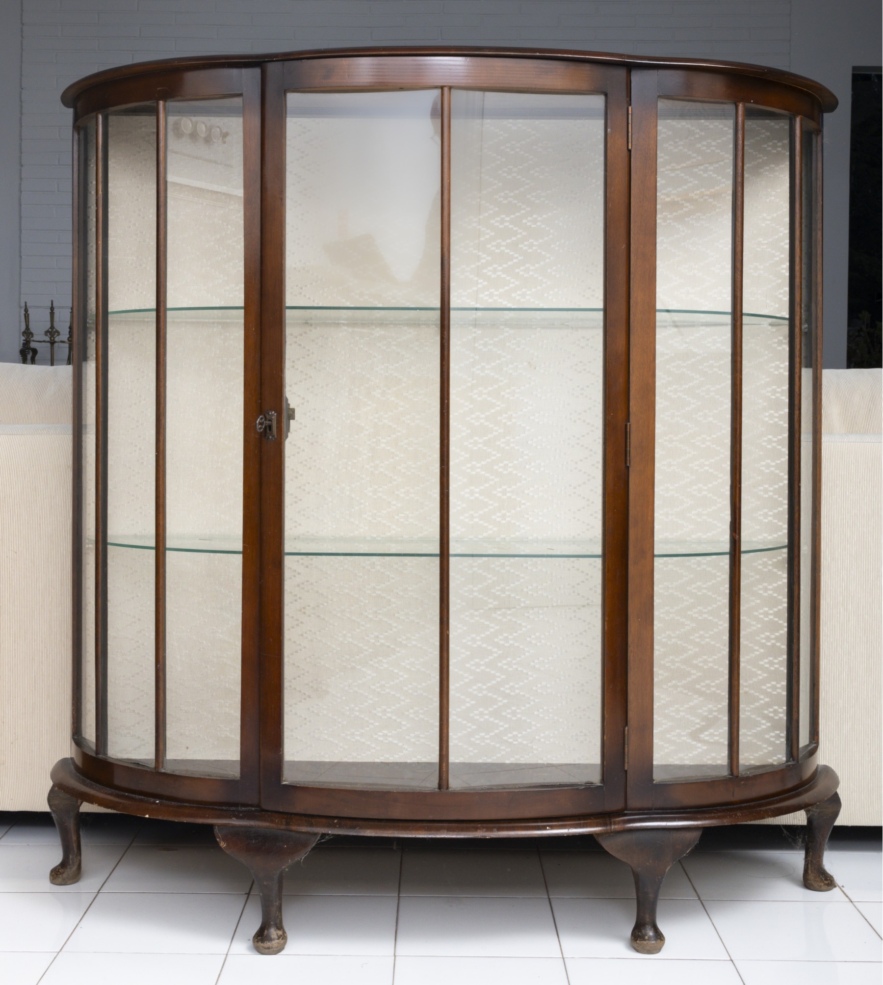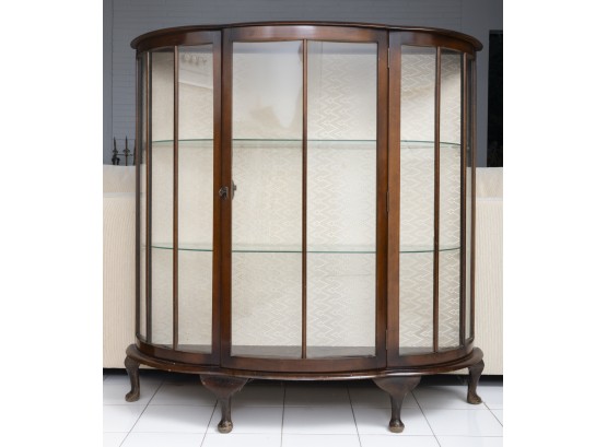 Vintage Bowed Wood Glass Display Cabinet, beautiful cabinet in wood, has a wide opening single curved glass panel. Side sections also single piece of curved glass with wood trim. Beige patterned material backing. 3 glass shelves, on 4 wood legs, has a lock and key to shut the look and keep it secure. Excellent condition.