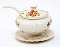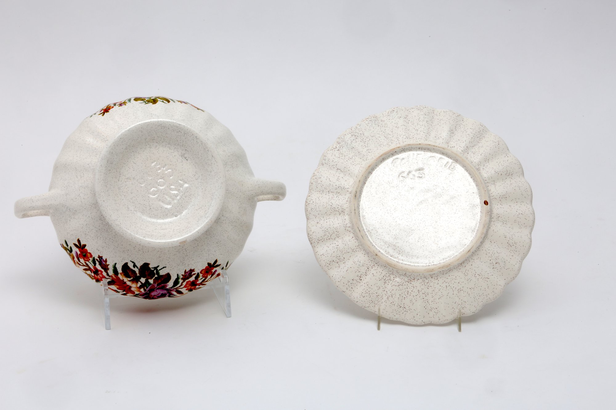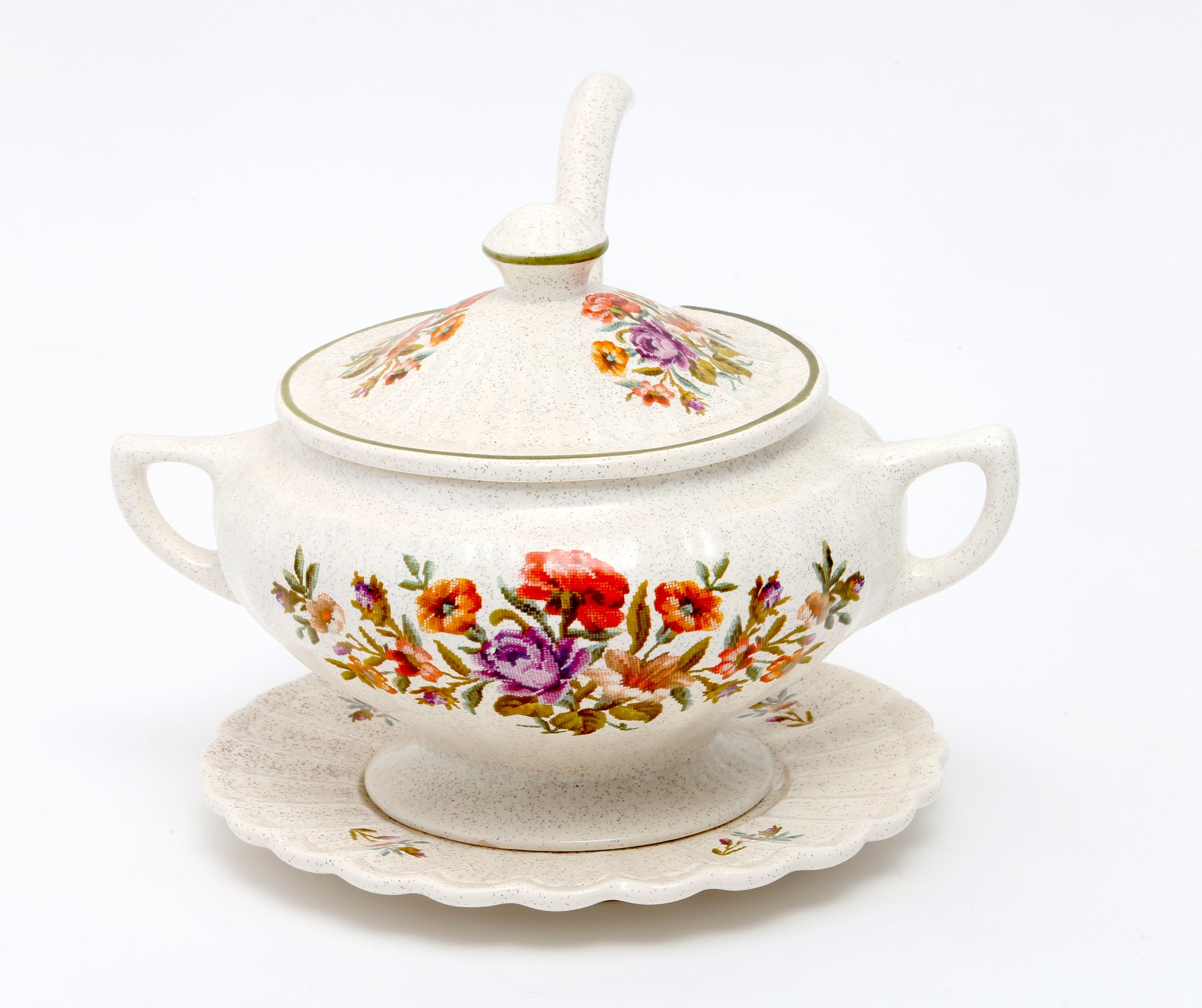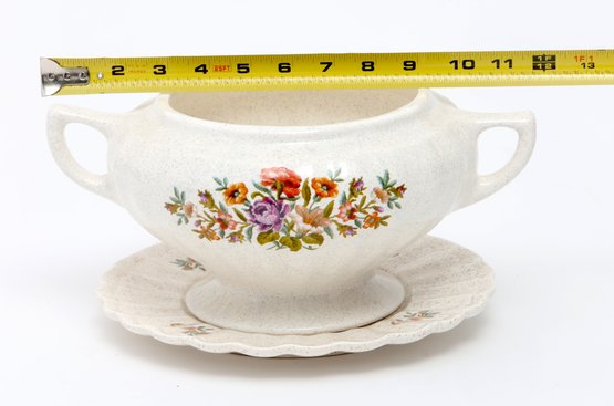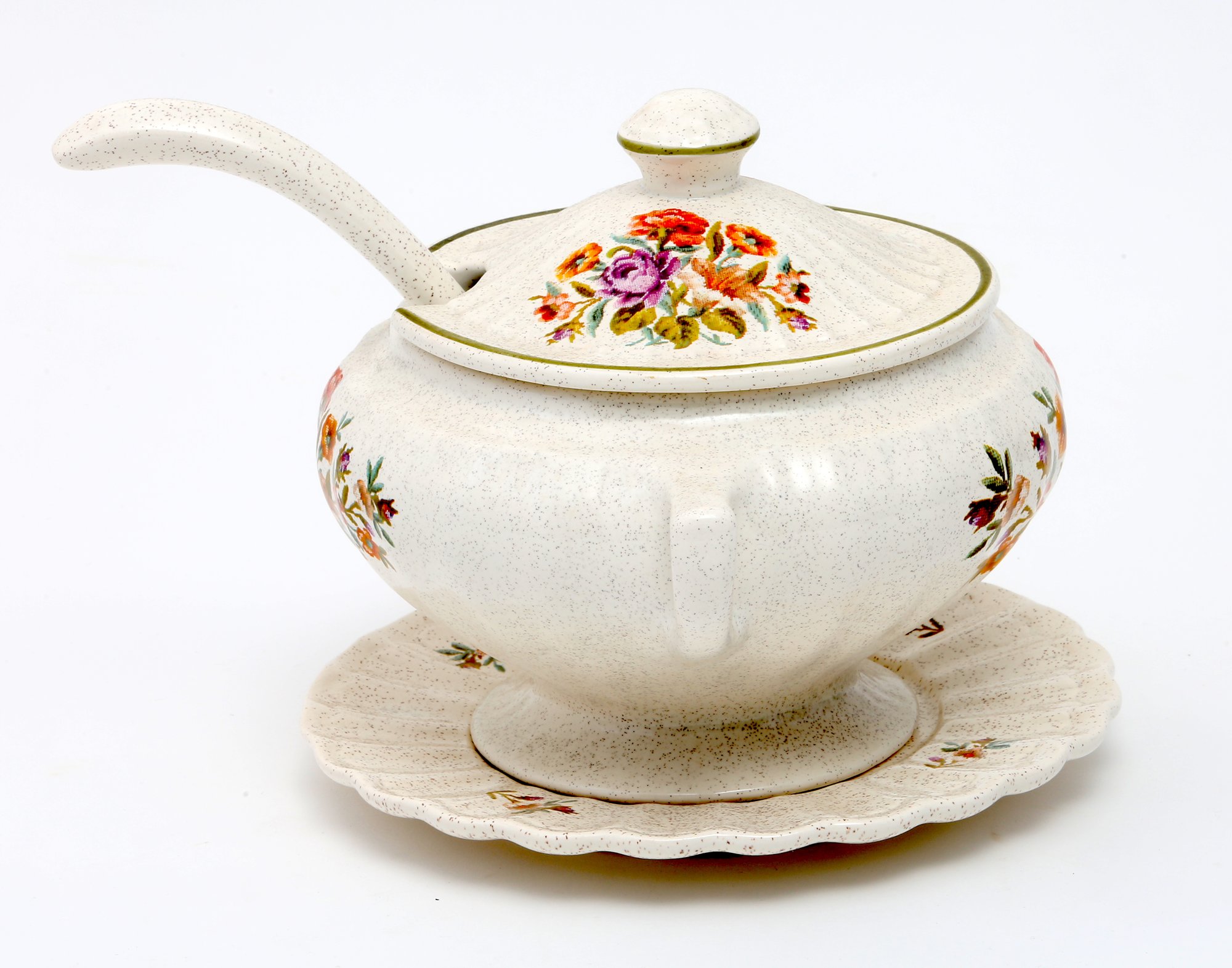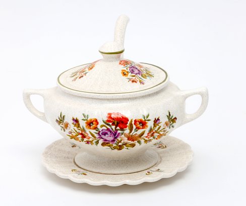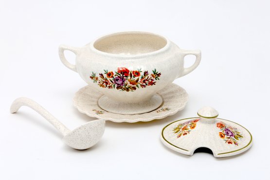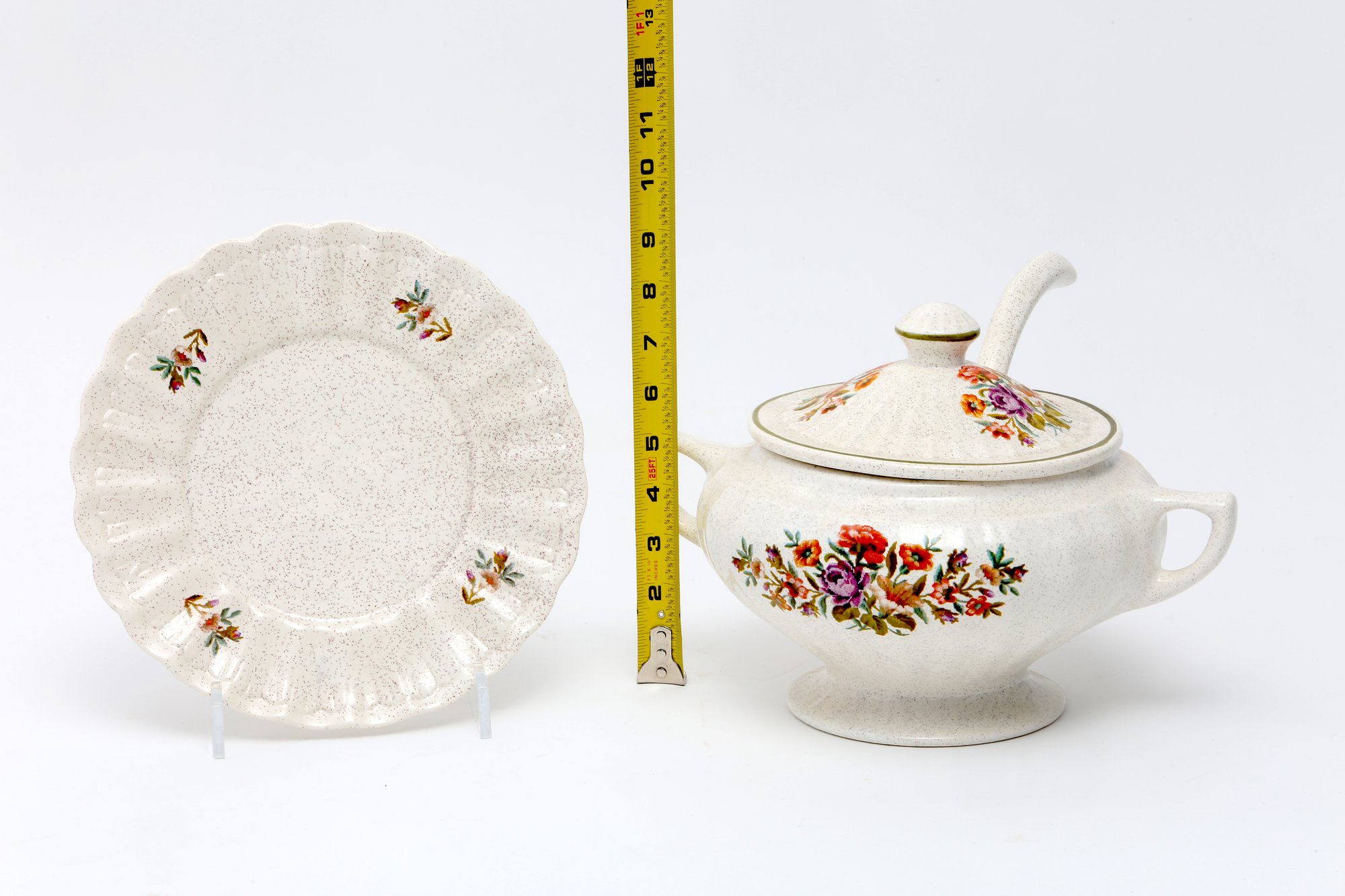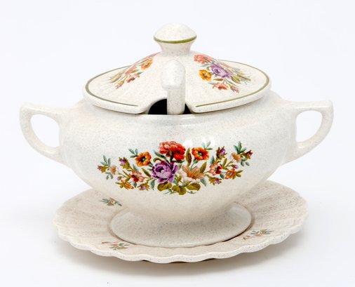 Vintage California Pottery Speckled Floral Soup Tureen & Ladle