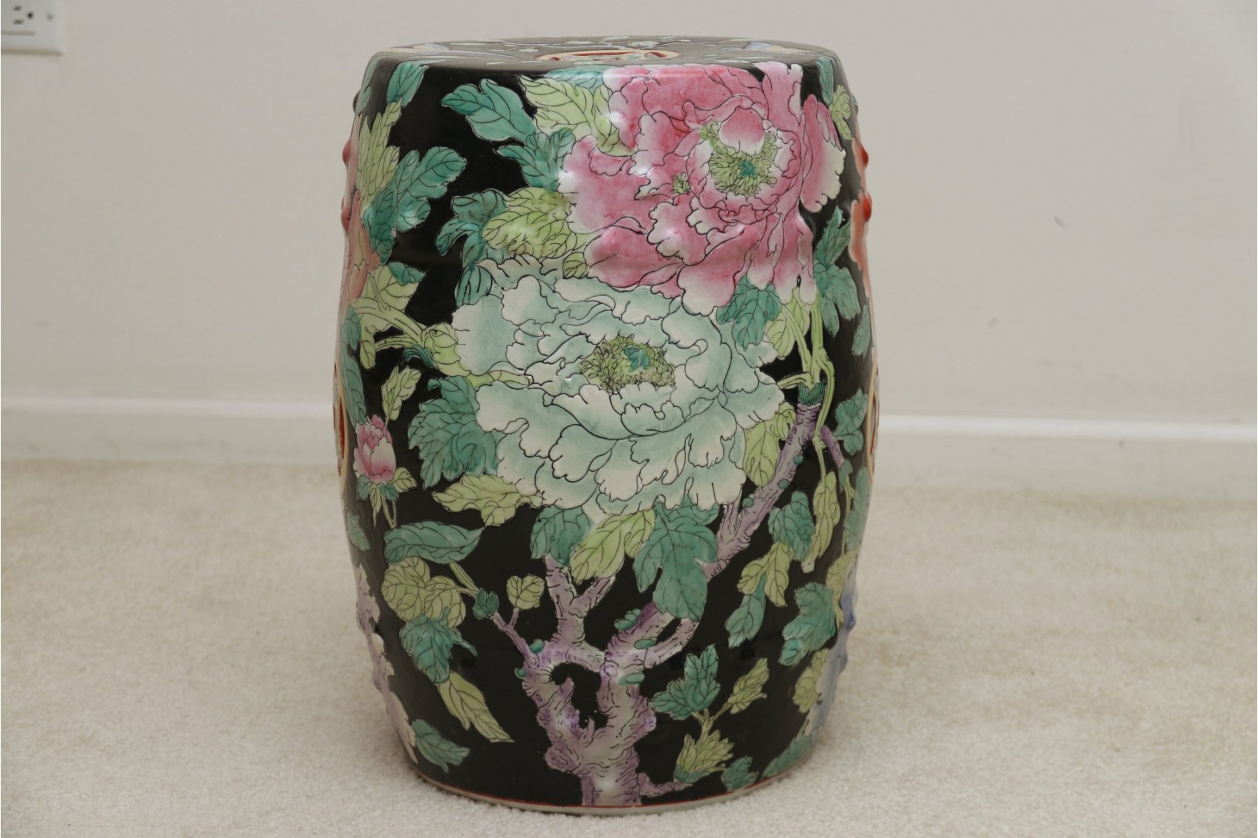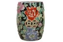 The stool has a colorful pair of flying birds on the top seat area with a yellow circular pierced medallion in the center. There are also two concentric pierced yellow medallions on each side of the stool. The stool is surrounded completely in a vast array of colorful Peony flowers that include: pink, yellow, bright orange, yellow, lavender and light green