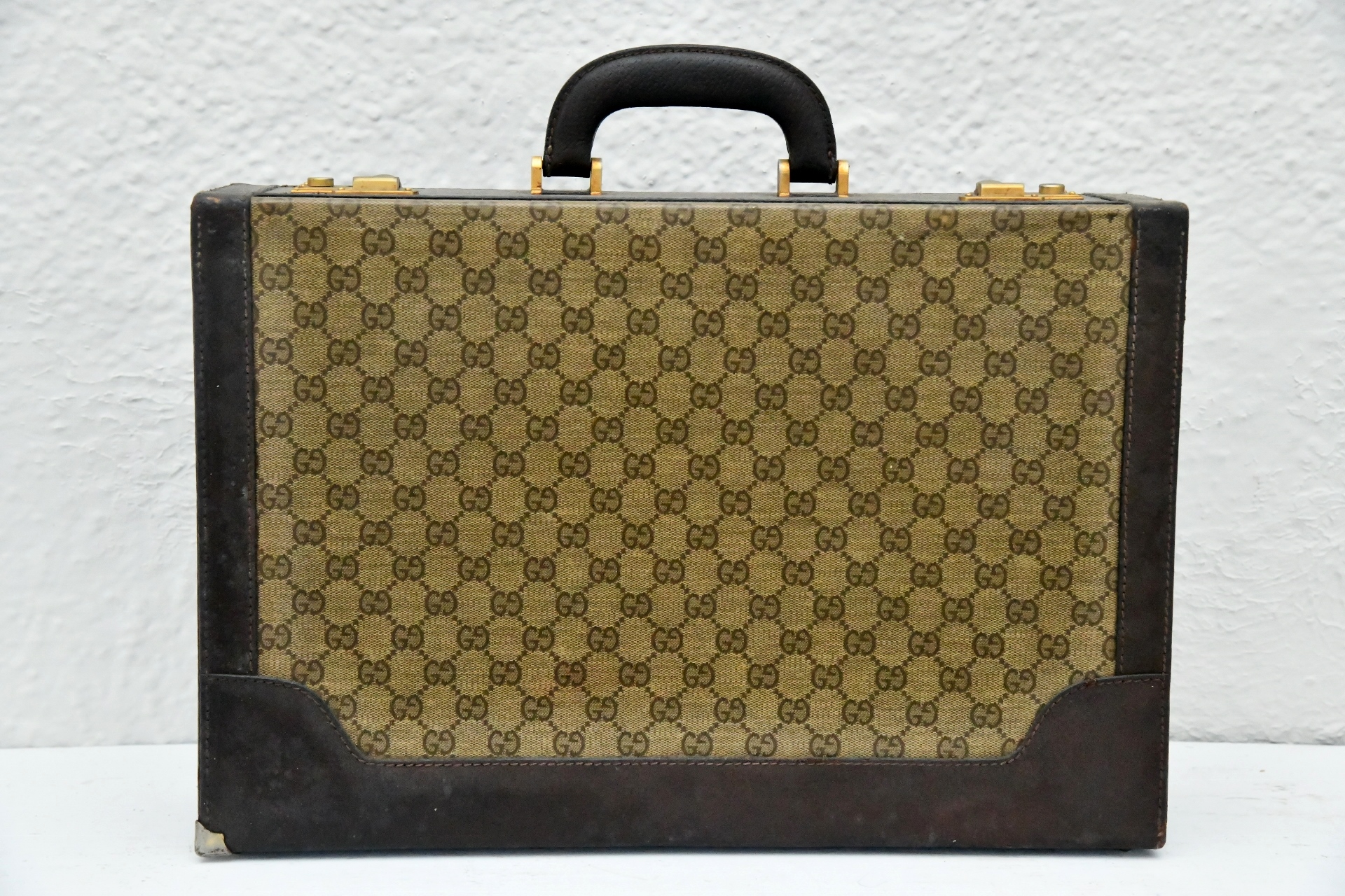 Showcase your style with the Gucci monogrammed Brown Leather Attache. This classic hard briefcase is made of smooth brown leather that's been embossed with GG monograms, creating a unique statement. The spacious interior opens to reveal a pocket and slots for a laptop, phone and other items you need to carry on the go.
