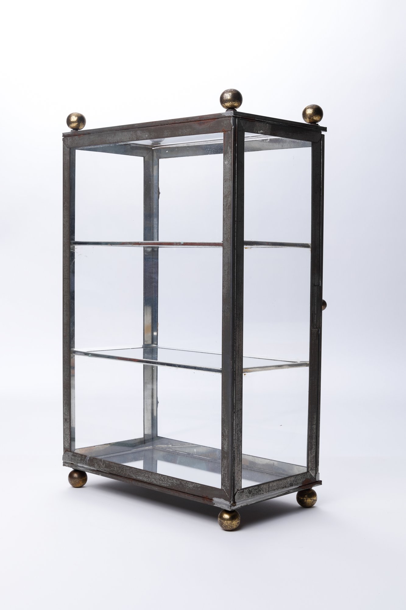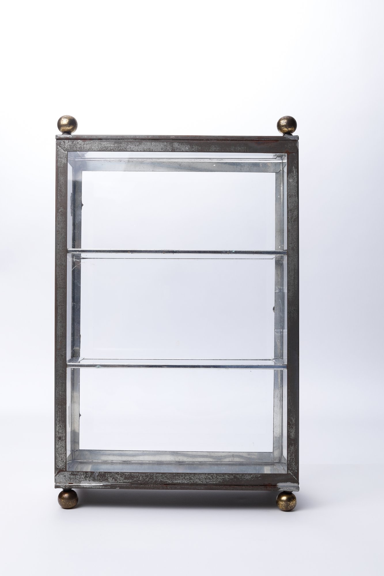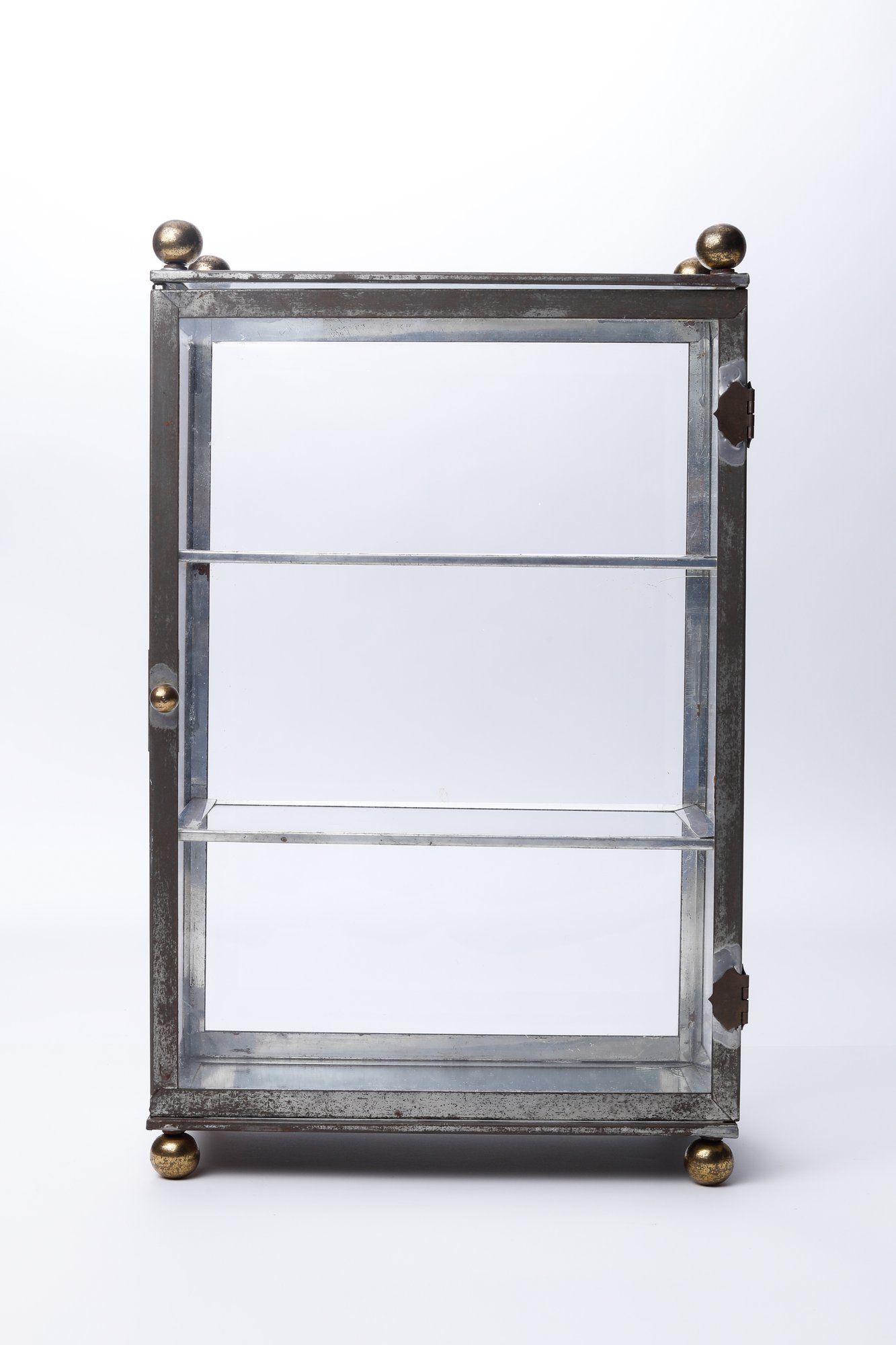 A vintage curio cabinet with a metal frame and three glass shelves. This small, rectangular cabinet features a glass door, ball feet, and a ball finial at each of the upper corners. It appears handmade, displaying clear marks of soldering- measures 10 x 5.5 x 16
