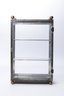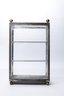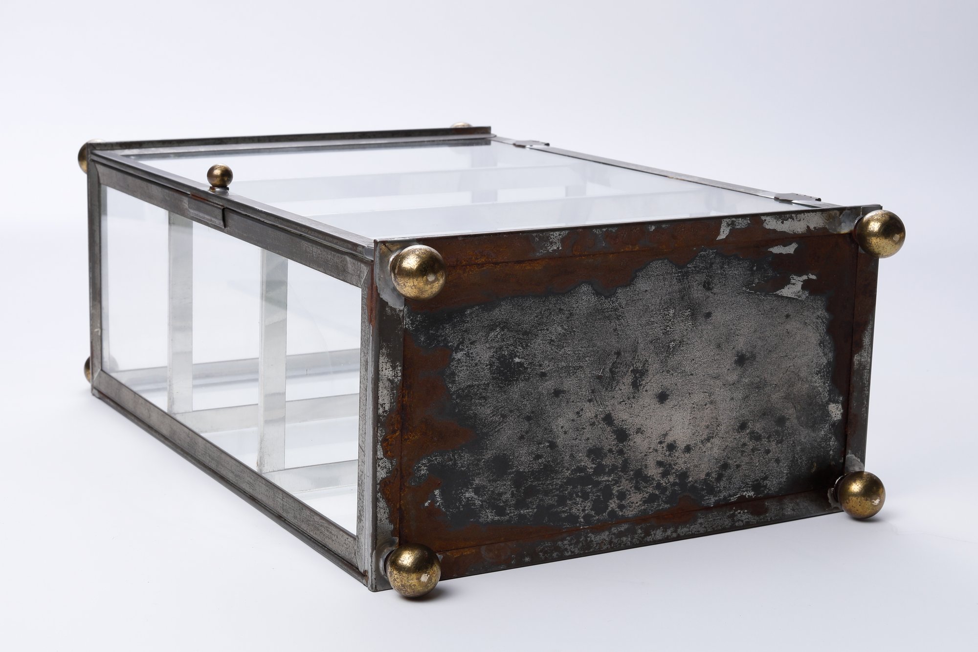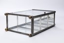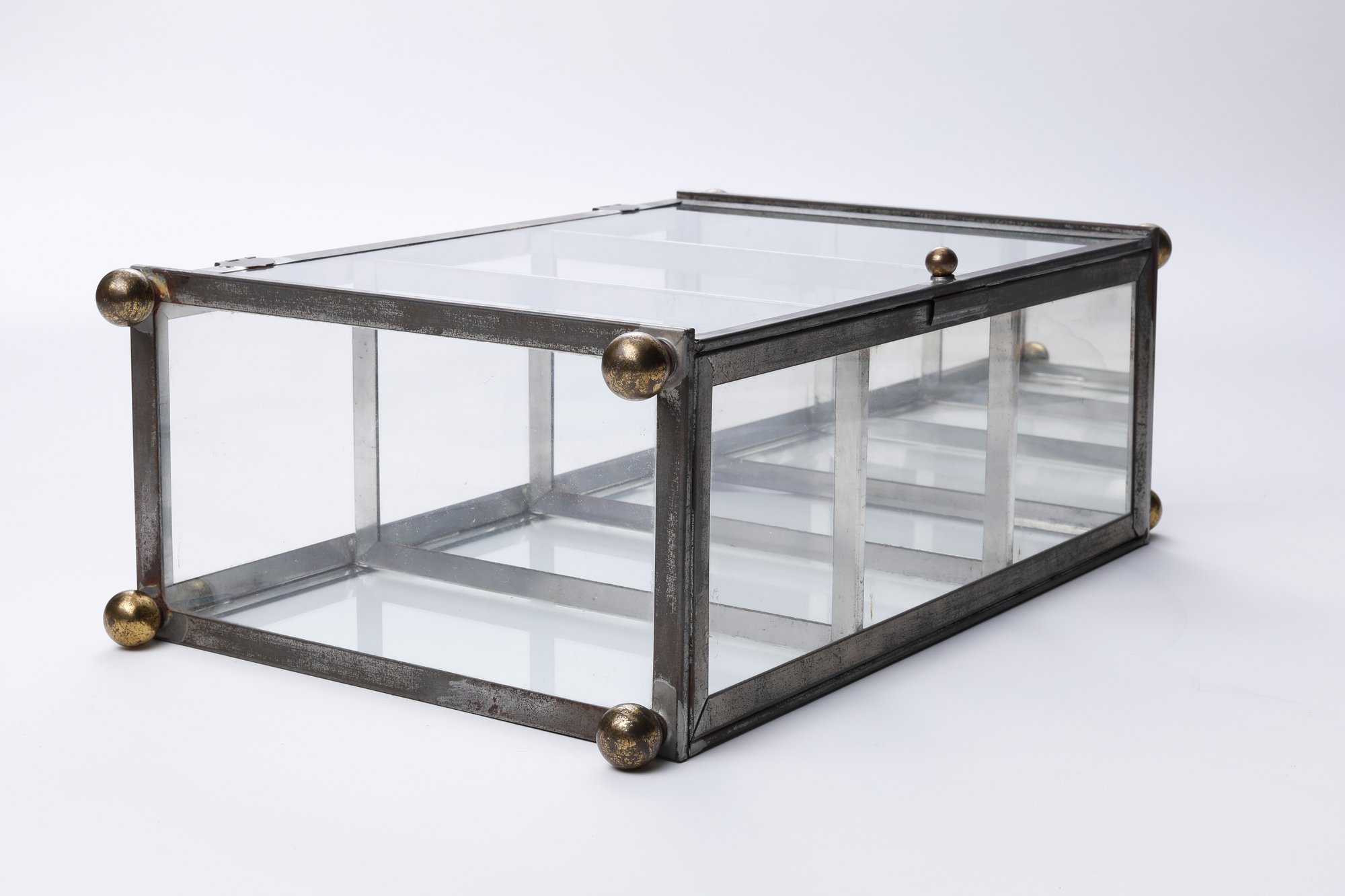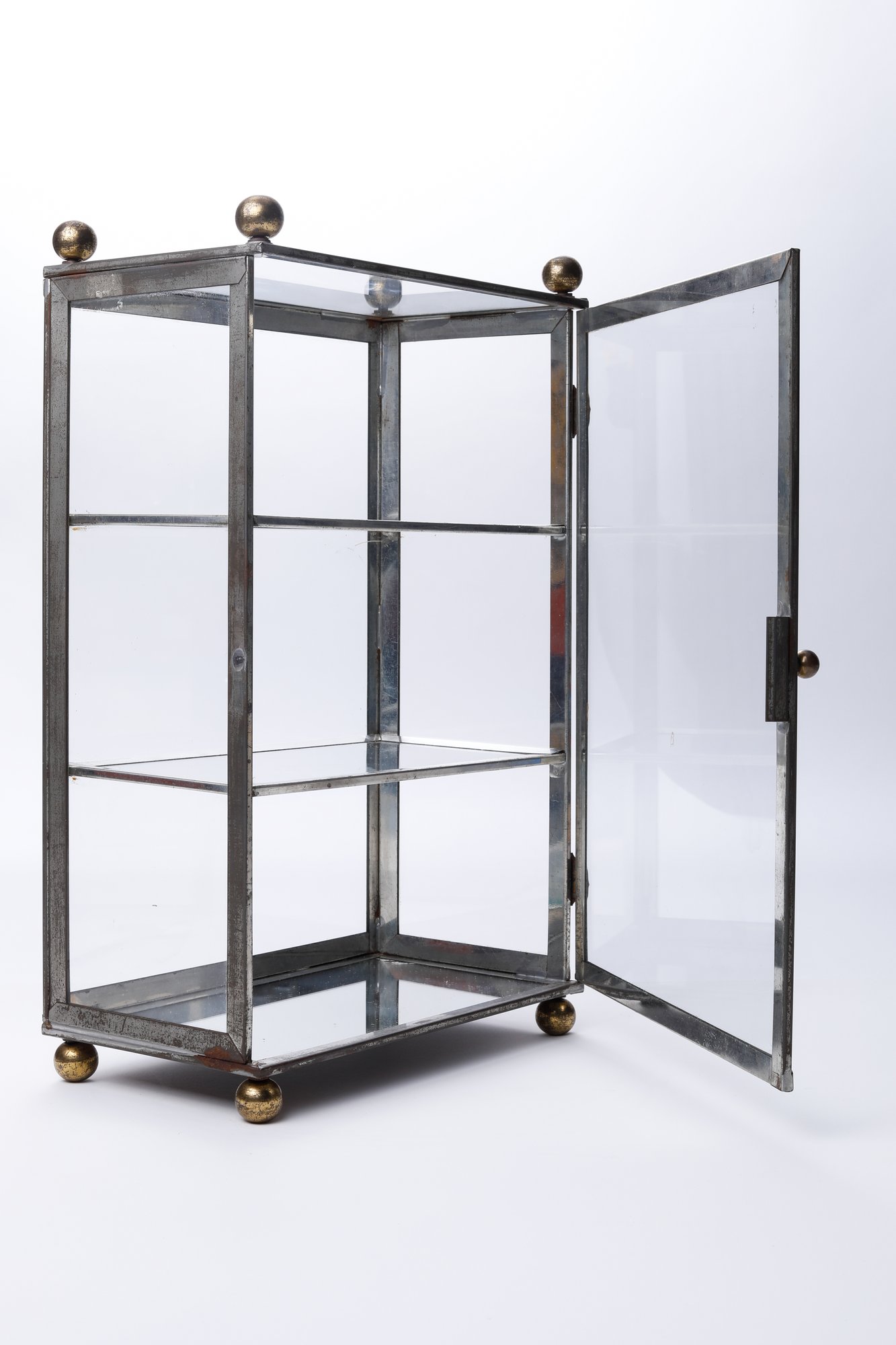 A vintage curio cabinet with a metal frame and three glass shelves. This small, rectangular cabinet features a glass door, ball feet, and a ball finial at each of the upper corners. It appears handmade, displaying clear marks of soldering- measures 10 x 5.5 x 16