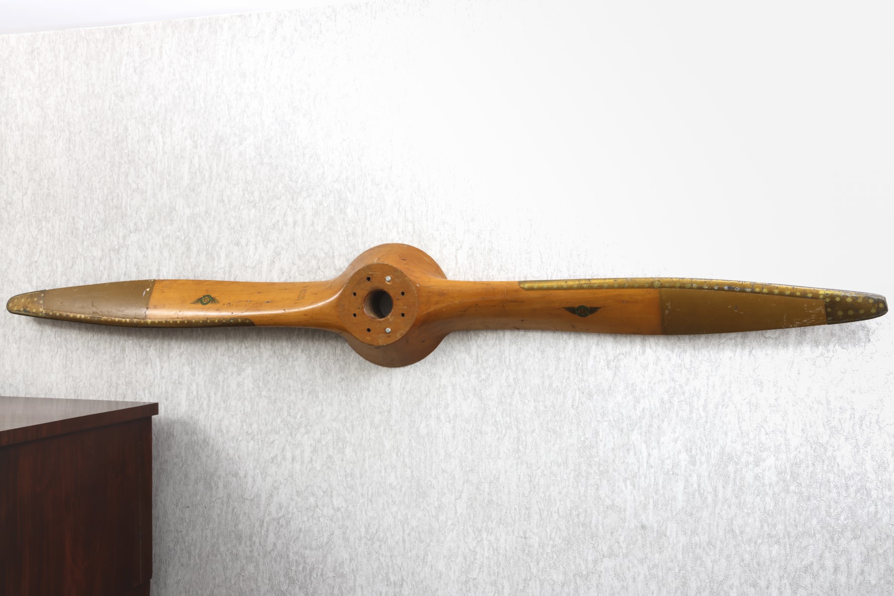 Original Item. Brass trimmed leading edges. This is a beautiful, WW 2 manufactured unrestored, vintage, original, Sensenich Brothers airplane wooden propeller that measures approximately 88 inches long.