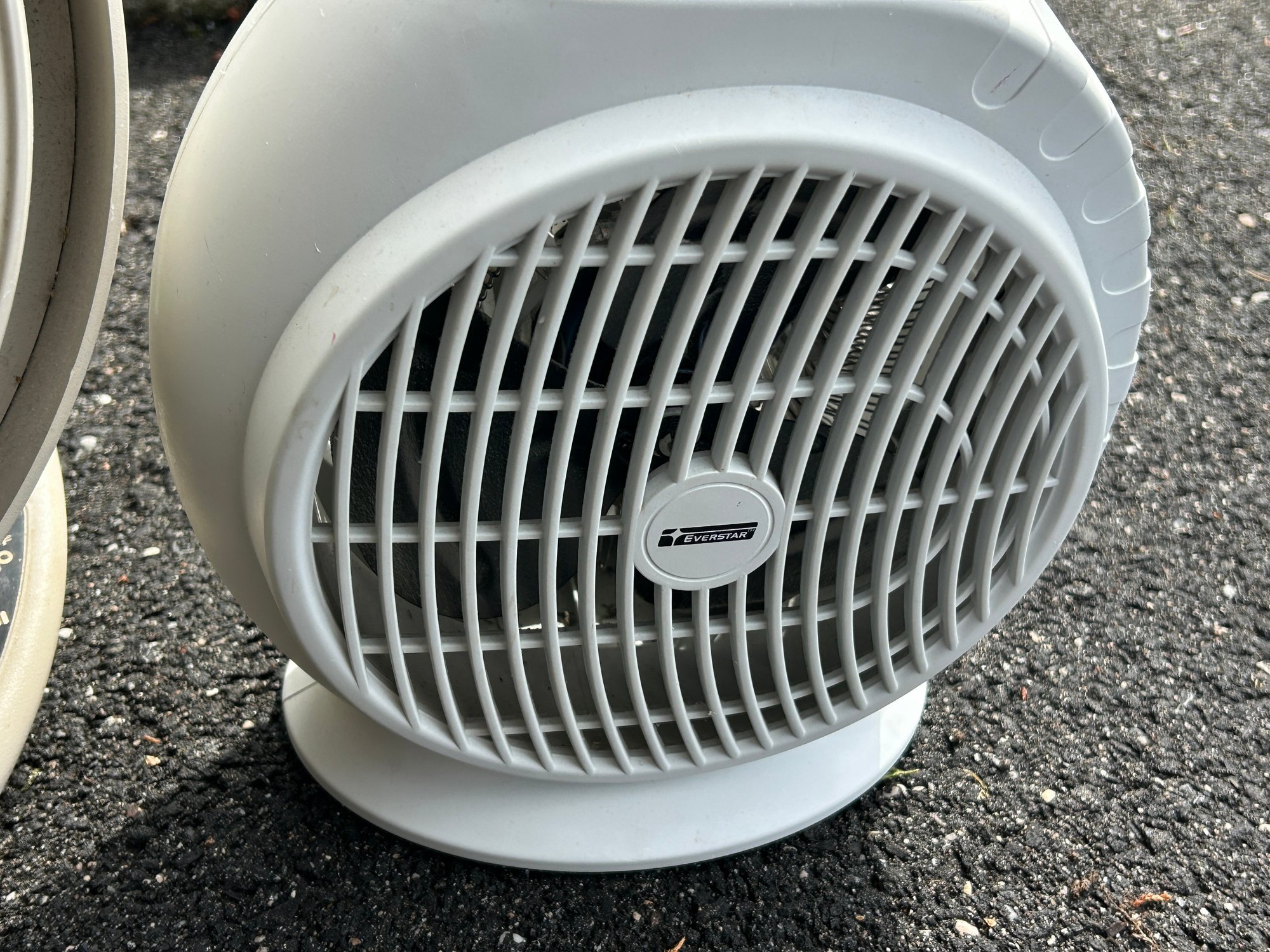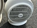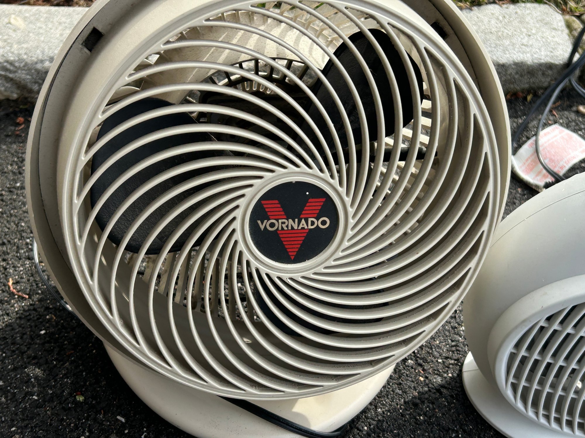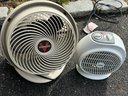 This lot features two functional home appliances: a beige Vornado air circulator fan, characterized by its distinctive swirling grille and central logo, and a smaller, light grey portable space heater with control dials and a safety grille. Both units are made of plastic and include power cords. Review notes mention '8 feet' which does not pertain to these items.