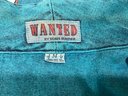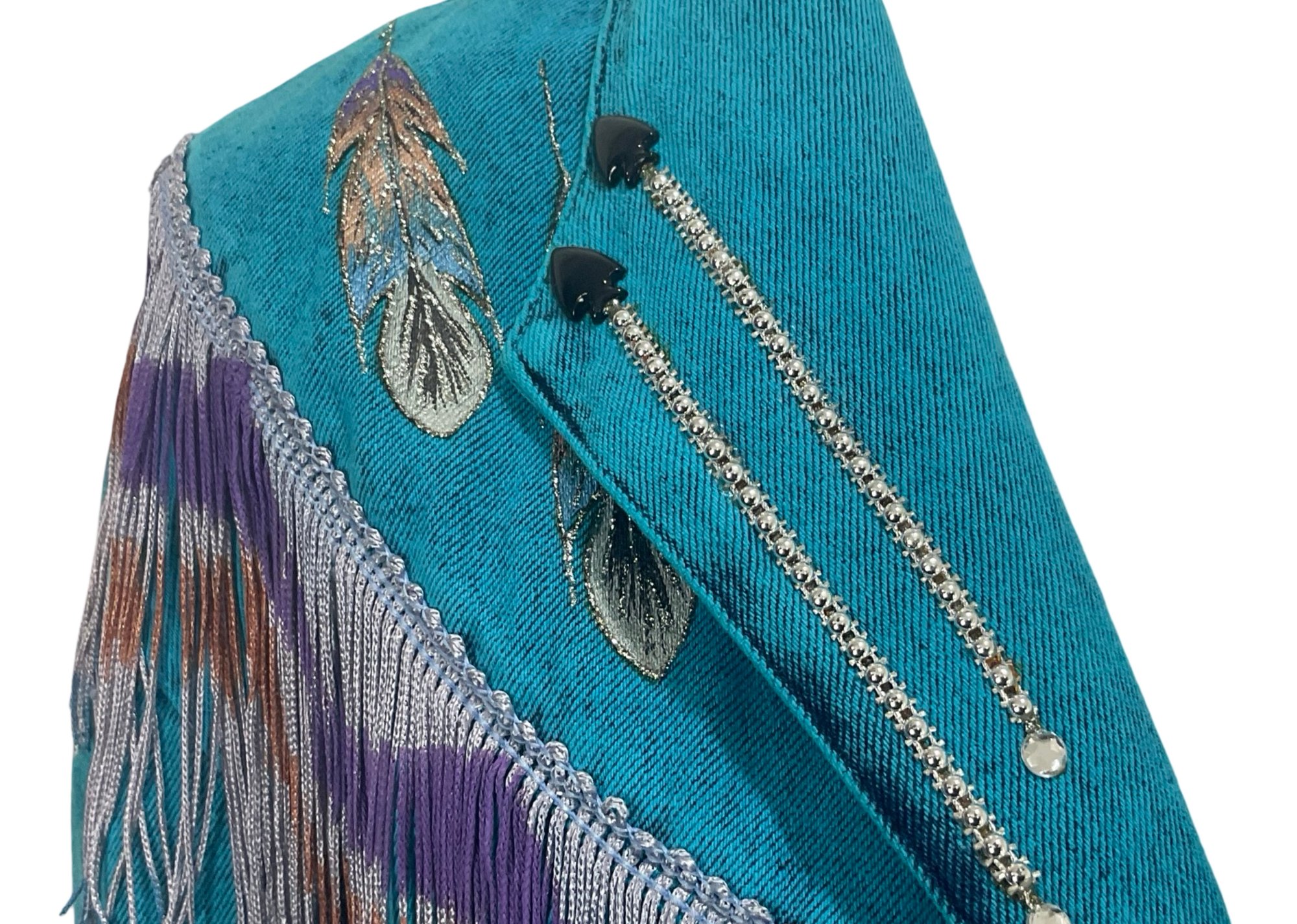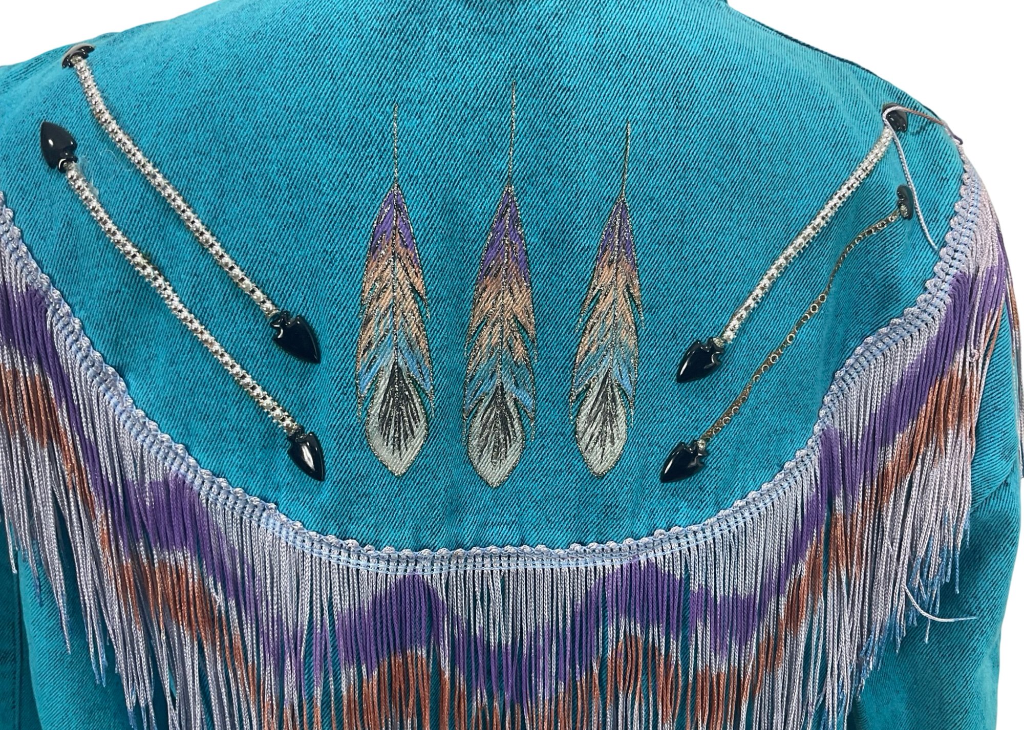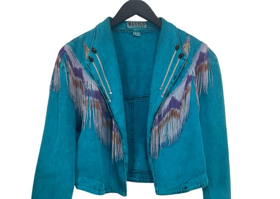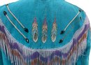 This Southwestern-style jacket is beaded, glittery, painted, and has fringe. It is an open front, medium size, with a 19-inch chest width and 19-inch length. It's in good condition.