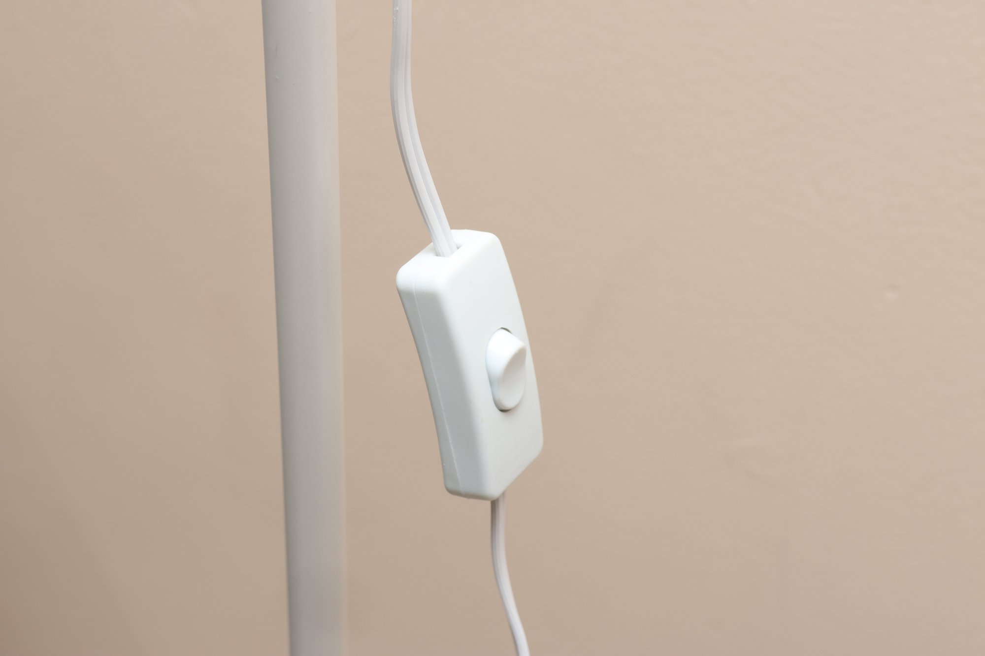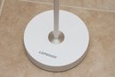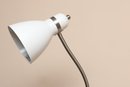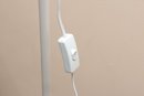 A white floor lamp featuring a flexible gooseneck arm and a cone-shaped metal shade. It has a sturdy round base and an in-line power switch on the cord. The lamp appears to be constructed primarily of painted metal.