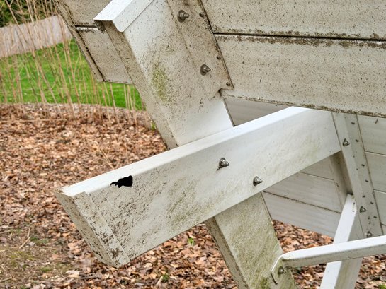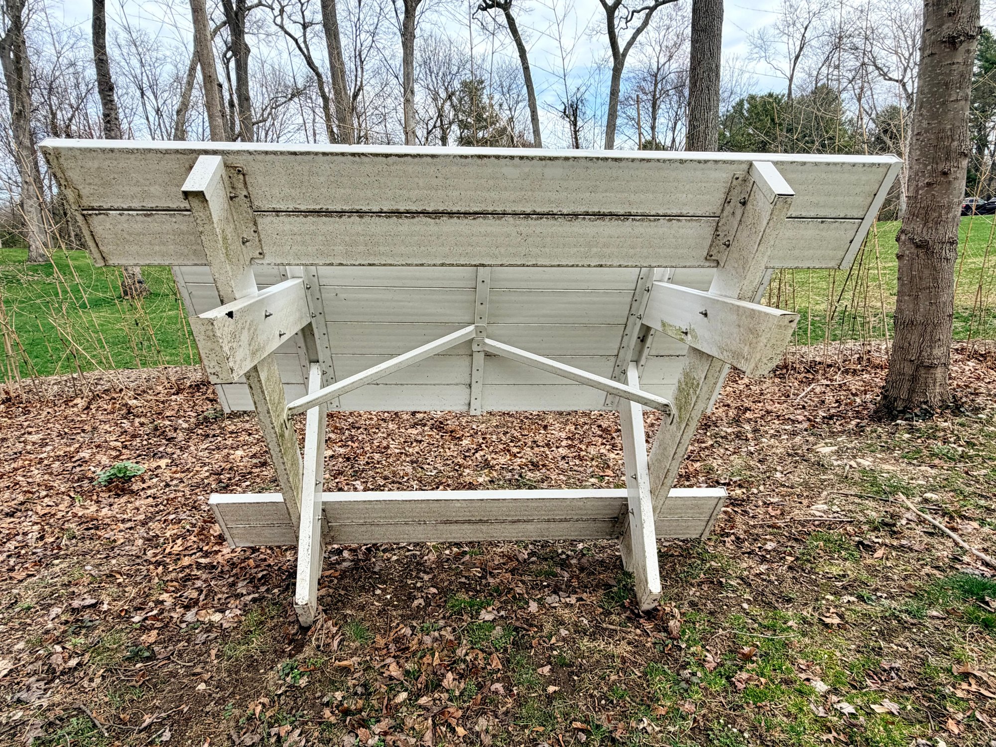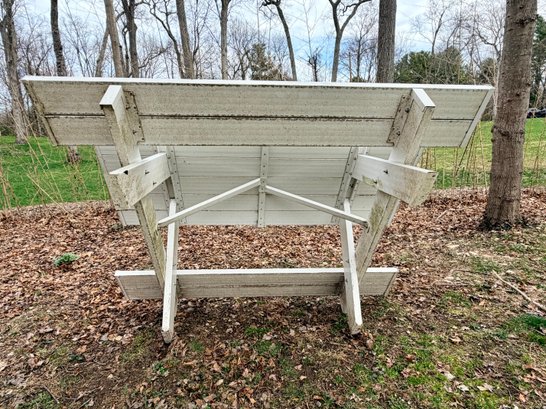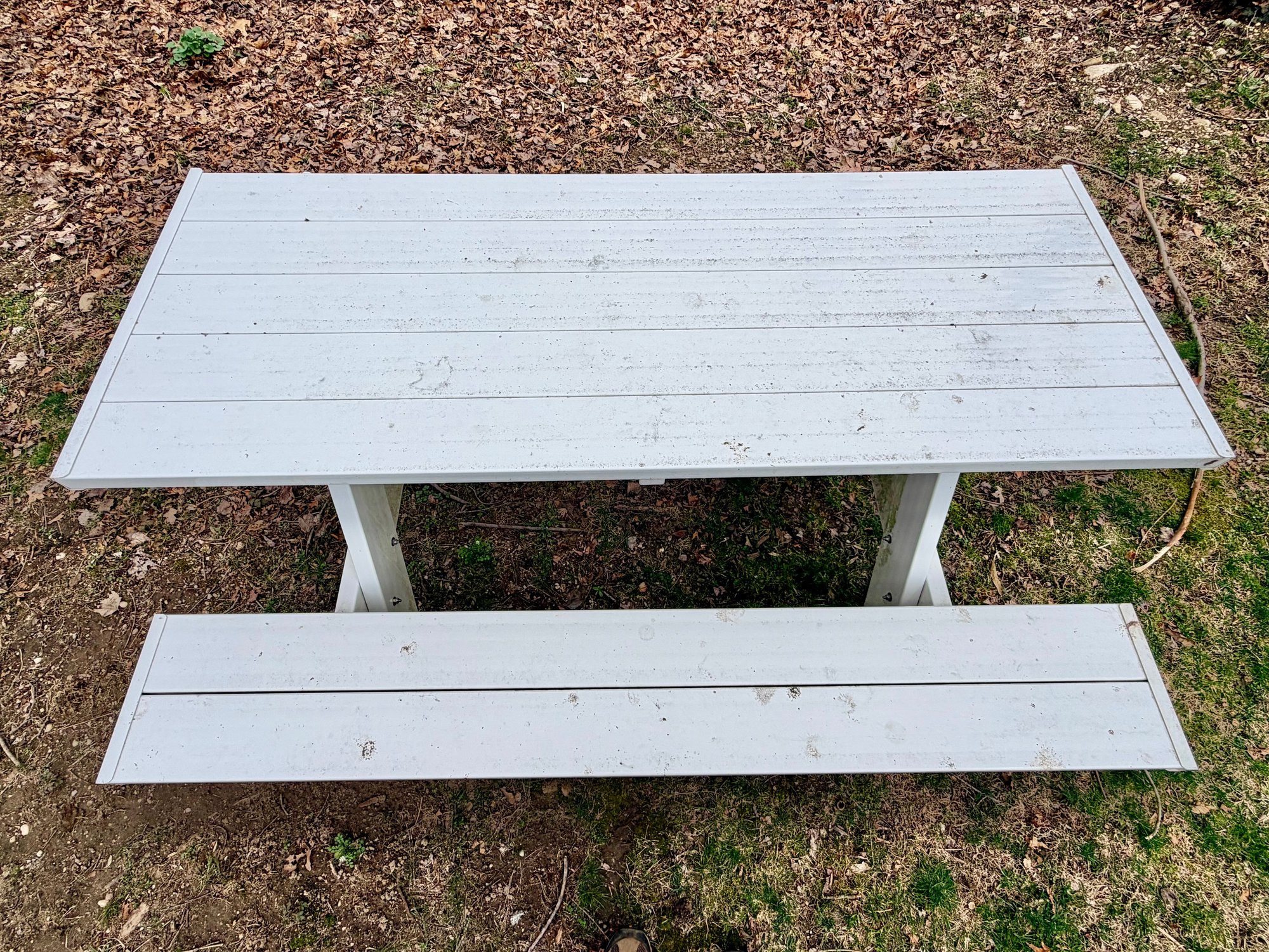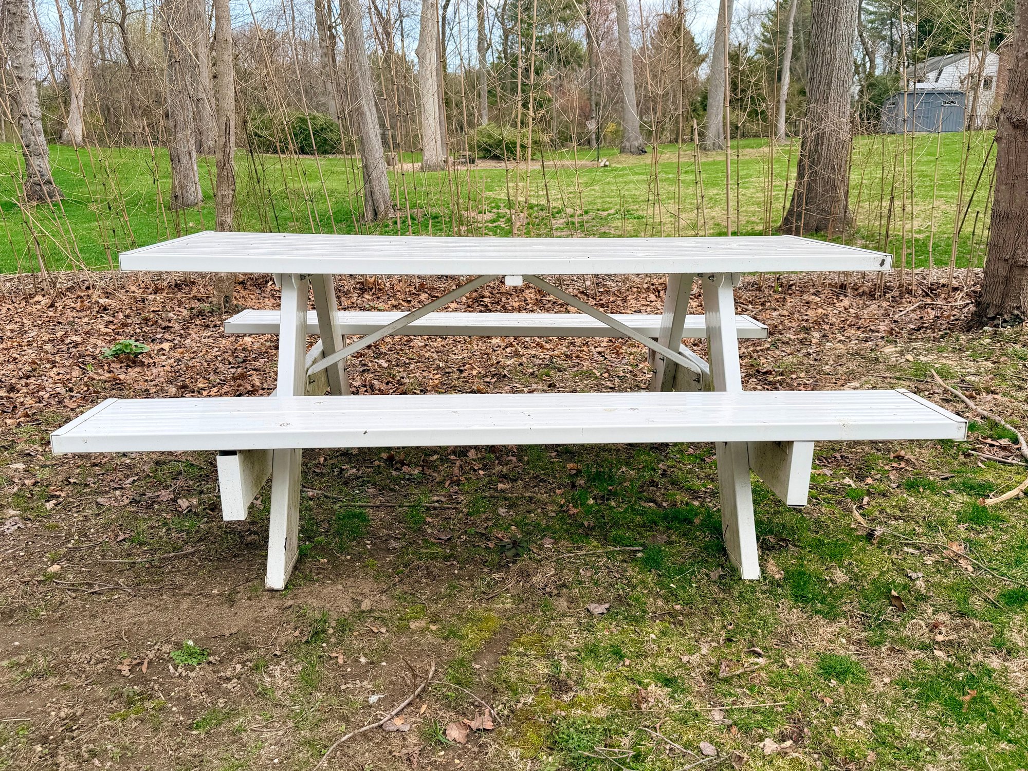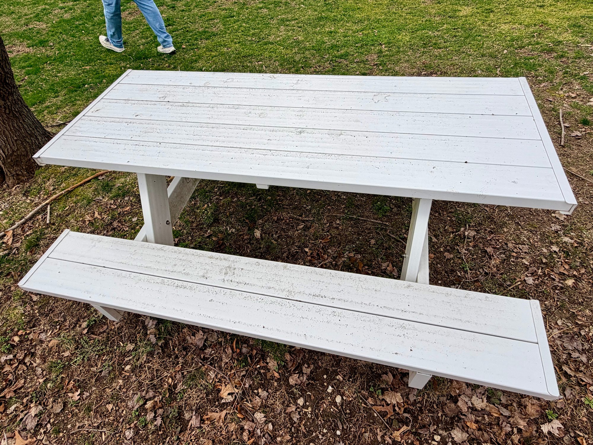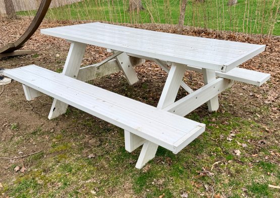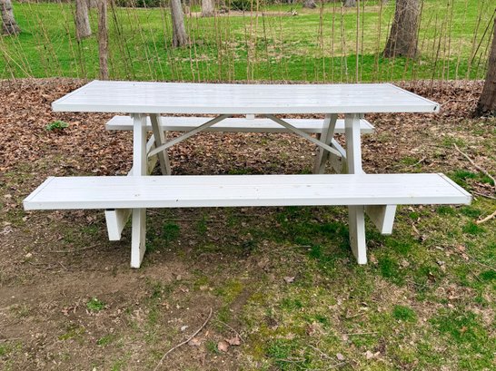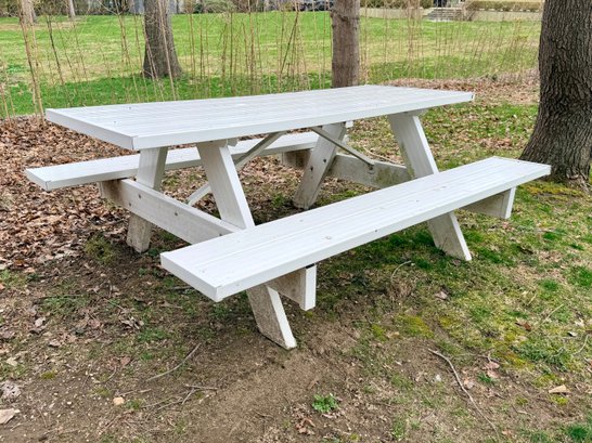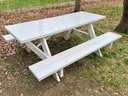 Outdoor picnic table constructed from white PVC or composite material with integrated bench seating on both sides, featuring a slatted tabletop and seats supported by a reinforced A-frame base with cross bracing, designed for durability and low maintenance in outdoor settings such as patios, gardens, or communal areas.