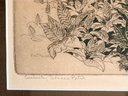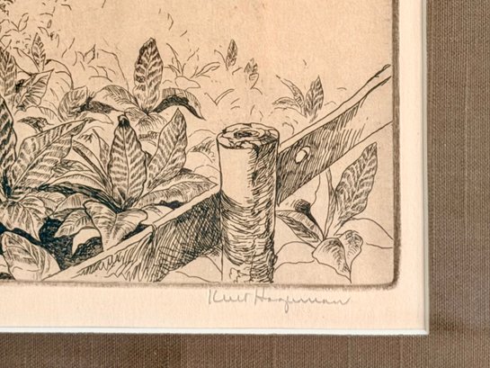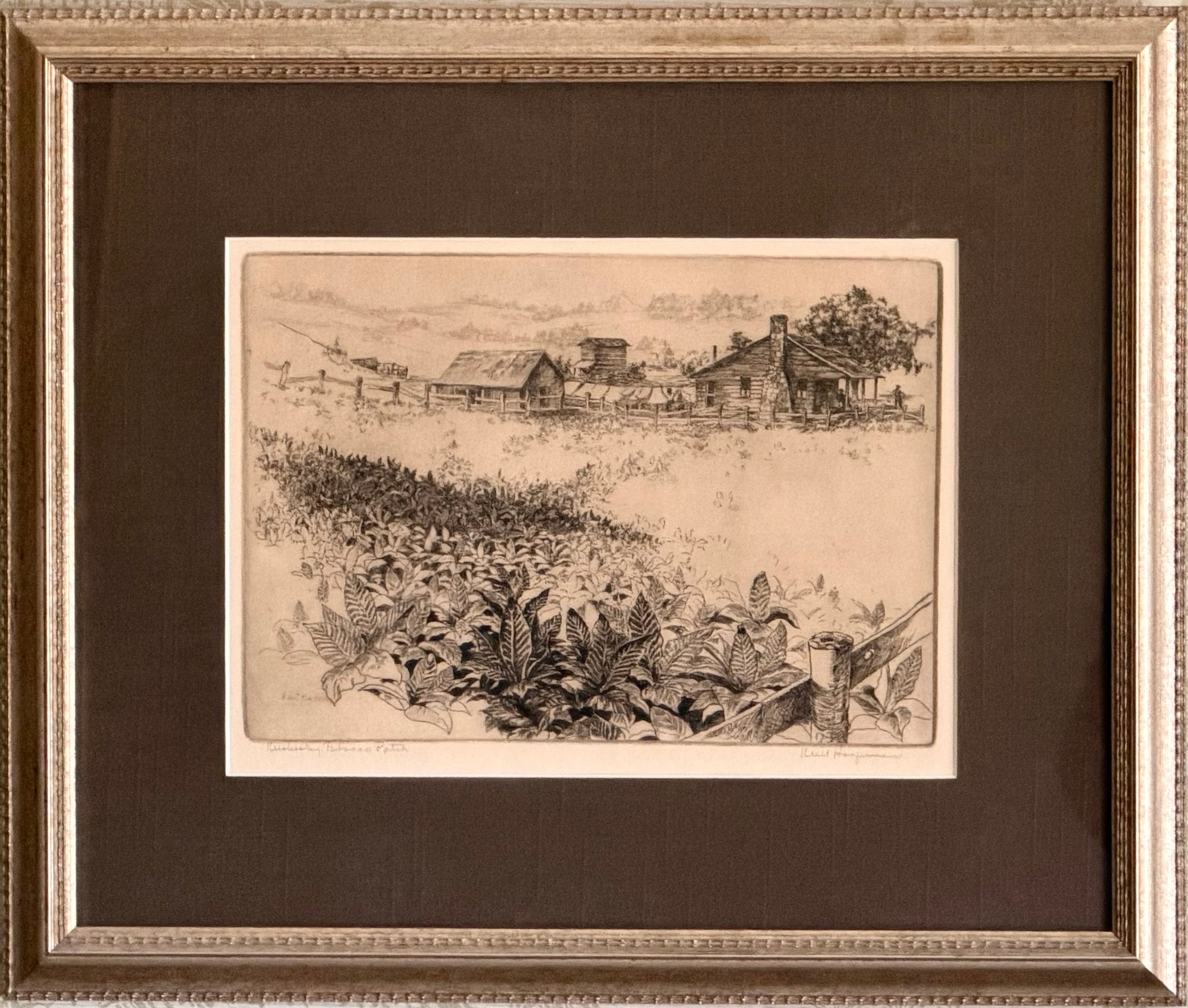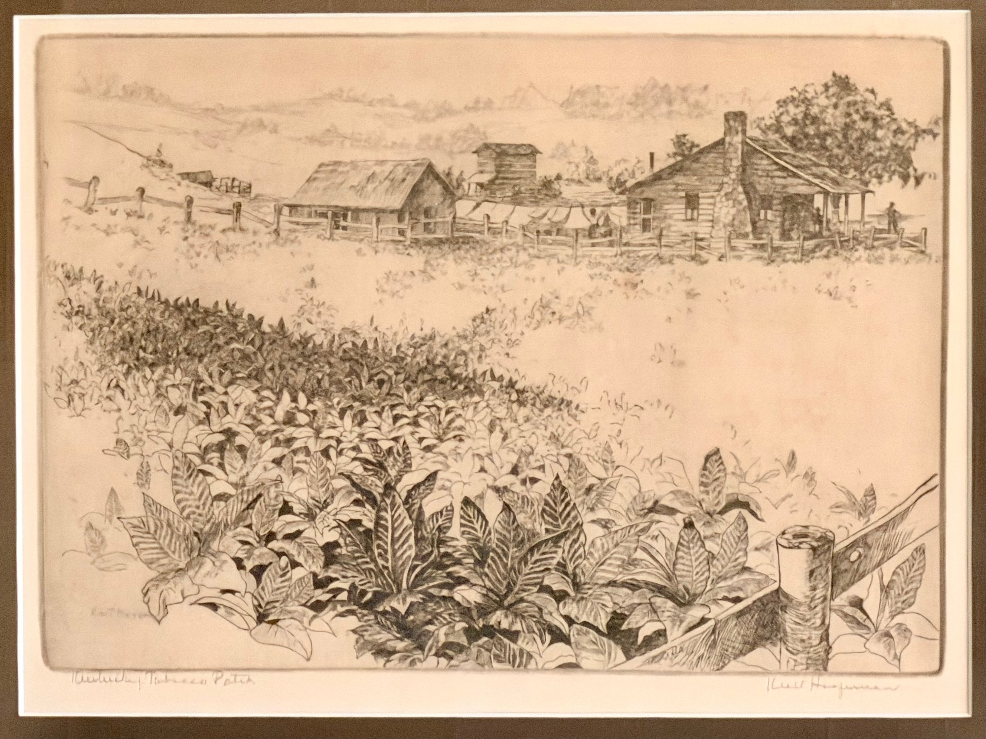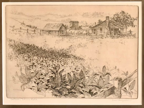 Framed etching depicting a rural farm scene with tobacco fields in the foreground and farmhouse structures in the distance. The composition is rendered in fine linework with detailed vegetation and landscape elements. Titled Kentucky Tobacco Patch and attributed to William K. Hagerman. Pencil signed by the artist.